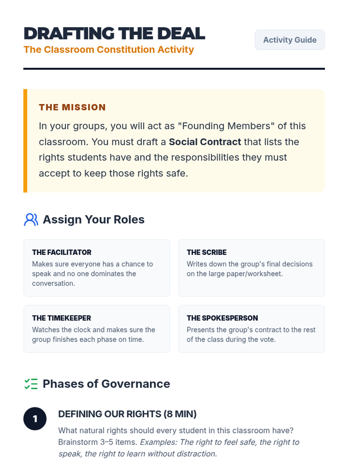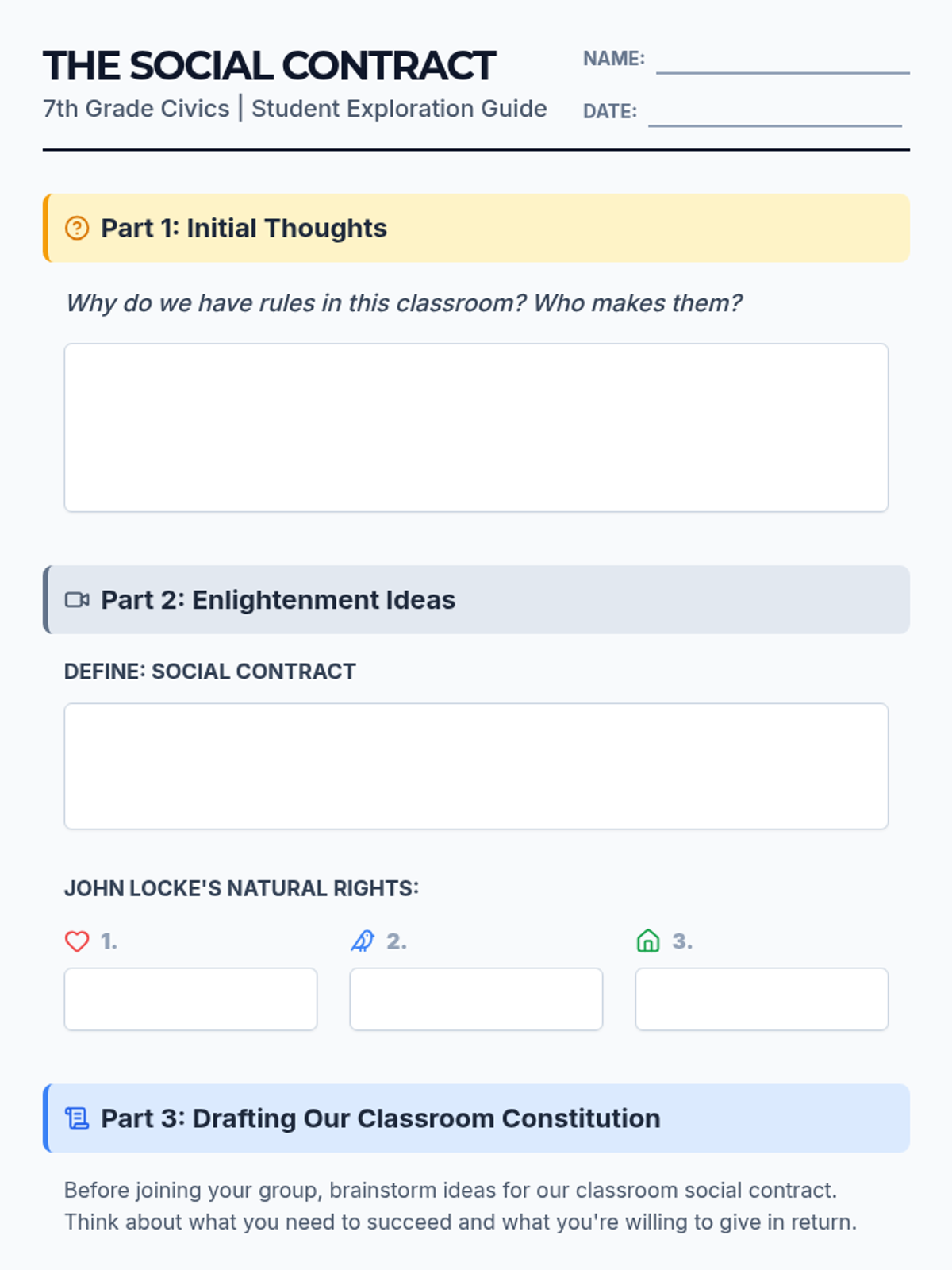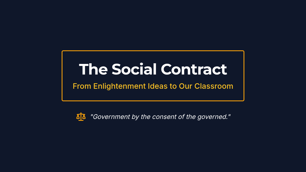 A 7th-grade civics lesson exploring the origins of the social contract through John Locke's Enlightenment theories and applying them to create a functional classroom constitution.