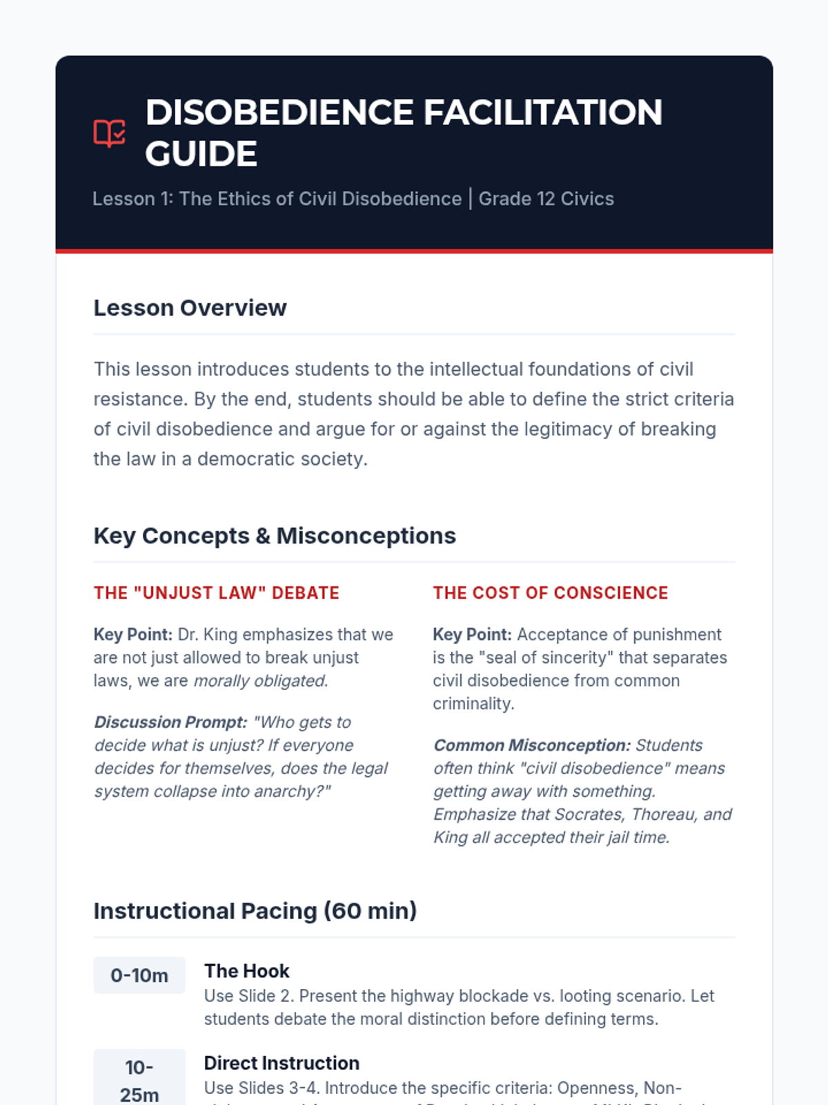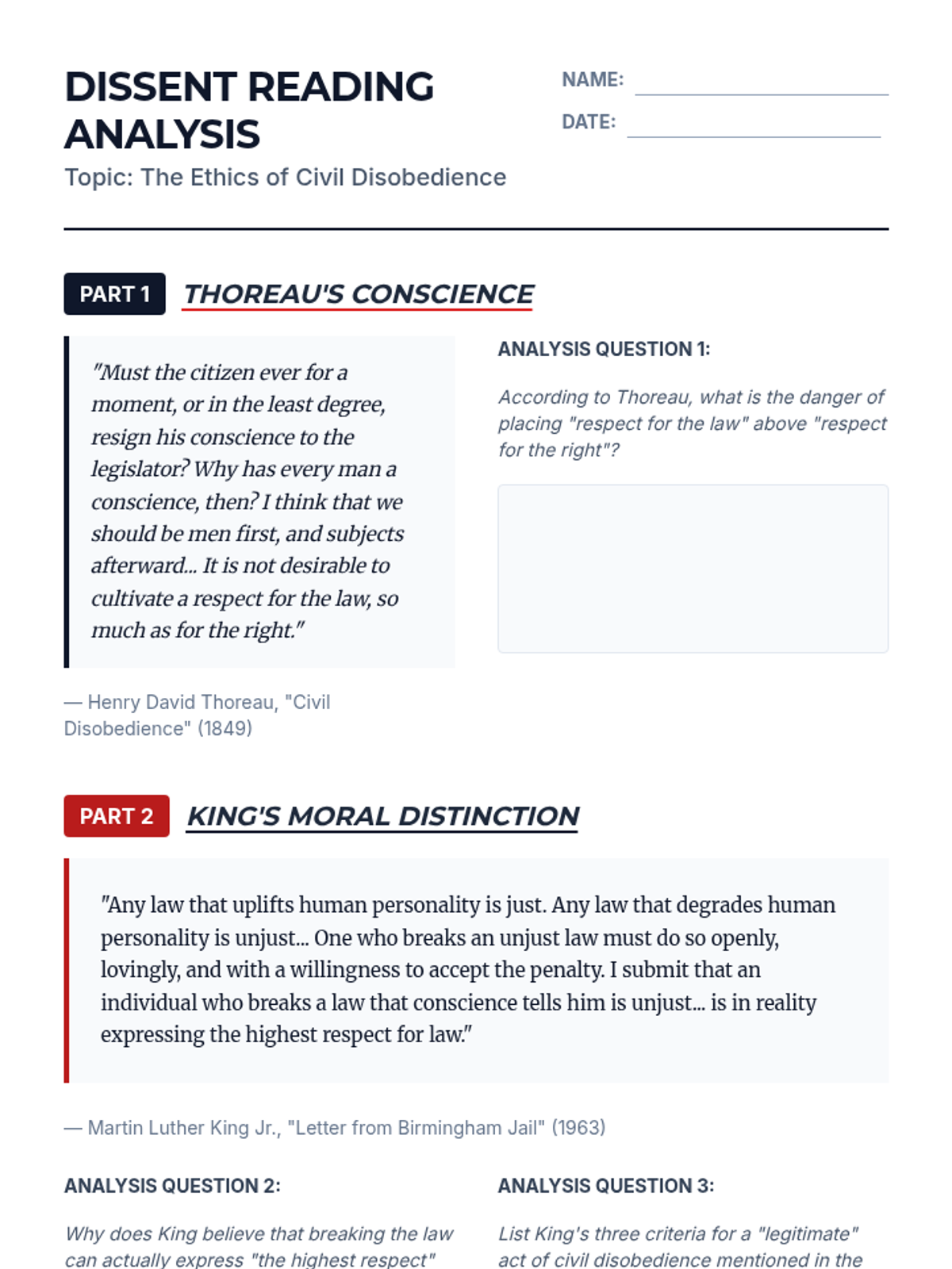 Students analyze the philosophy of civil disobedience through the writings of Henry David Thoreau and Martin Luther King Jr., defining the ethical boundaries of non-violent resistance.