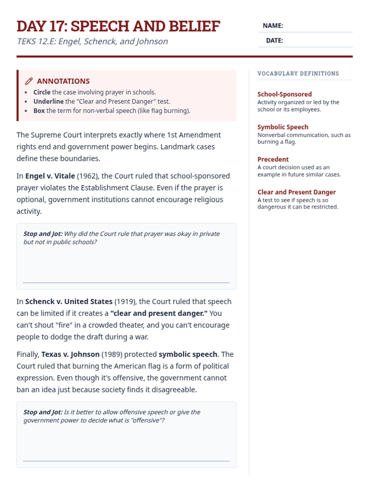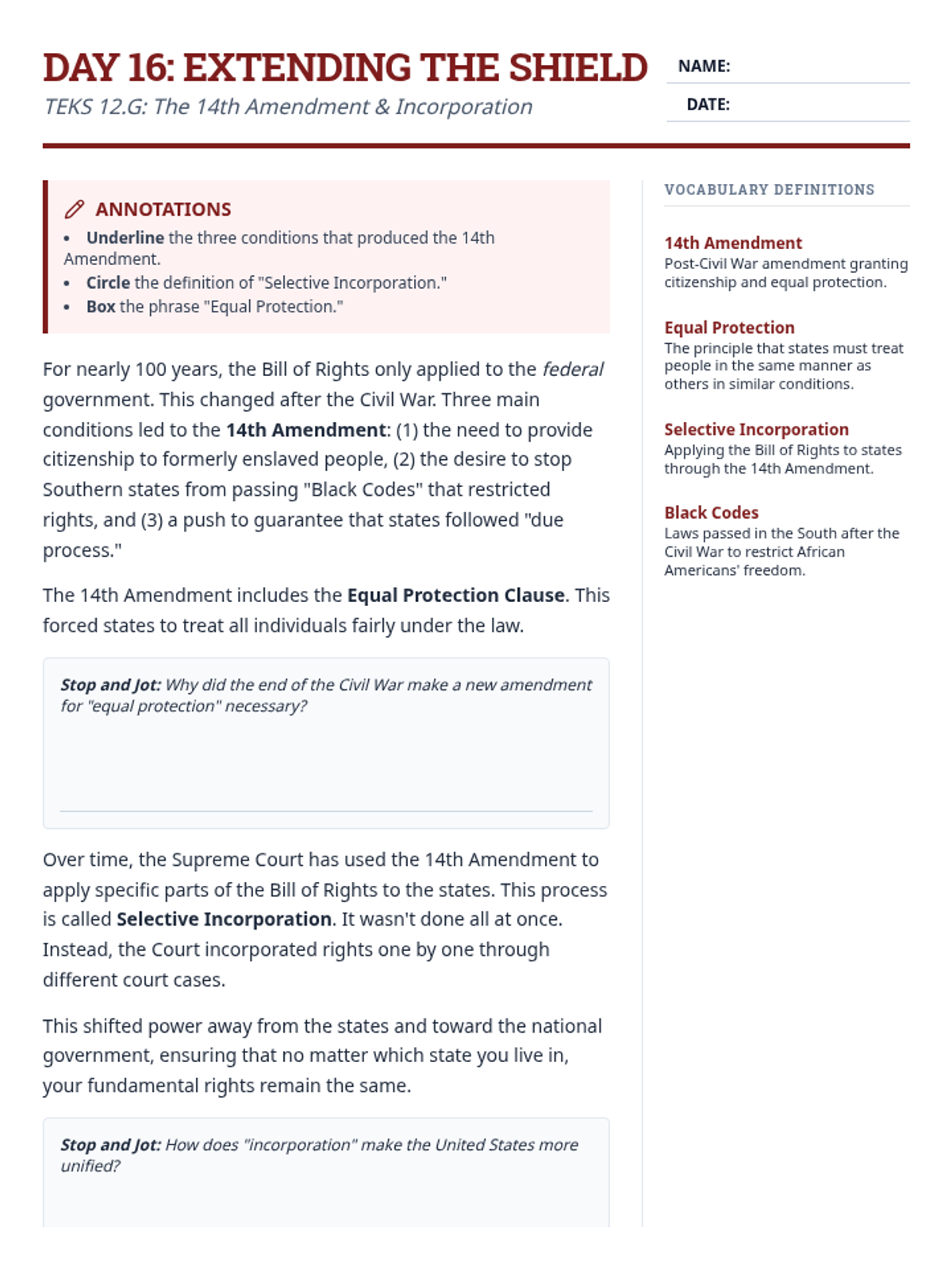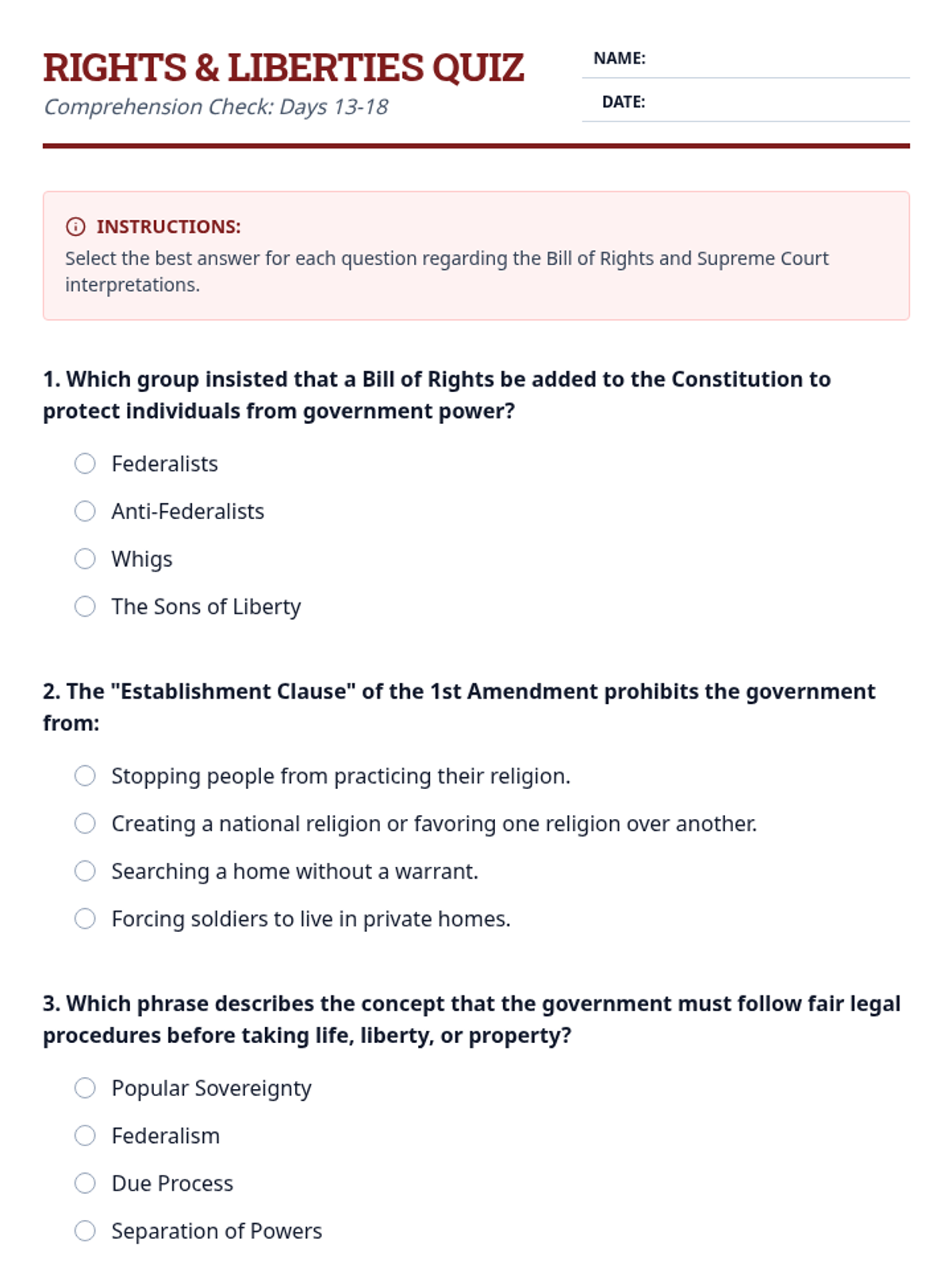 Examines individual rights, religious freedom, landmark Supreme Court cases, and the impact of the 14th Amendment on state government.