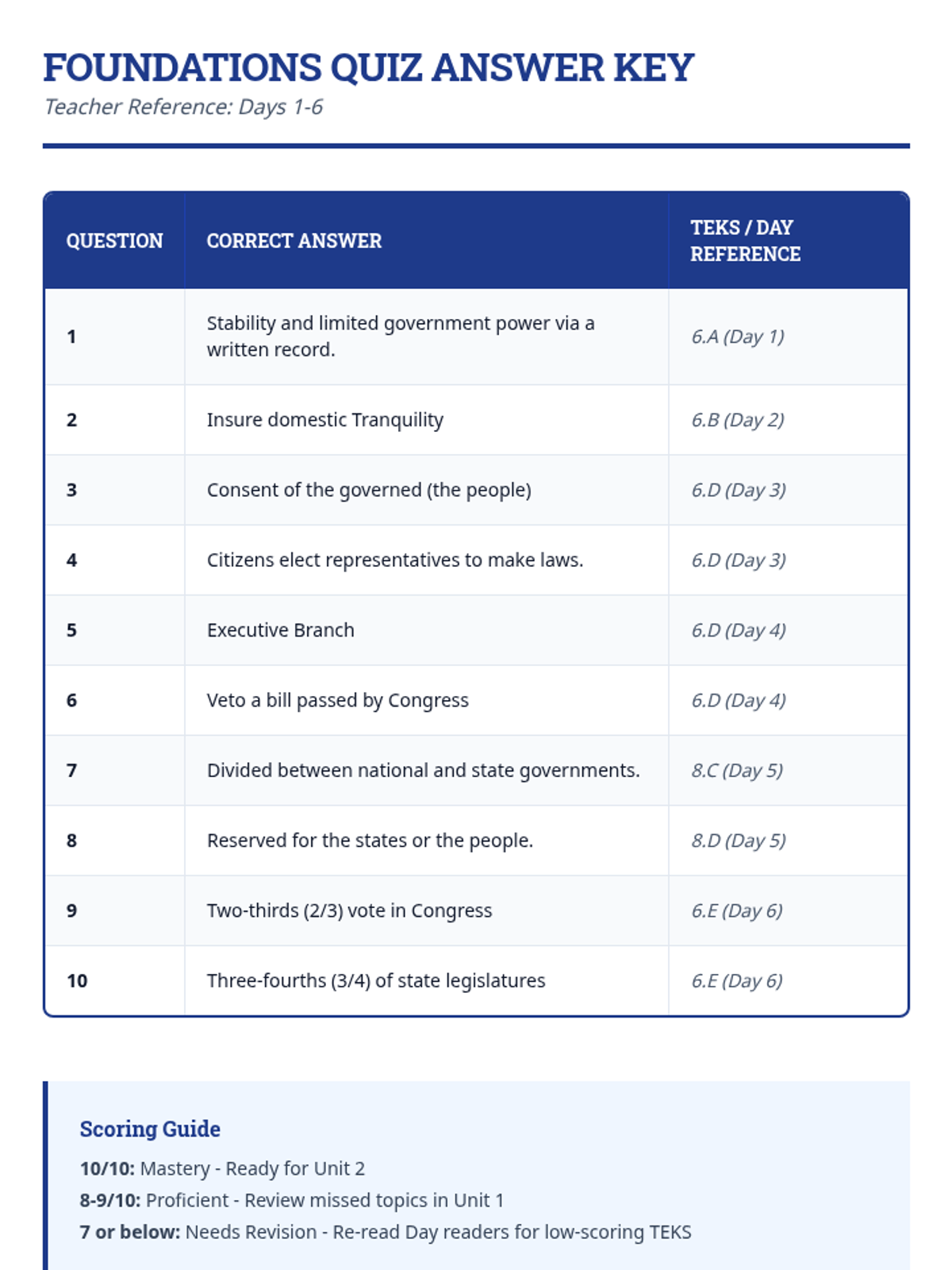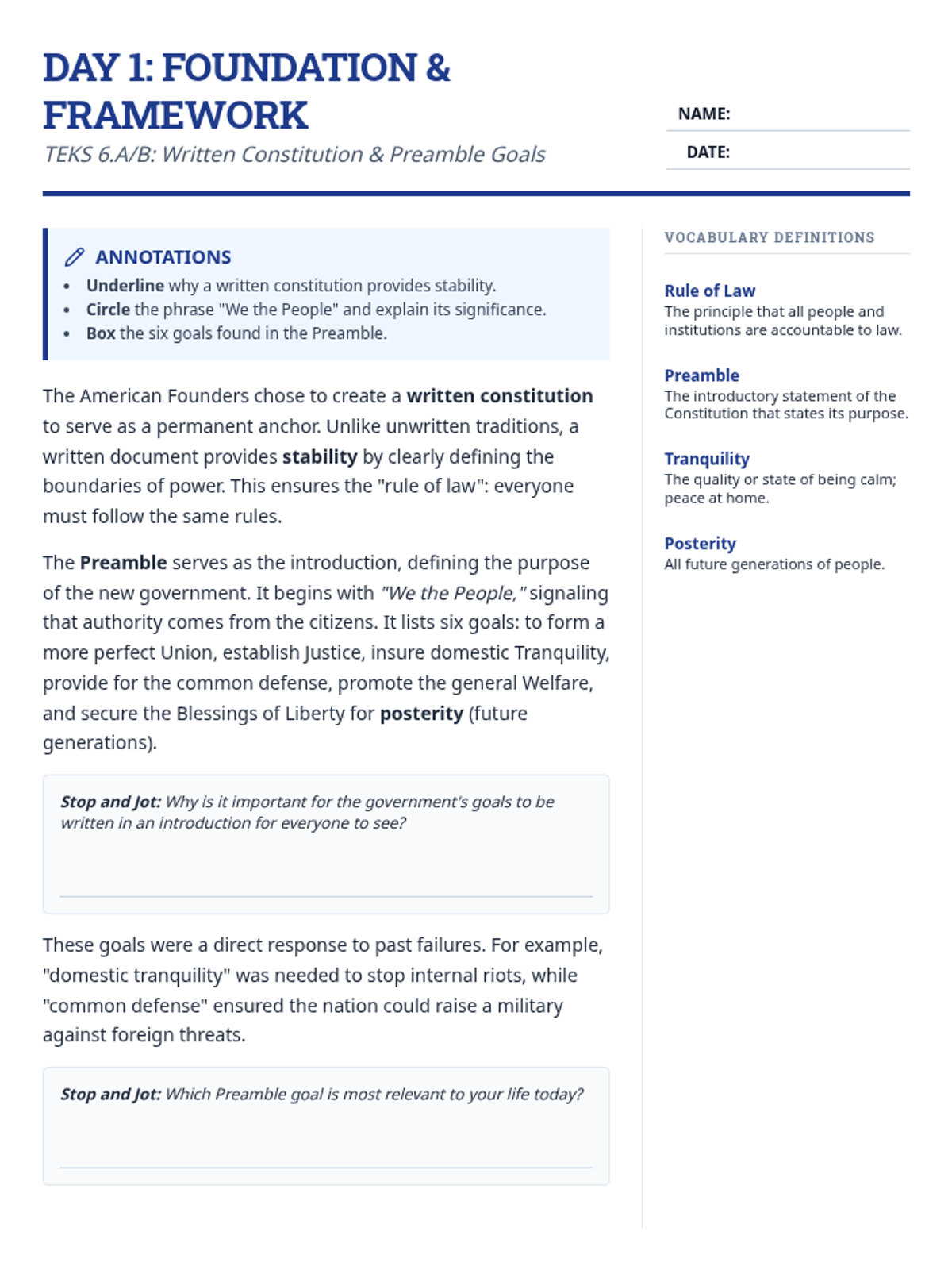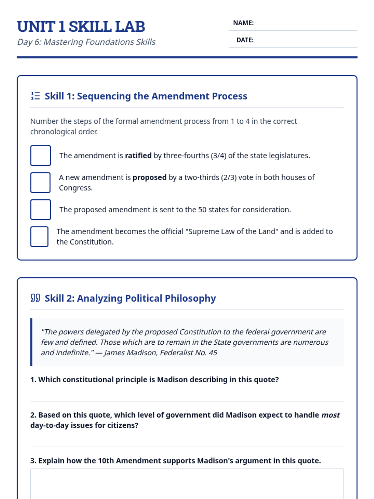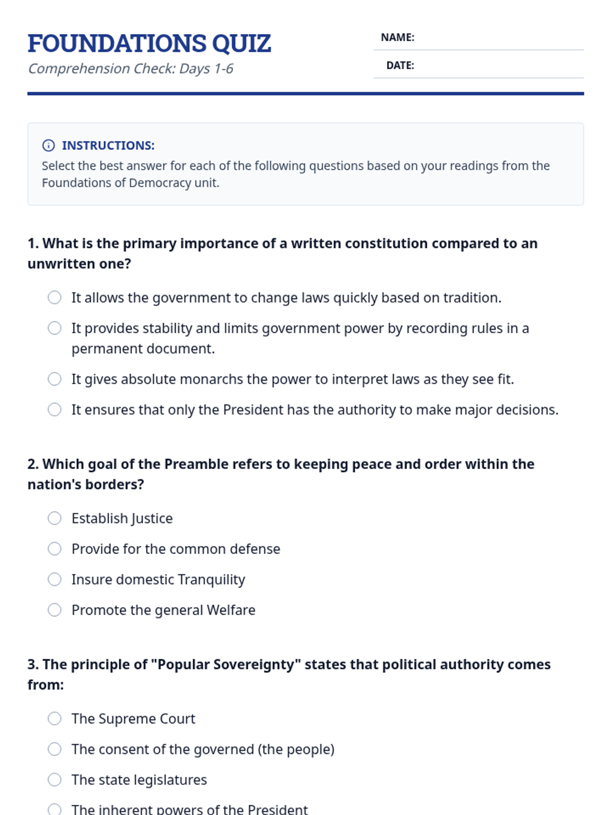 Covers the foundations of the U.S. Constitution, including its importance, the Preamble, and core principles like popular sovereignty and federalism.