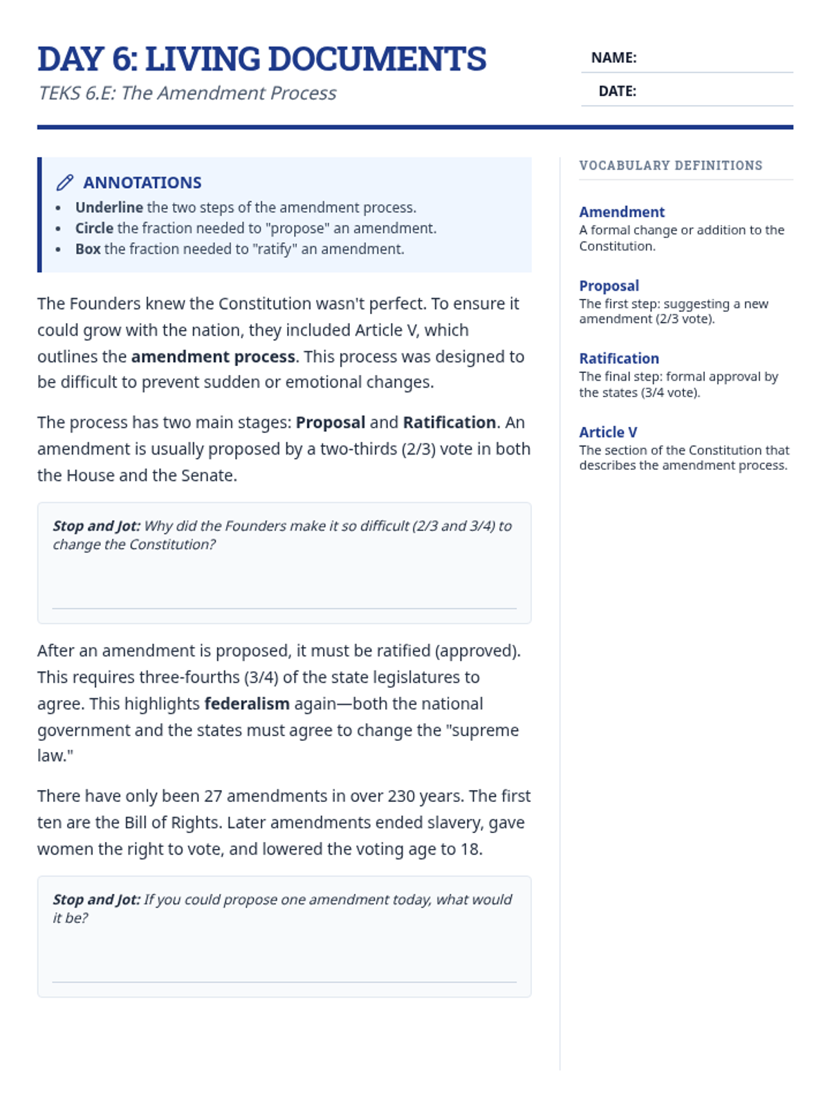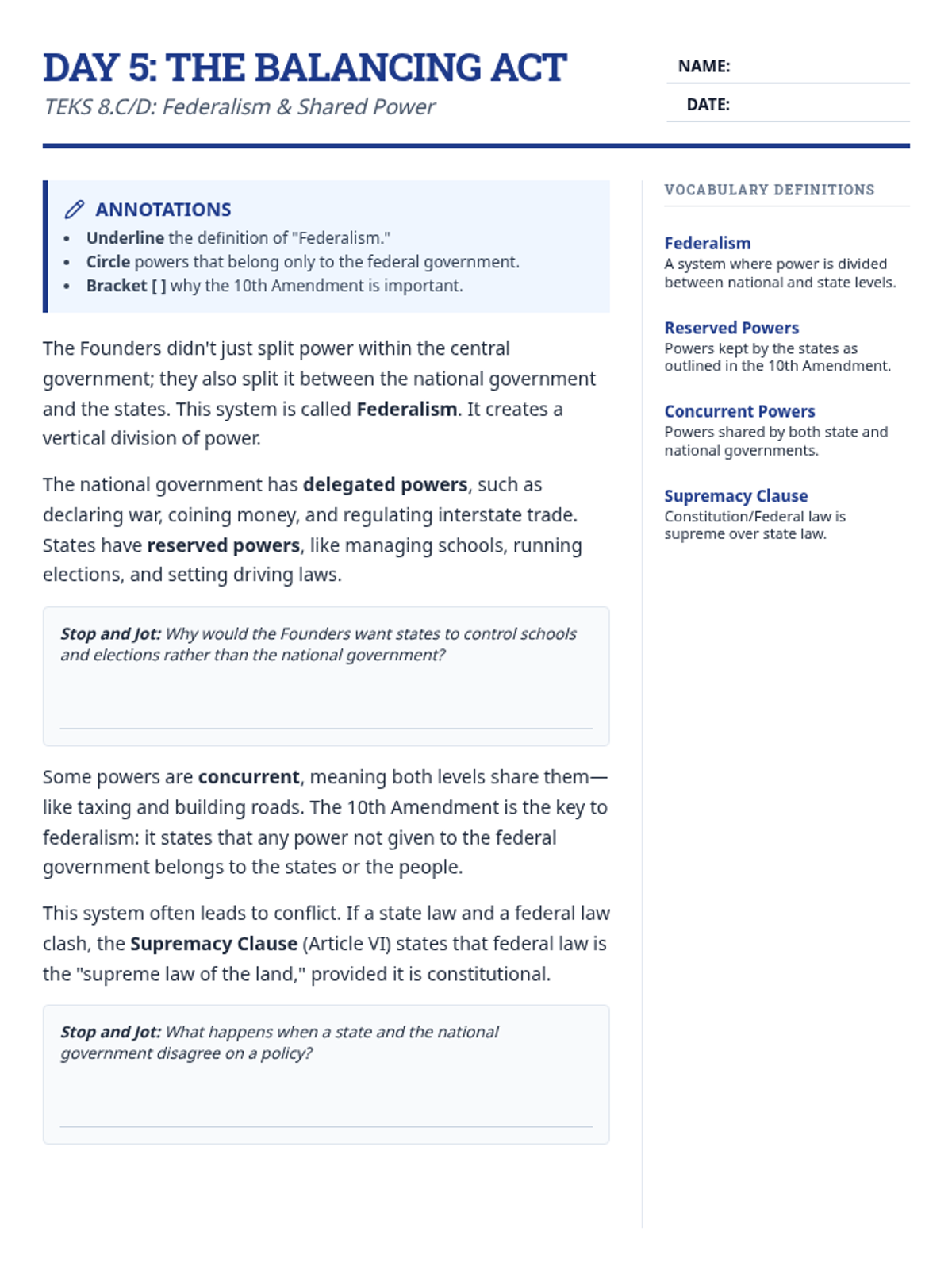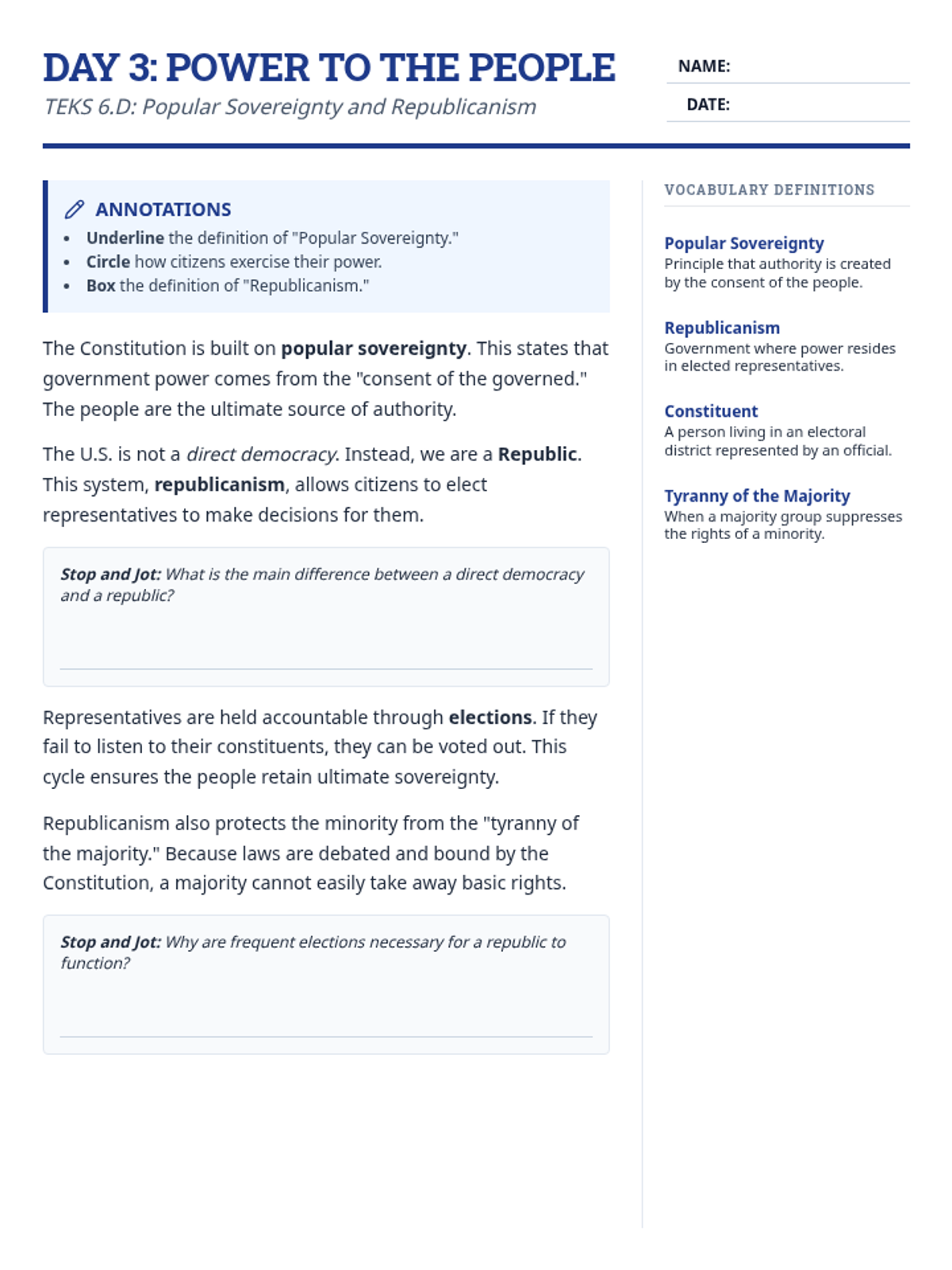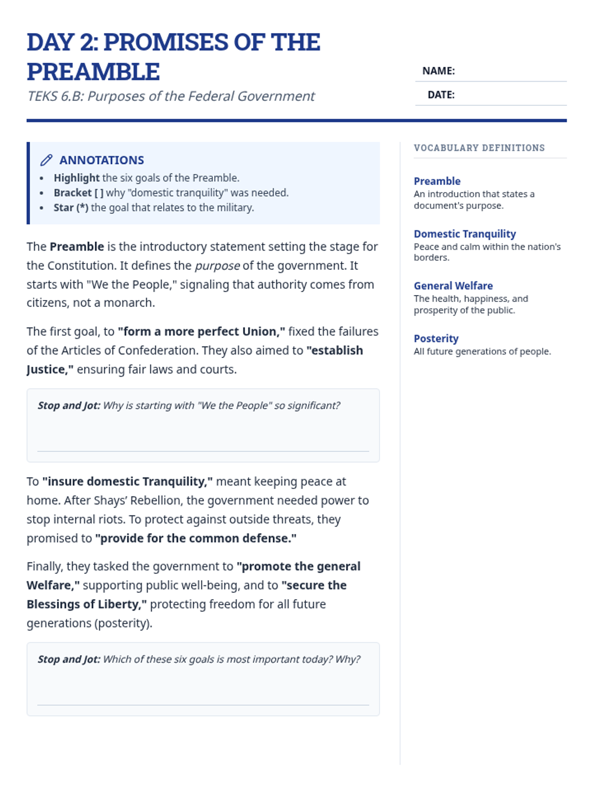 Covers the foundations of the U.S. Constitution, including its importance, the Preamble, and core principles like popular sovereignty and federalism.