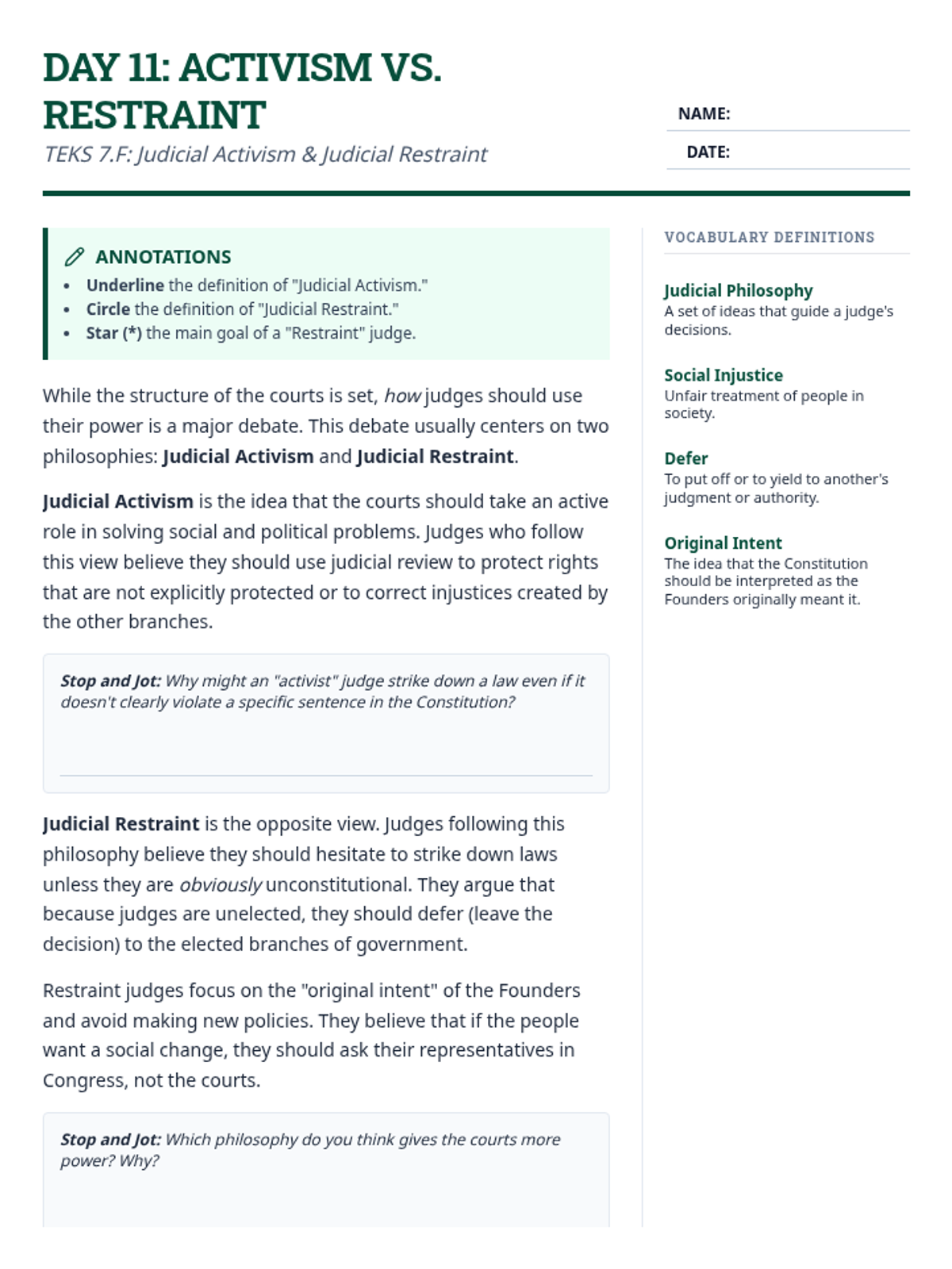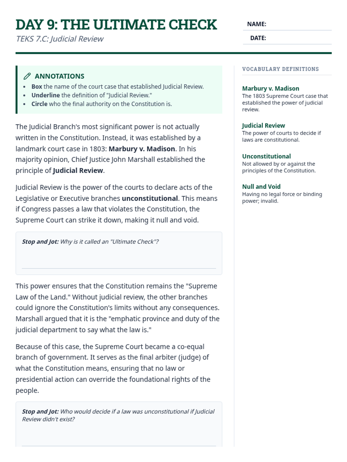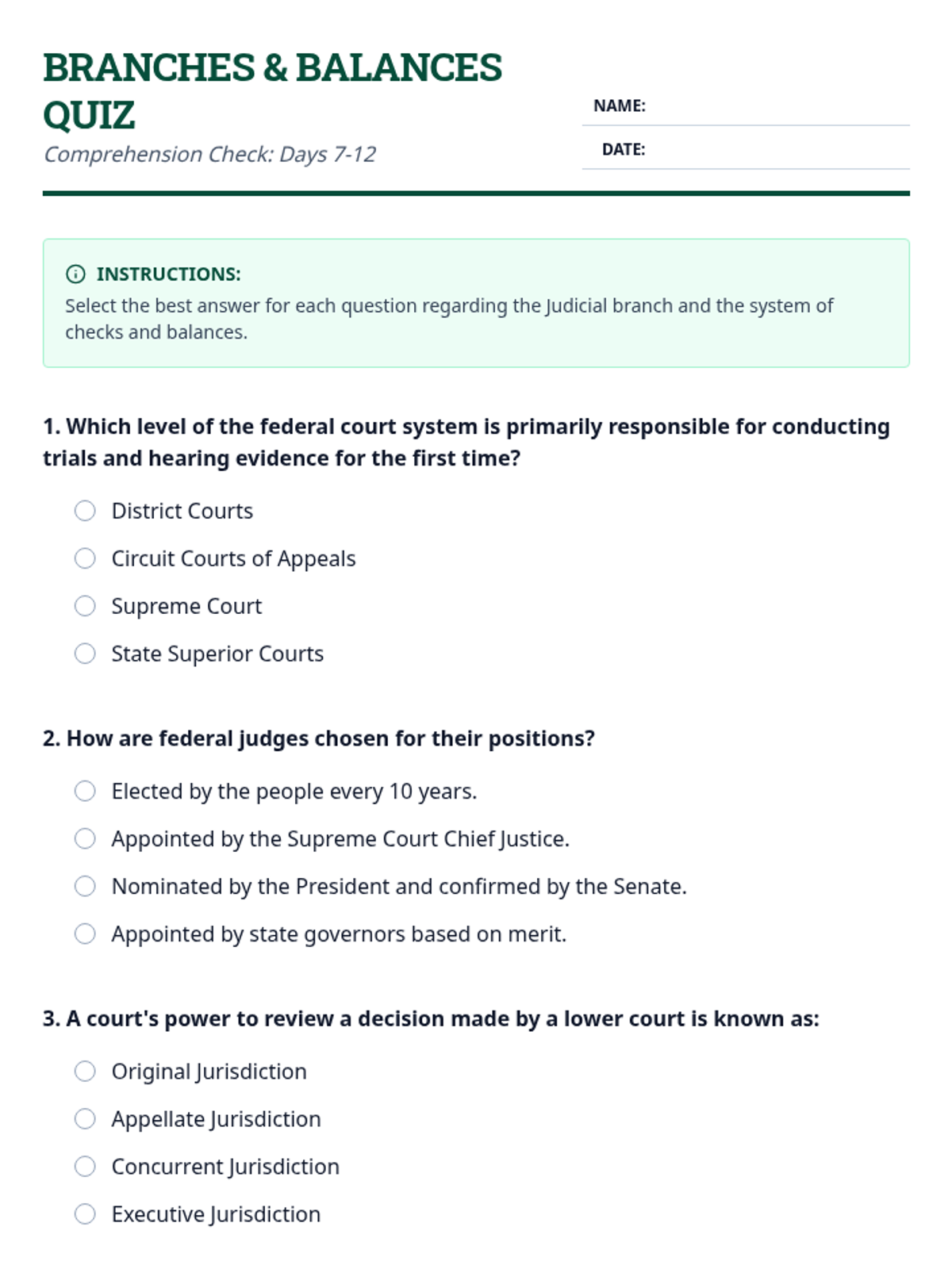 Explores the structure of the federal government with a focus on the Judicial branch, judicial review, and the system of checks and balances.