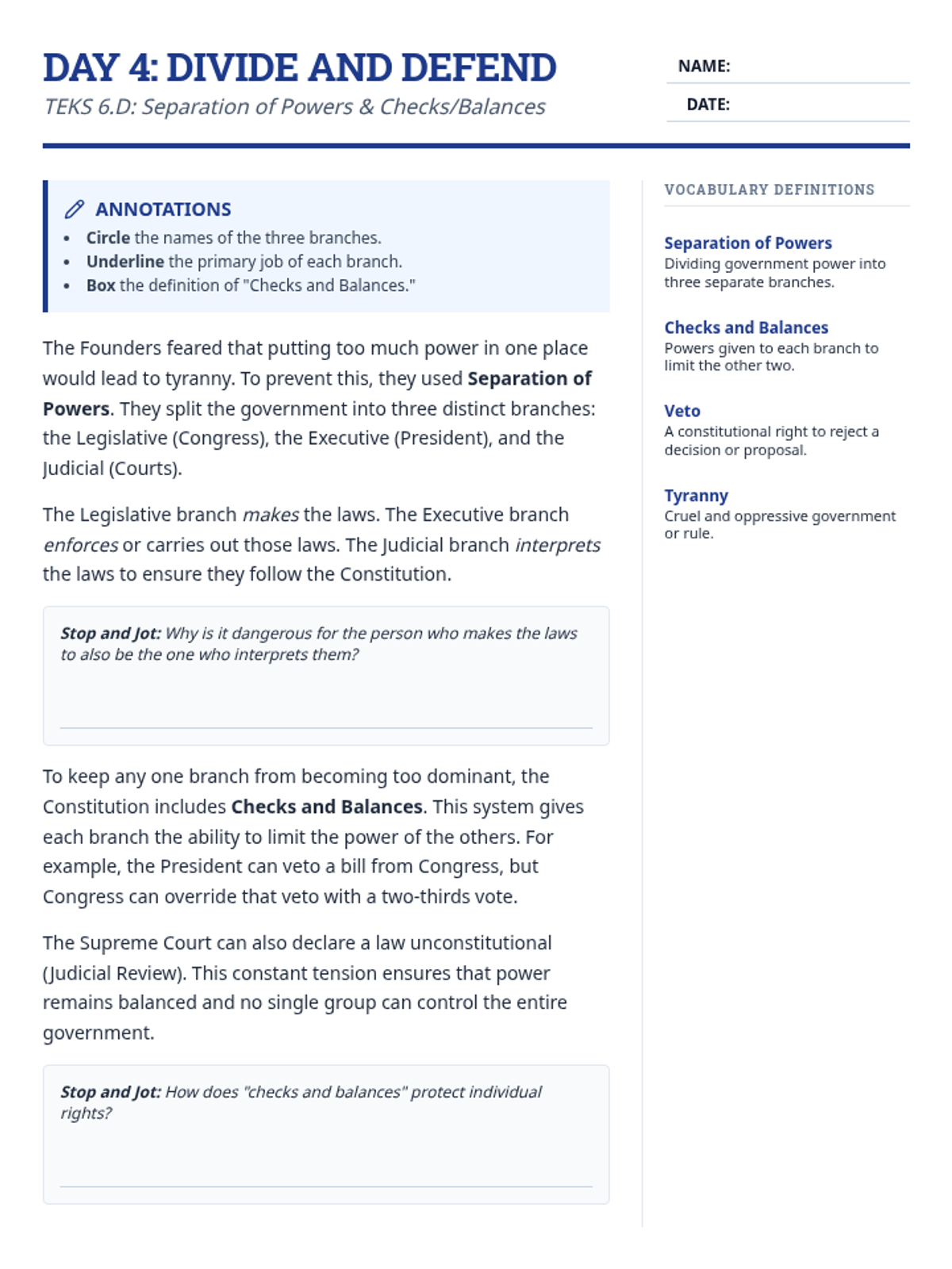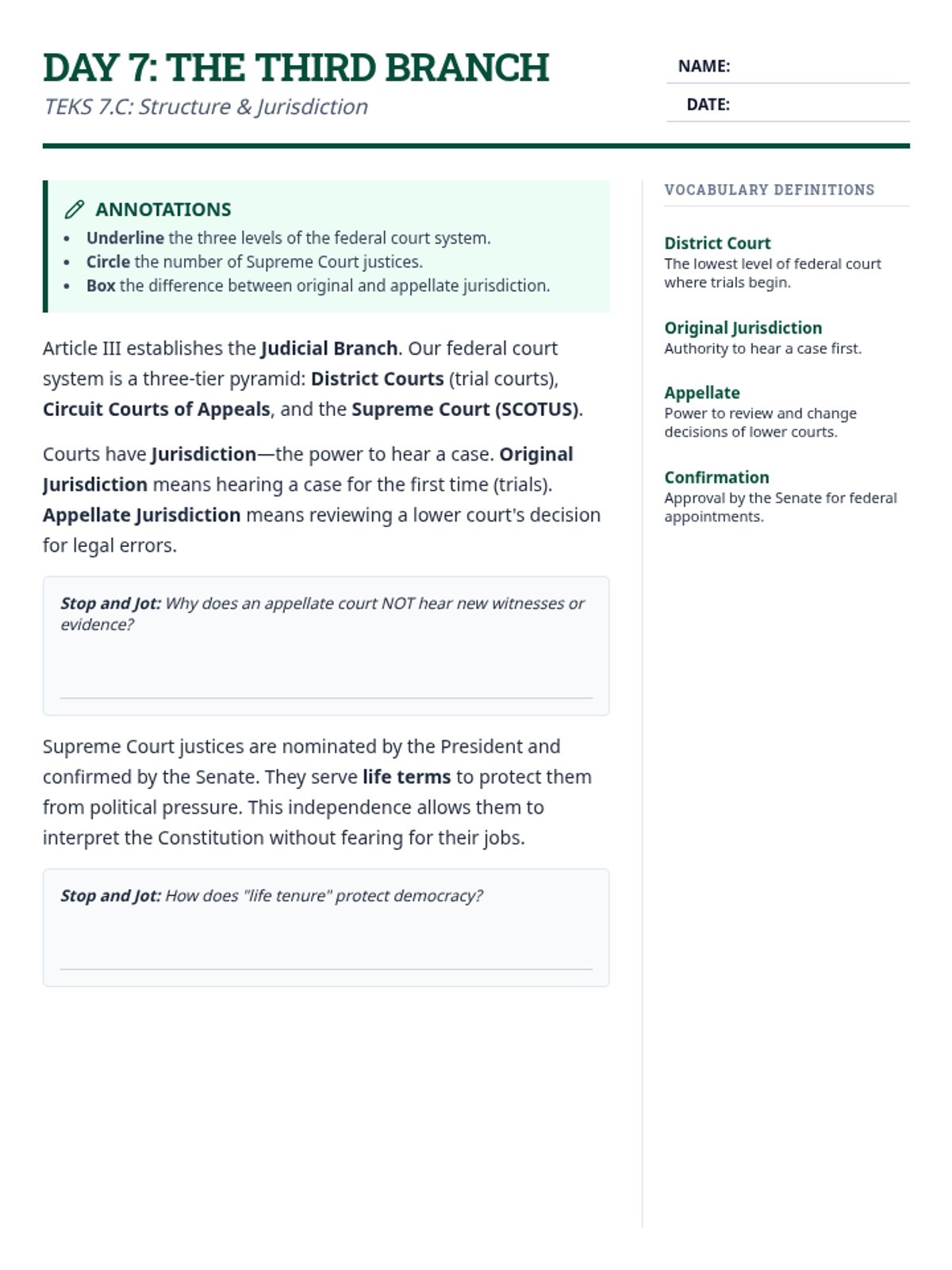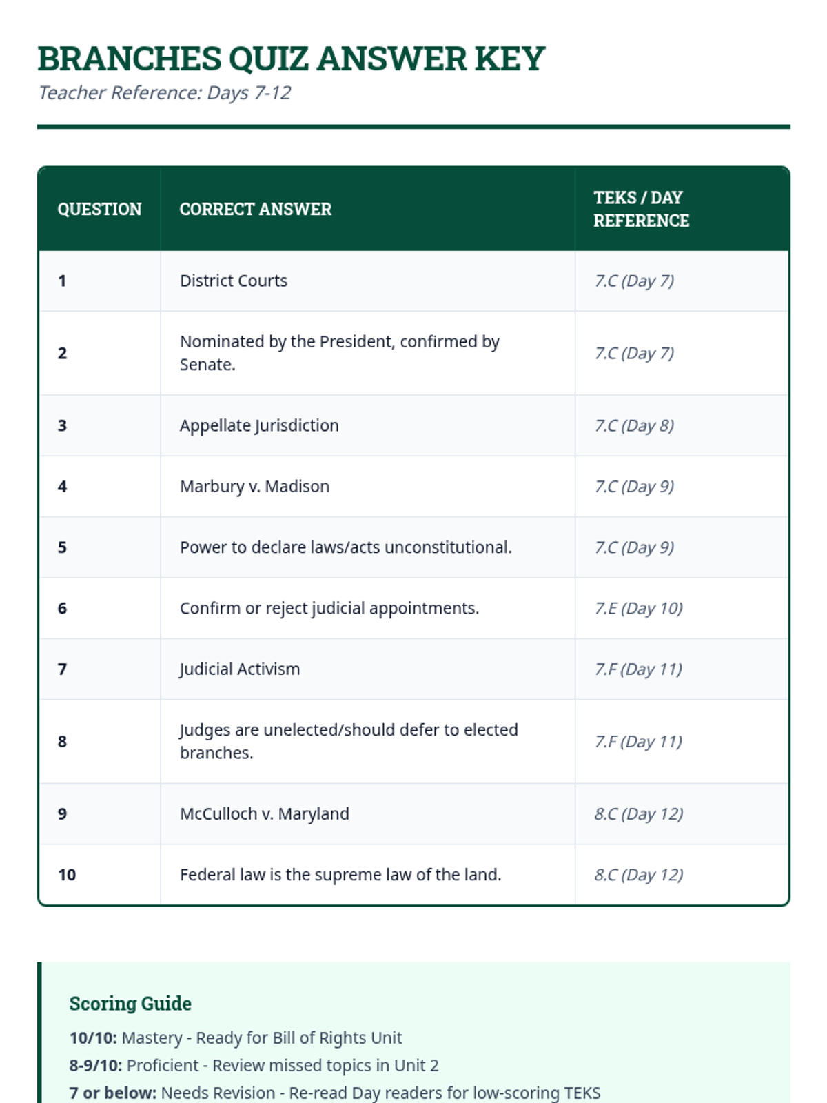 Explores the structure of the federal government with a focus on the Judicial branch, judicial review, and the system of checks and balances.