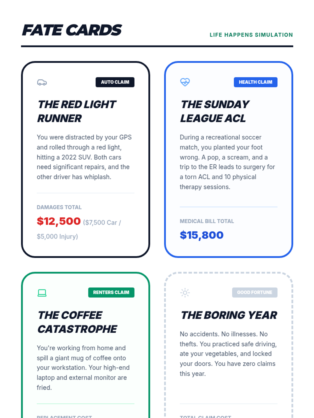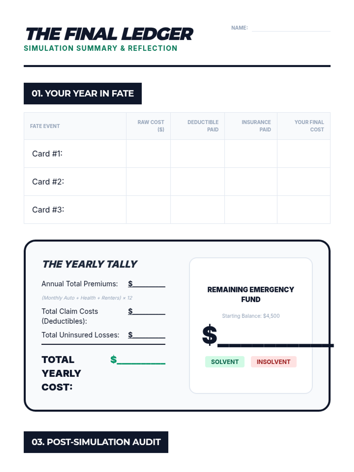 The culminating simulation activity where students face randomized 'Life Happens' events to test their insurance portfolios. Includes a final ledger and reflection on their financial resilience.