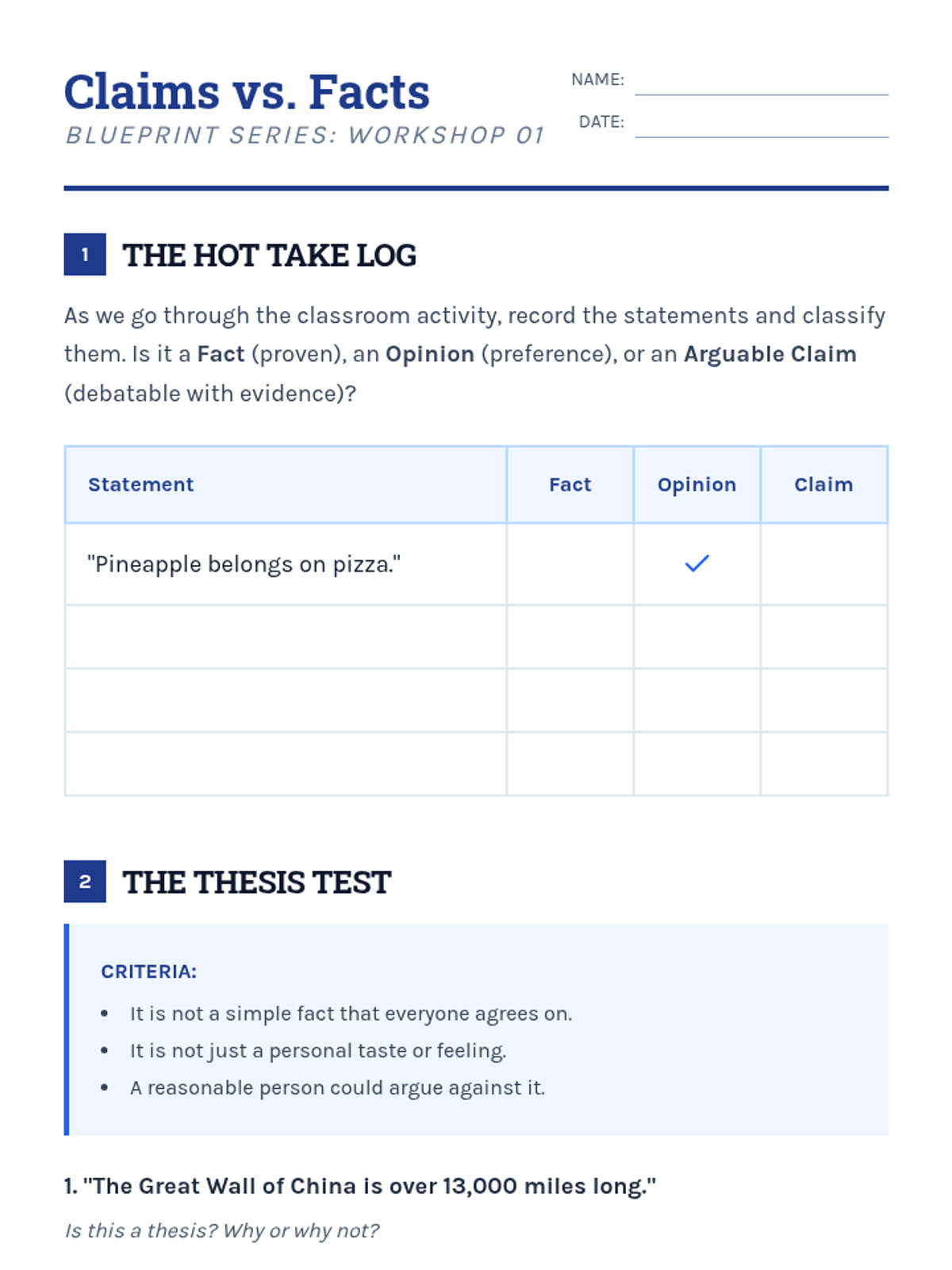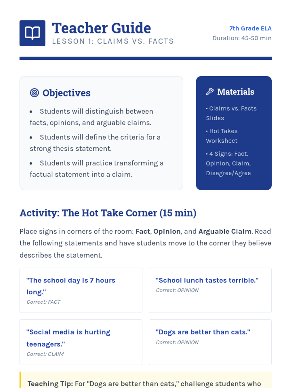 Students distinguish between facts, opinions, and arguable claims through a 'Hot Take' activity and categorization practice.