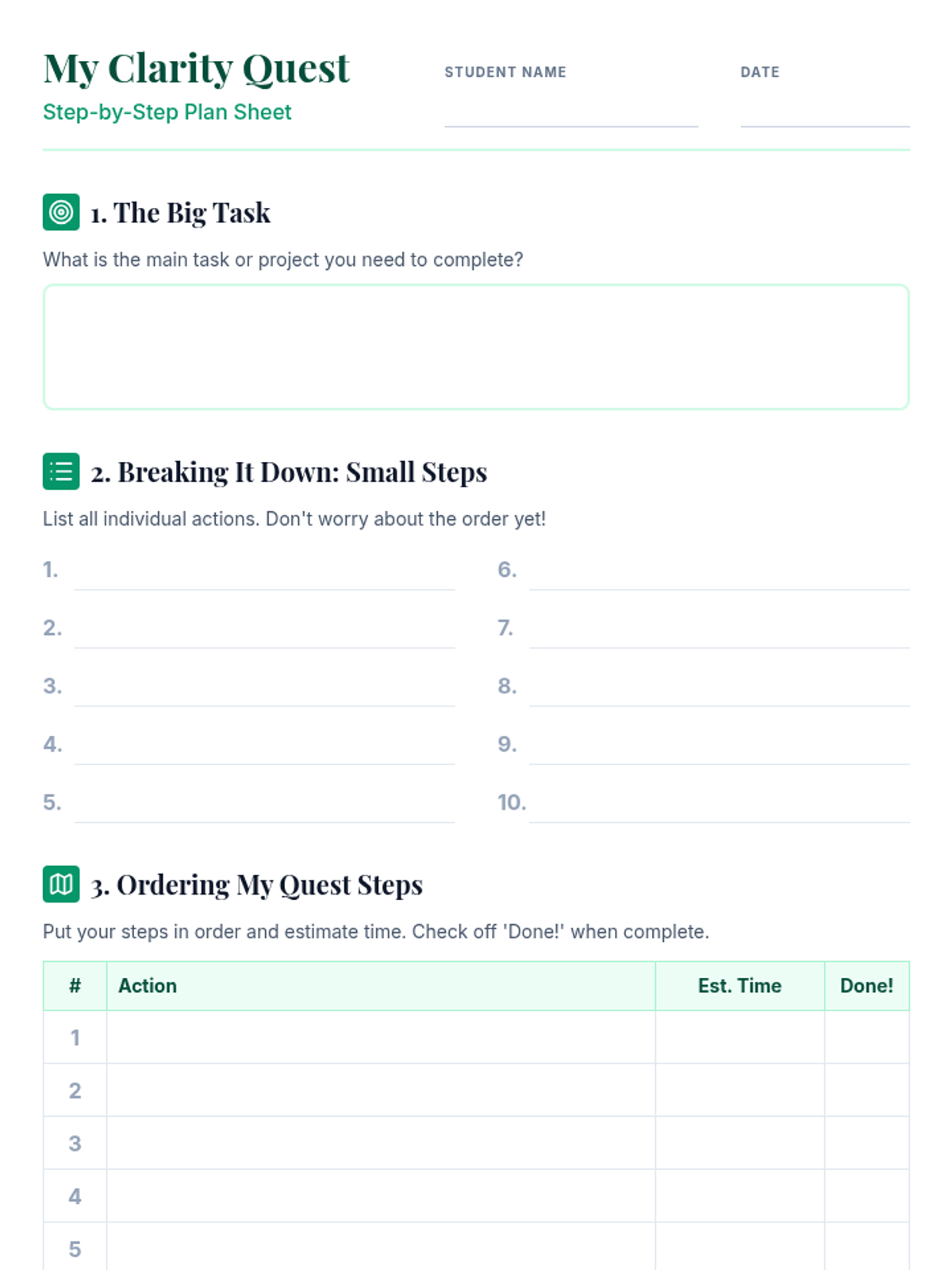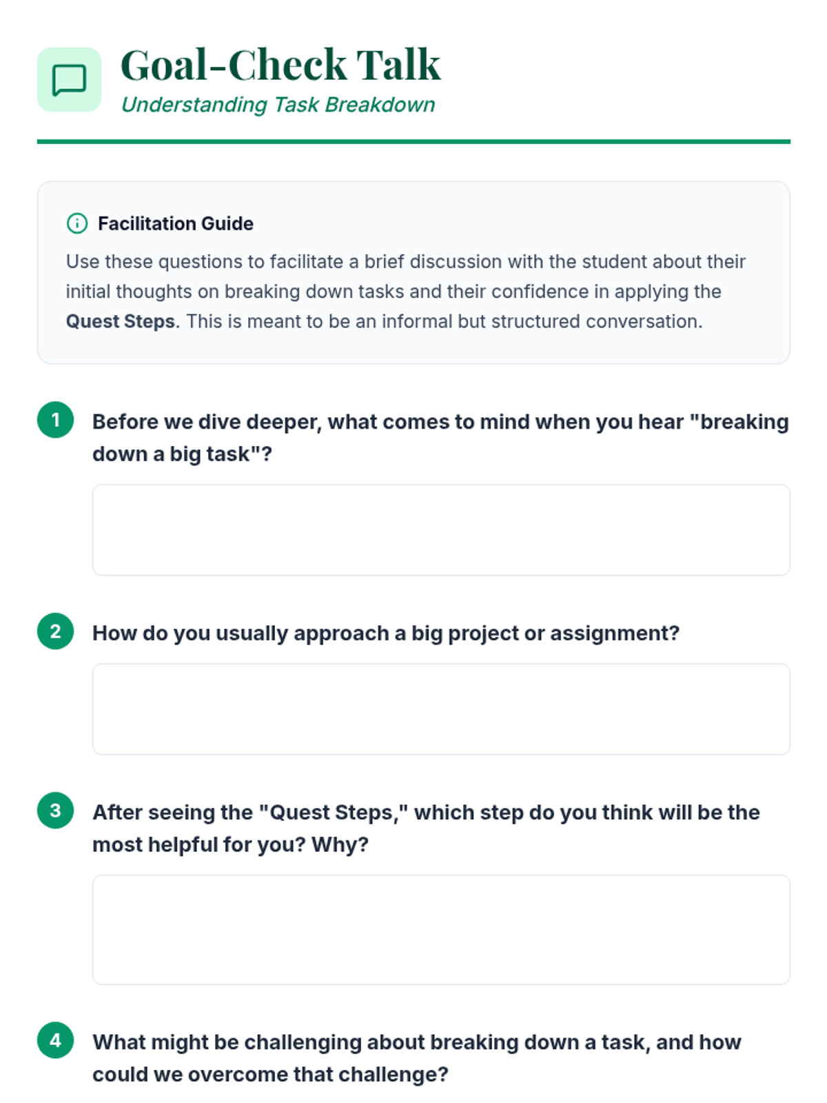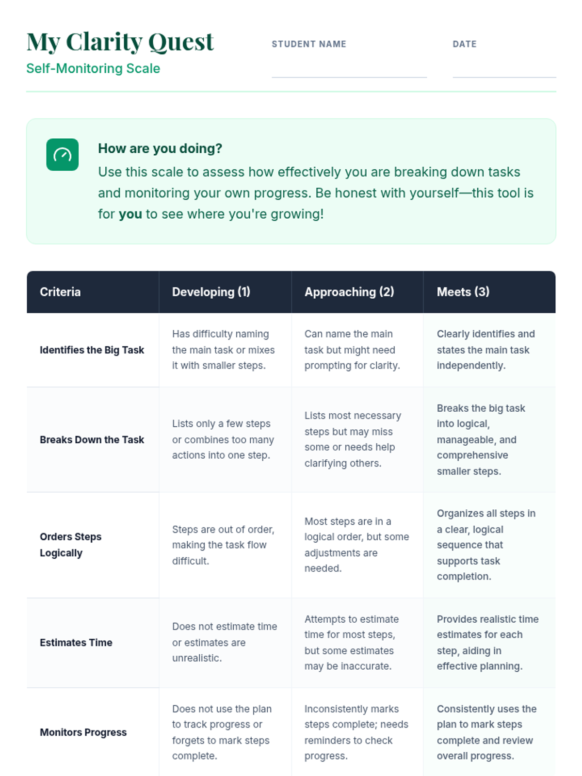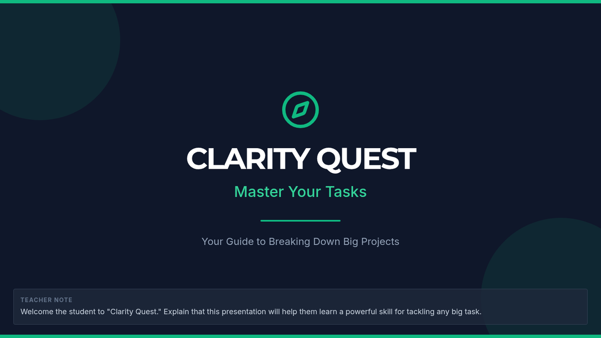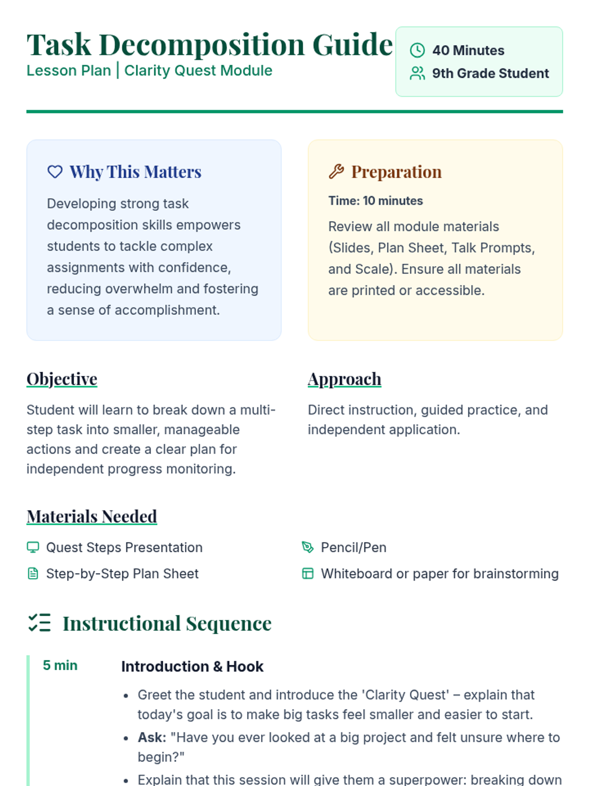 An individualized coaching module helping a 9th-grade student break down multi-step tasks into manageable actions and monitor progress independently. This lesson is important because it equips students with essential executive function skills, leading to greater independence and academic success.
