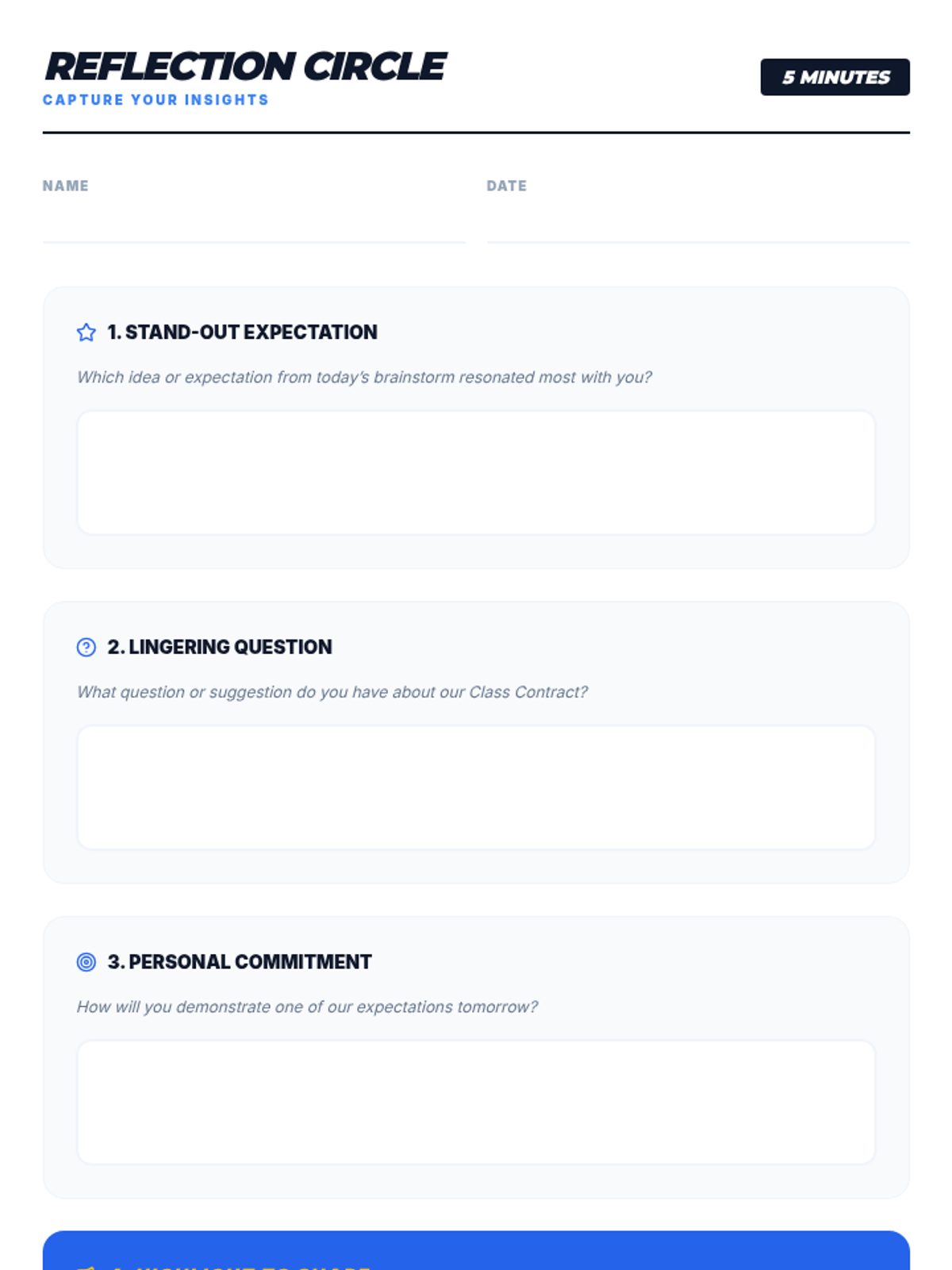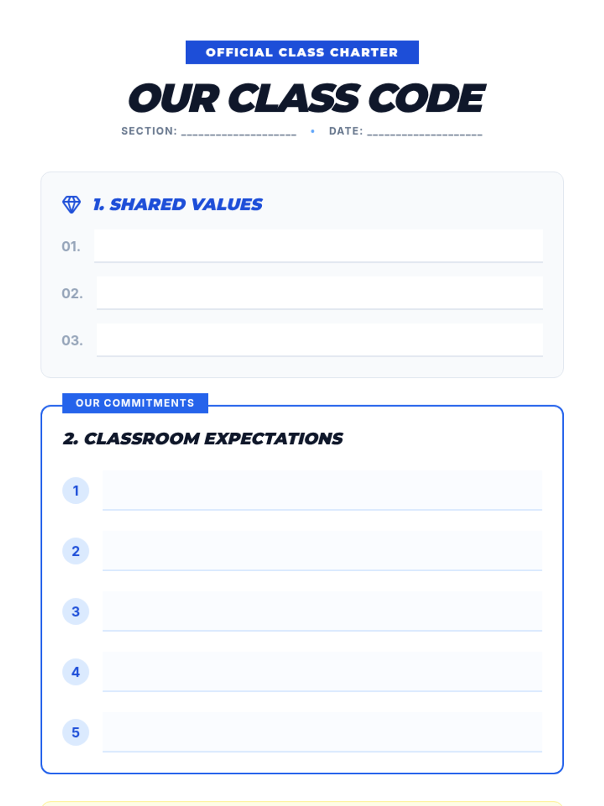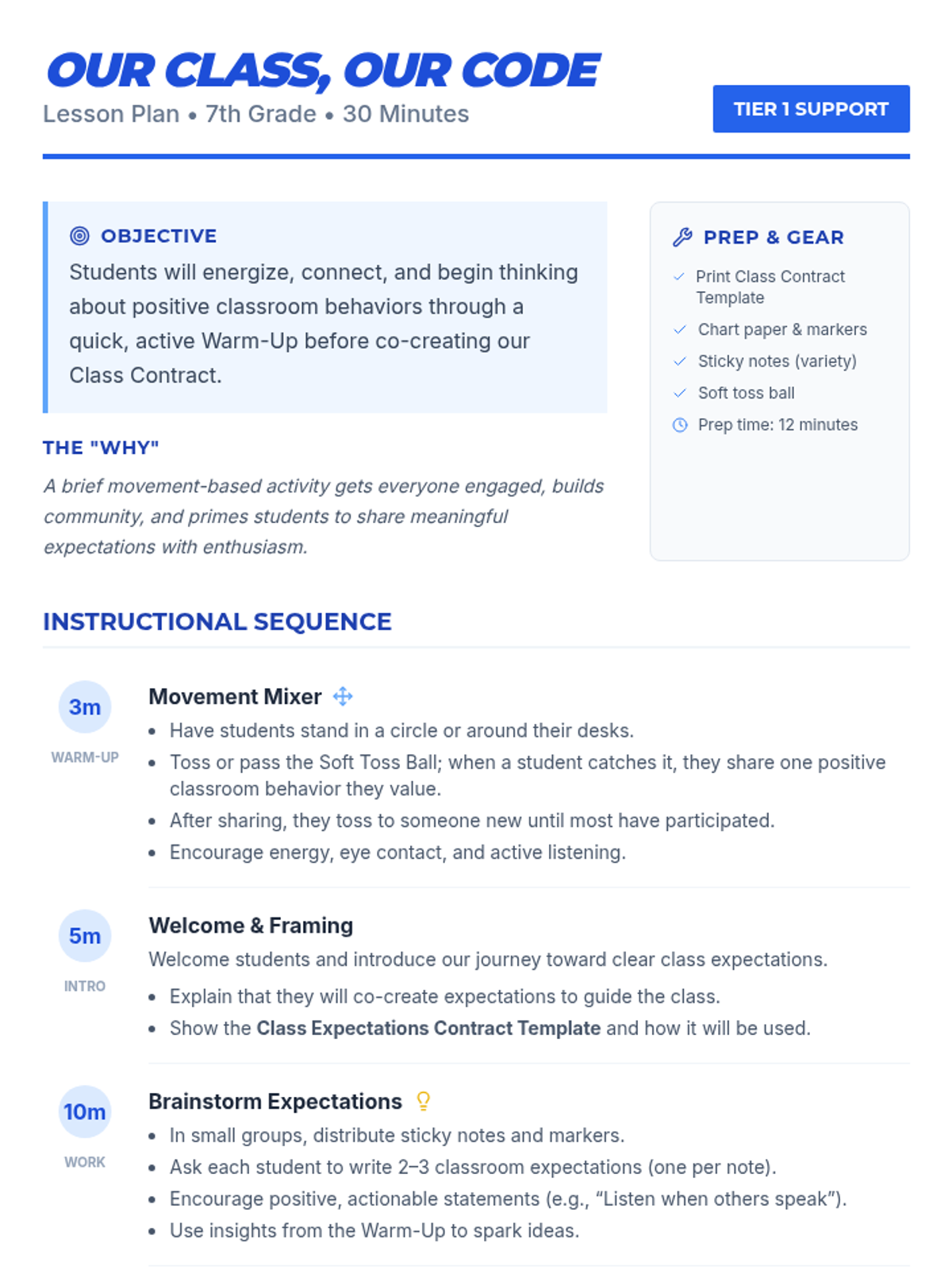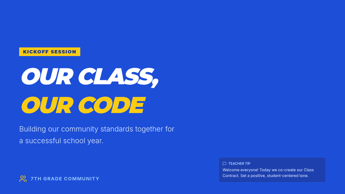 A 30-minute kickoff session for 7th graders to co-create classroom expectations and launch a supportive learning community. Students engage in movement-based brainstorming and collaborative consolidation to form a class contract.