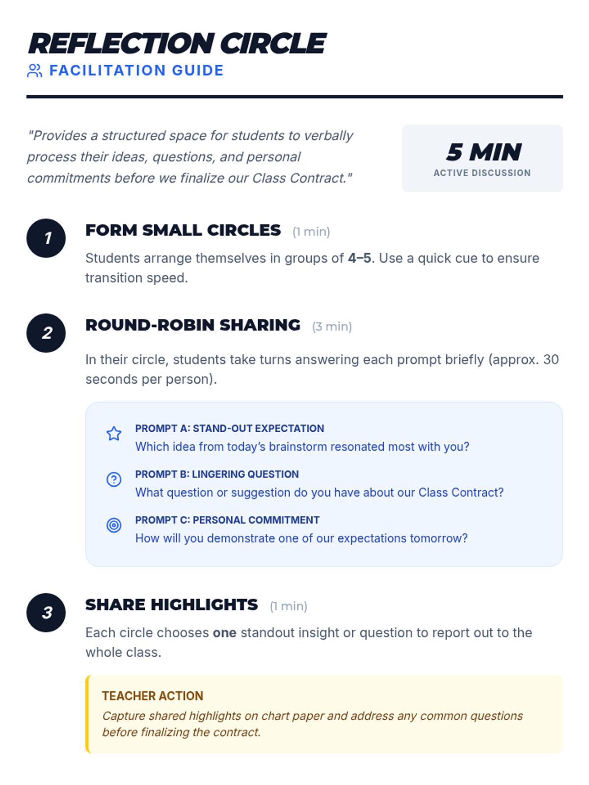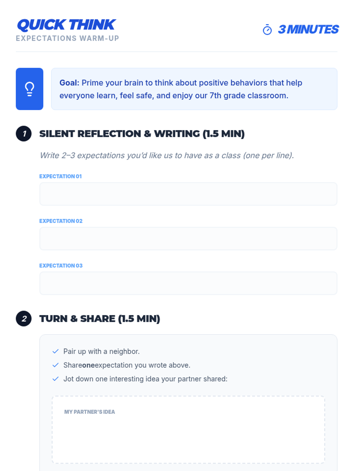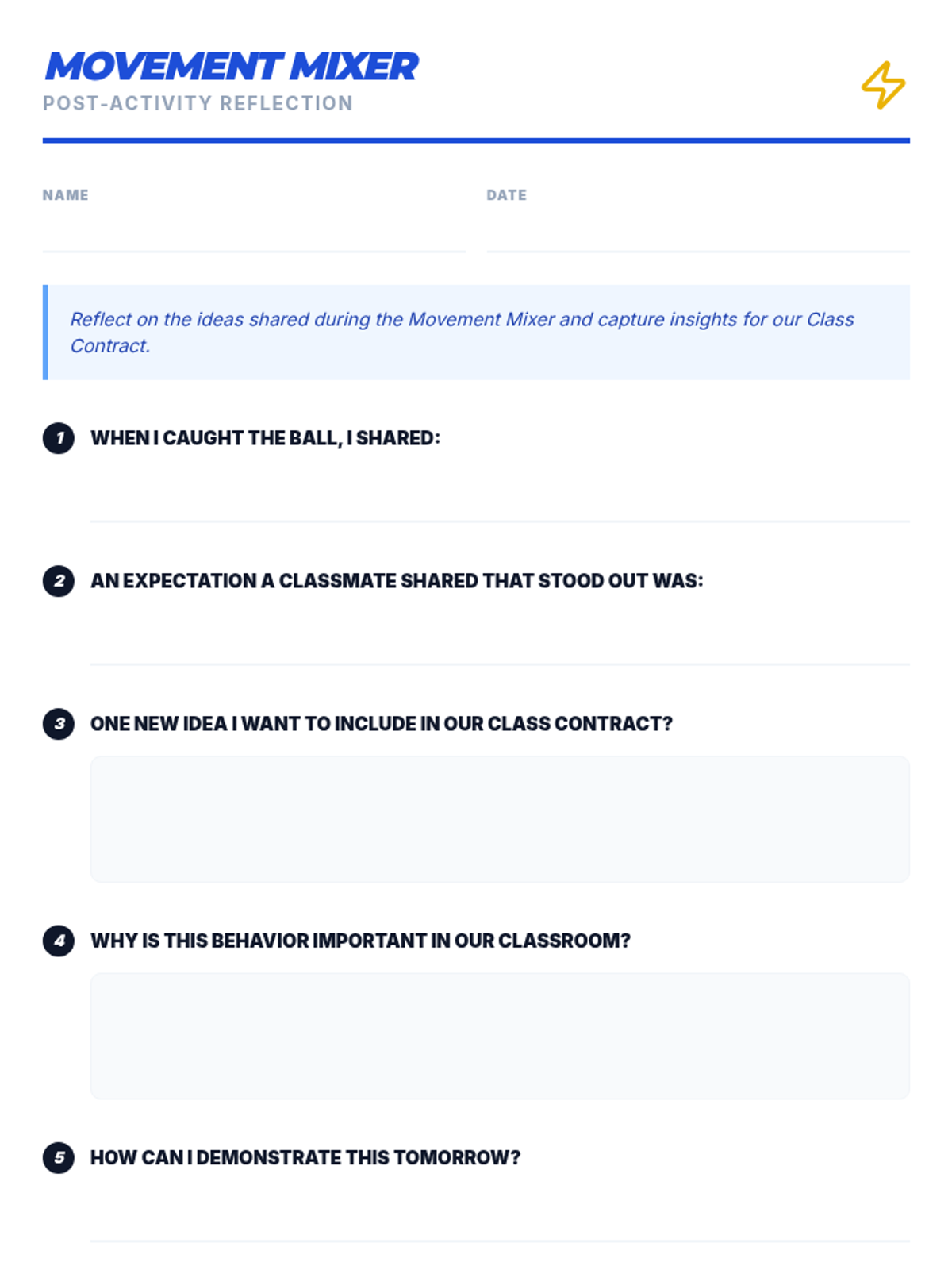 A 30-minute kickoff session for 7th graders to co-create classroom expectations and launch a supportive learning community. Students engage in movement-based brainstorming and collaborative consolidation to form a class contract.