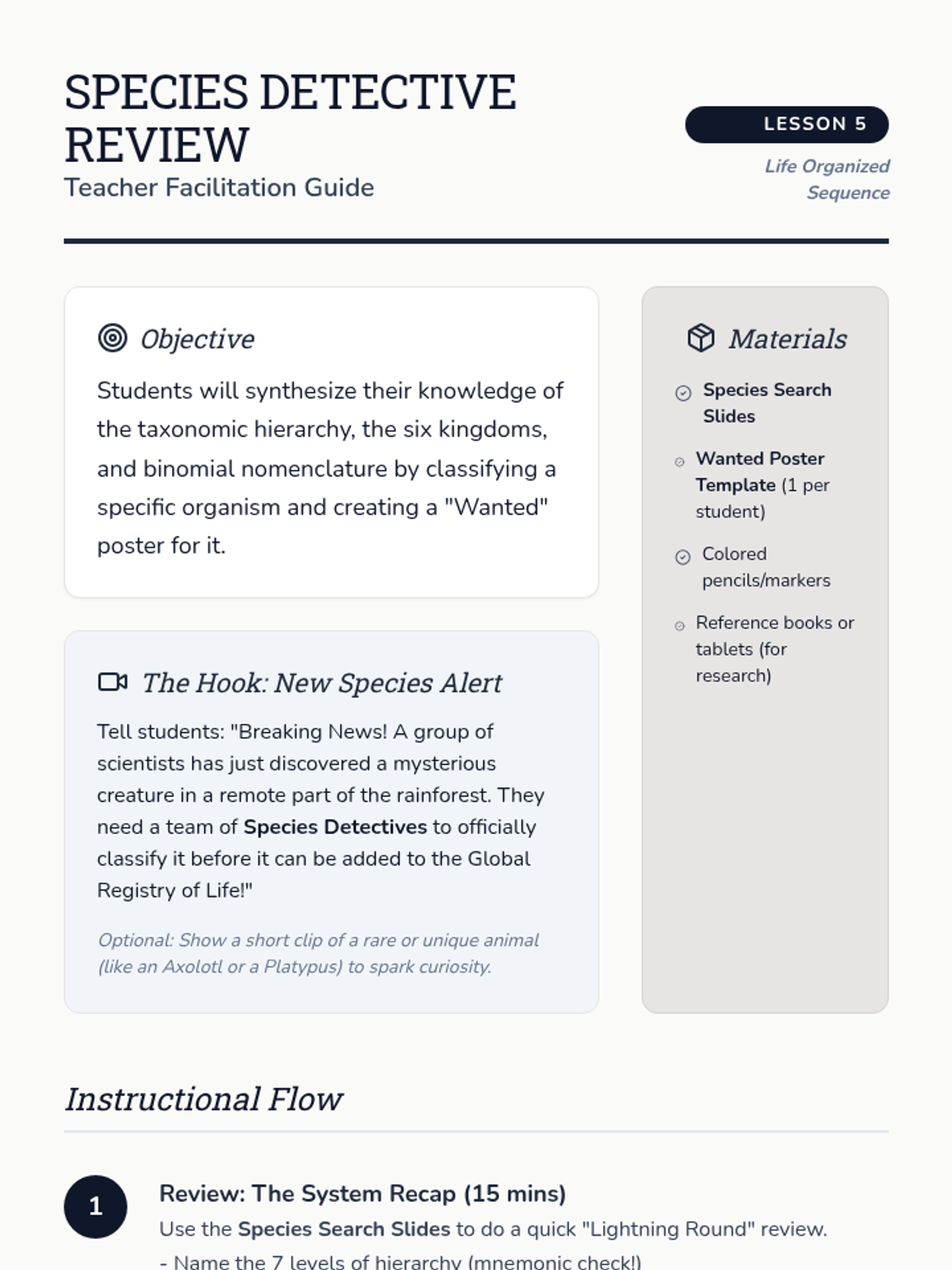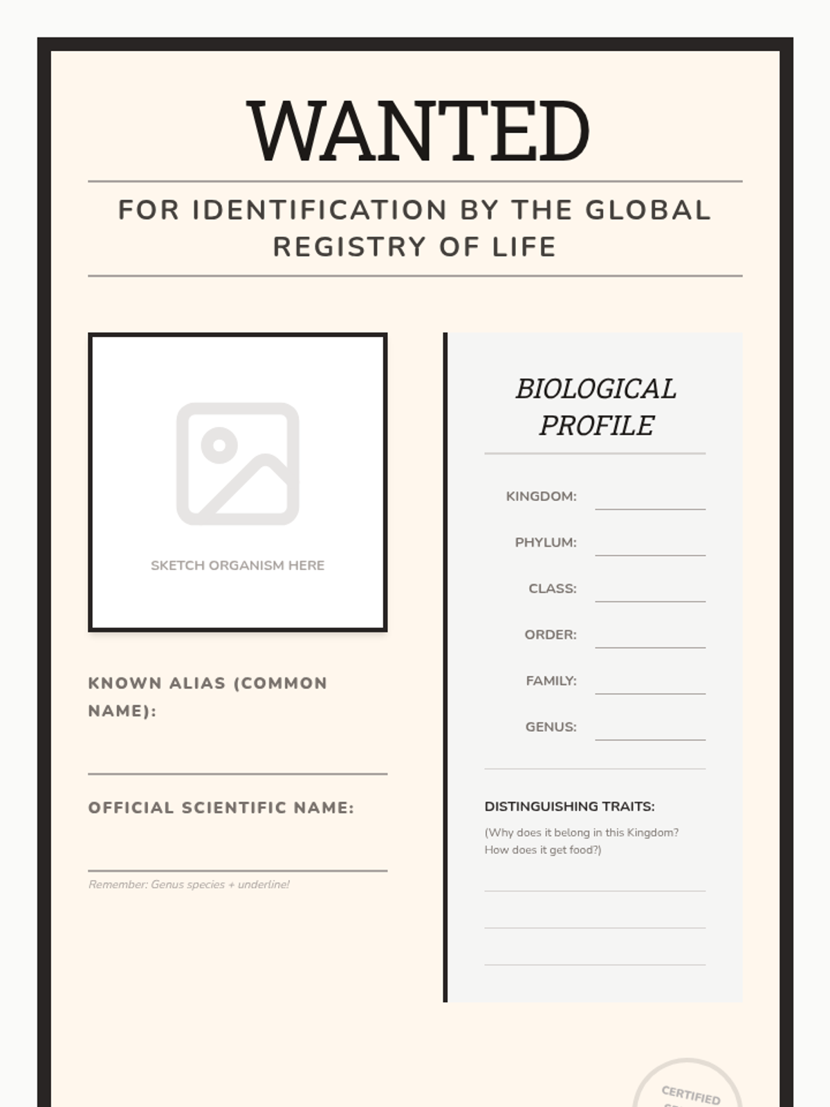 A culminating review where students apply their knowledge of taxonomy to classify a specific organism and create a 'Wanted' poster summarizing its biological identity.