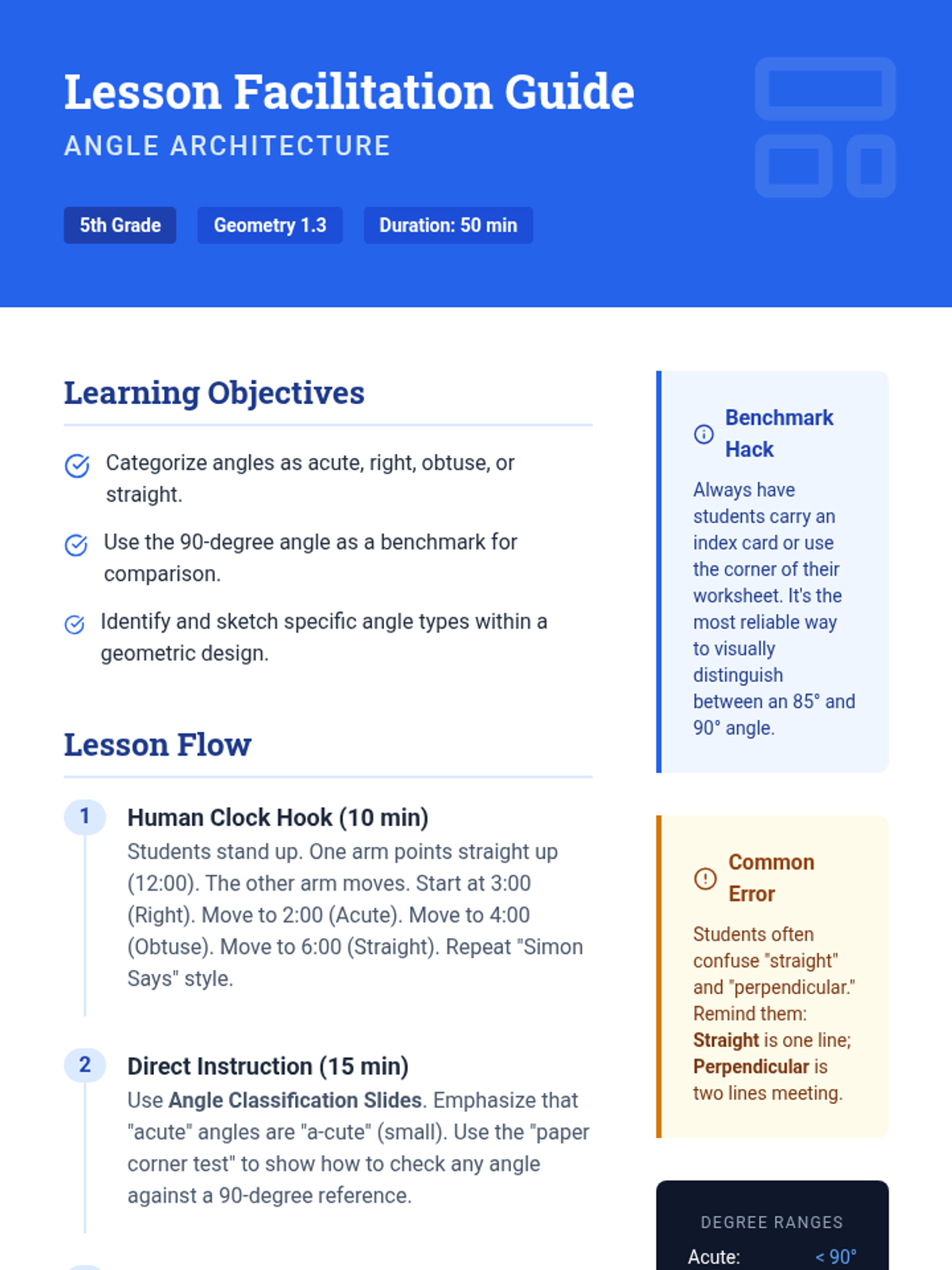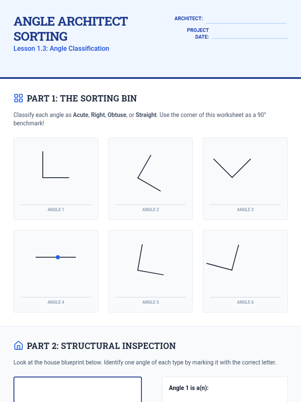 Students categorize angles as acute, right, obtuse, or straight using benchmarks and visual estimation.