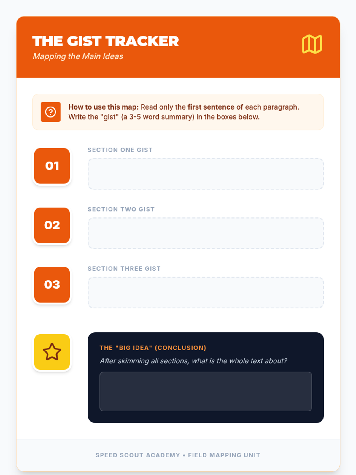 Focuses on the 'first and last' strategy to identify main ideas and topic sentences, allowing students to map out the structure of a text quickly.