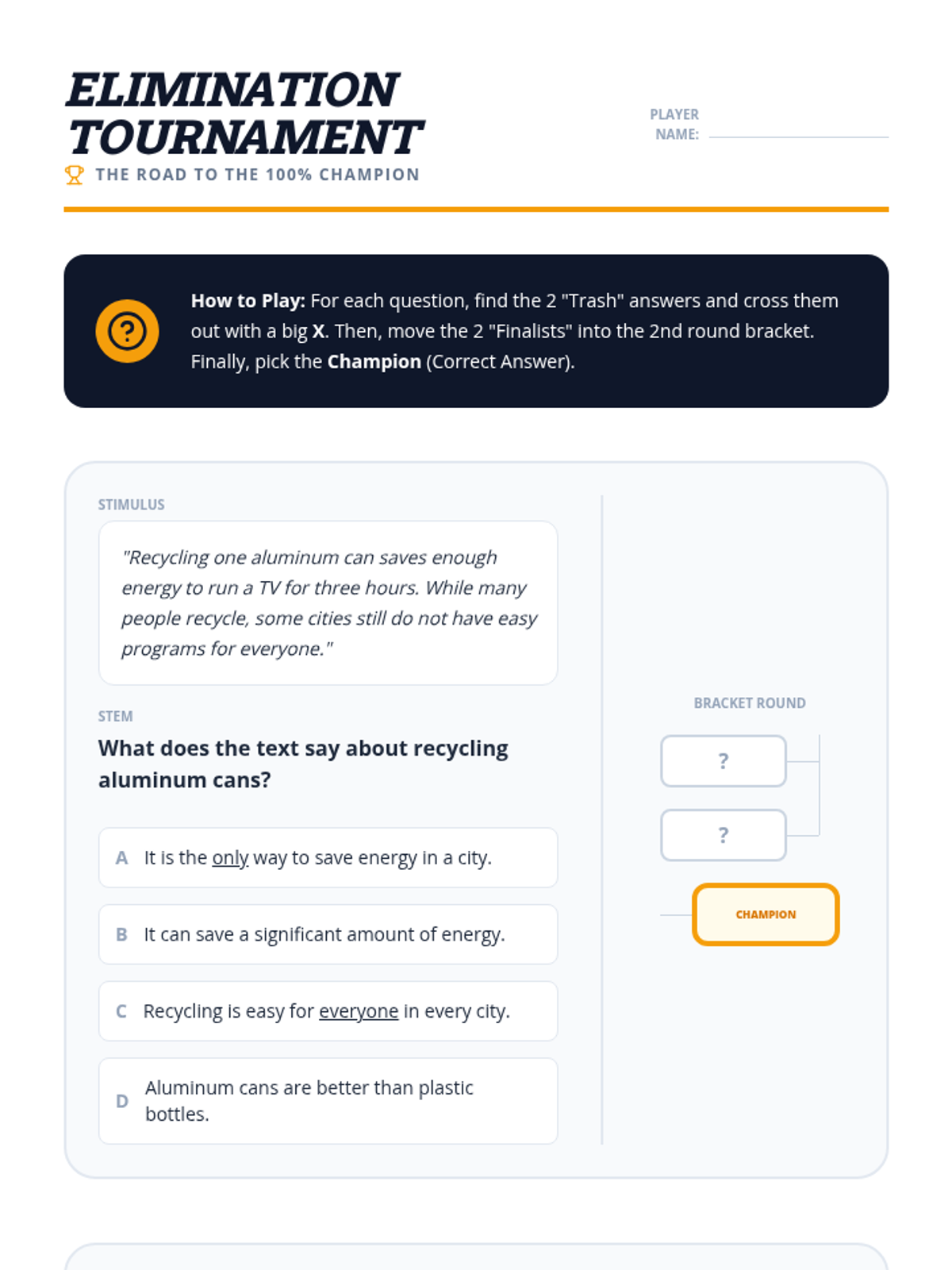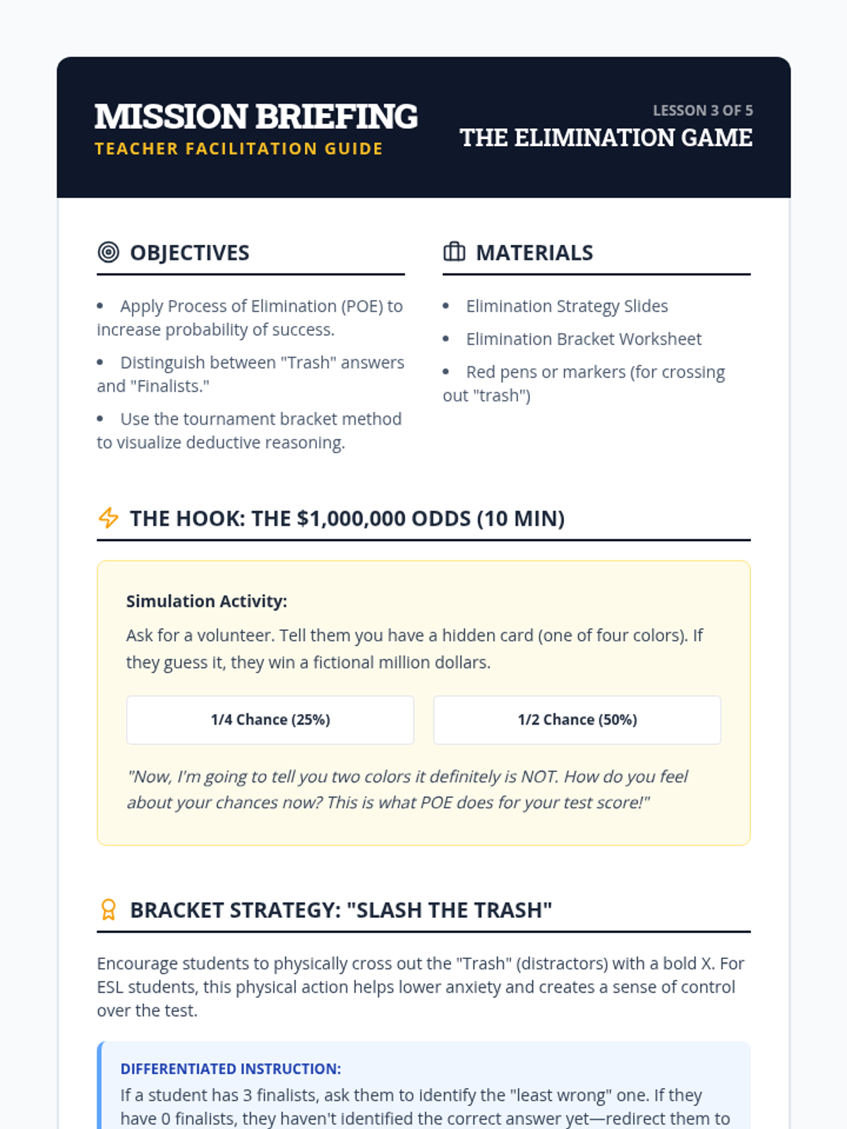 Students practice the physical and mental habit of crossing out clearly wrong answers to increase their probability of success. The lesson focuses on narrowing choices down to two options and using text evidence to make the final selection.