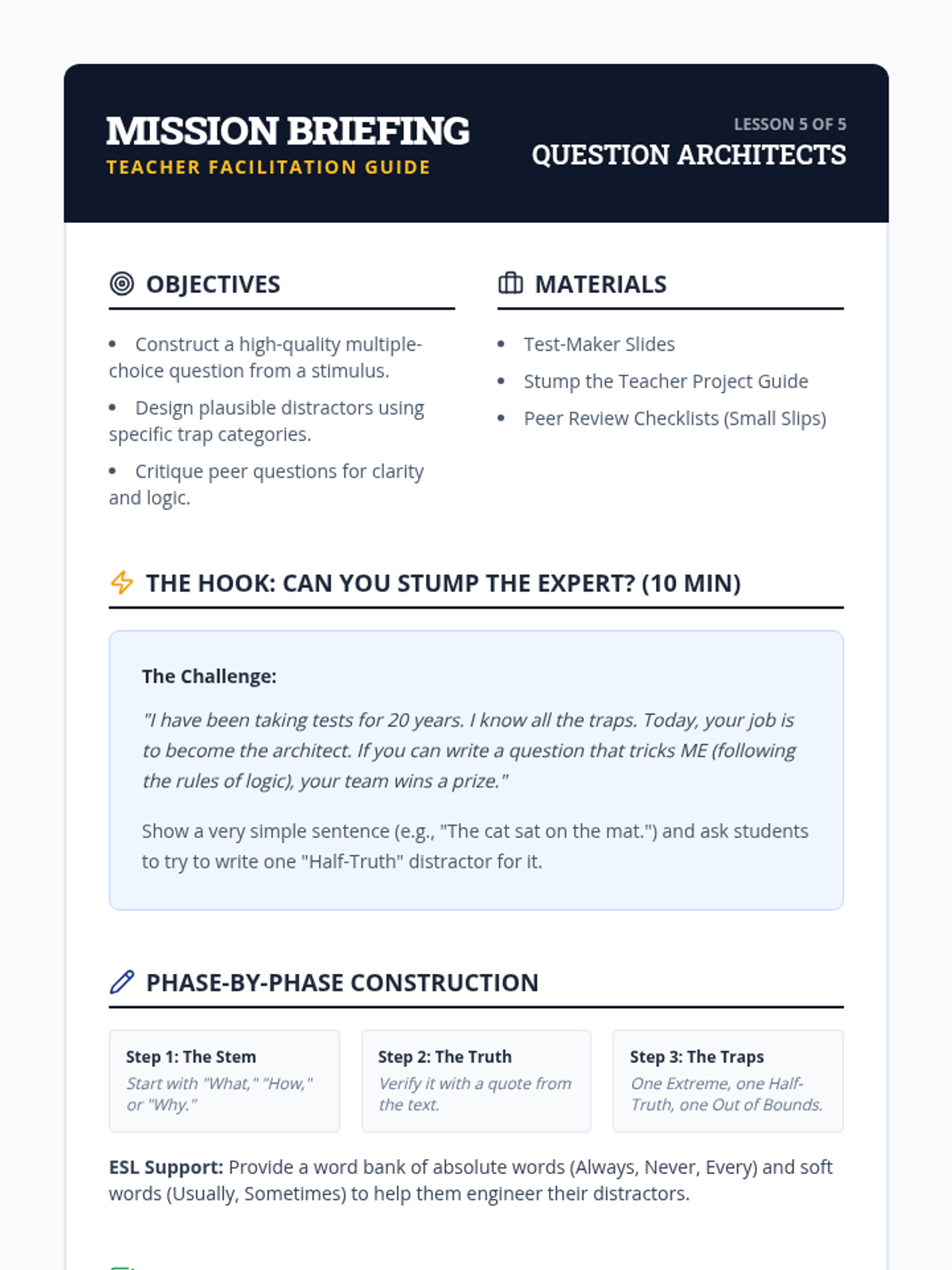 Students switch roles and become the test-makers. They write their own multiple-choice questions based on a shared text, intentionally creating plausible distractors.