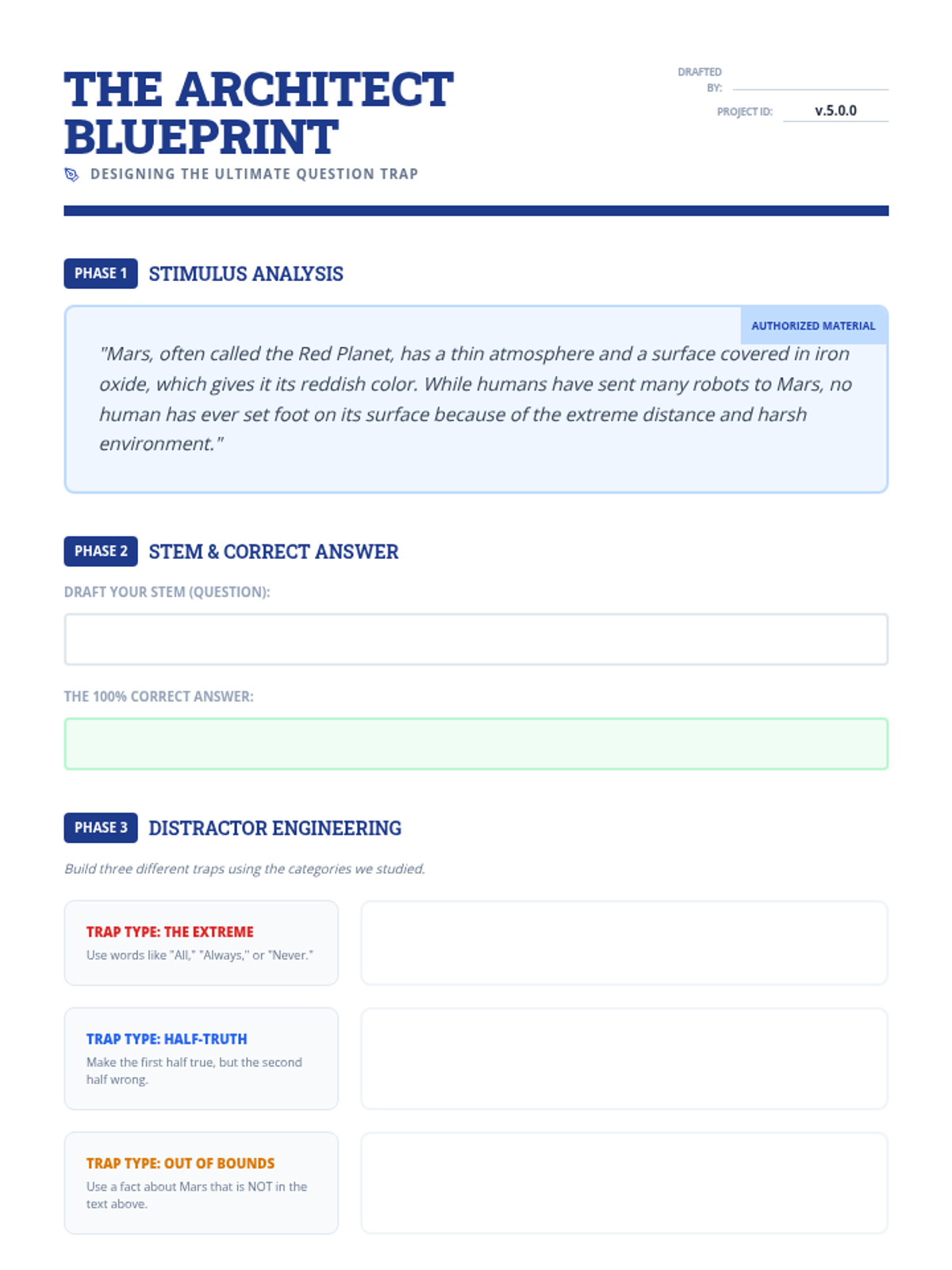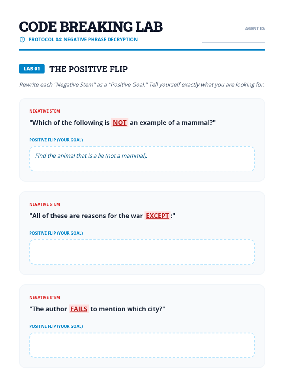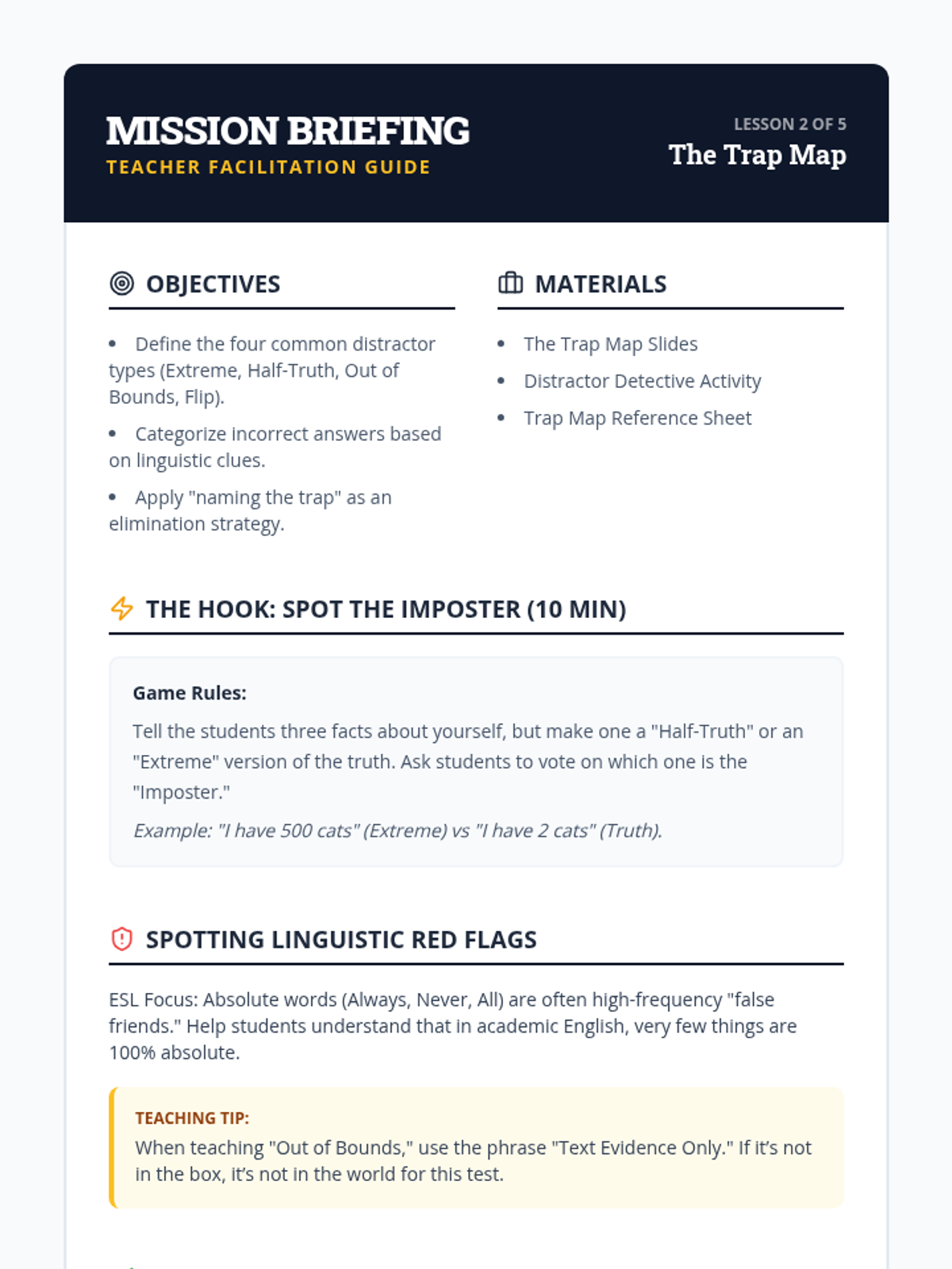 Students break down the components of a test item: the stimulus, the stem (question), the correct answer, and the distractors. They learn to identify what the stem is actually asking before looking at the options.