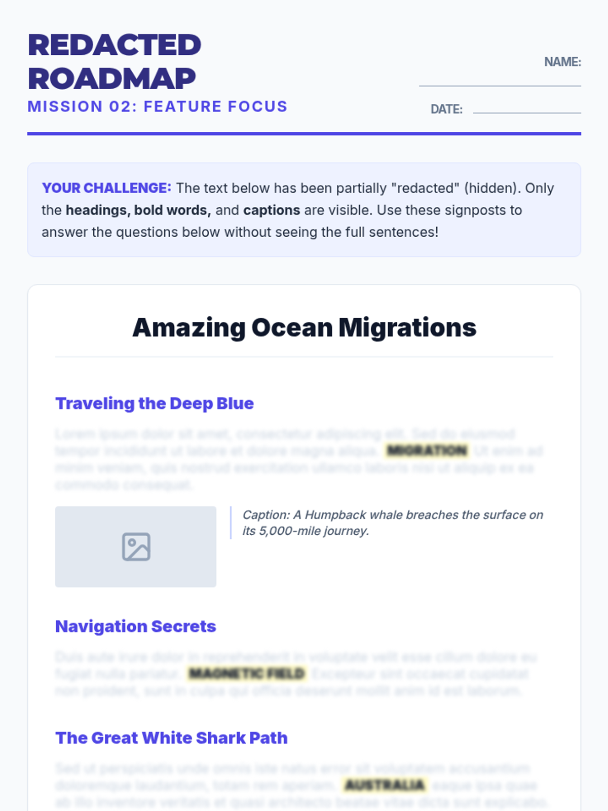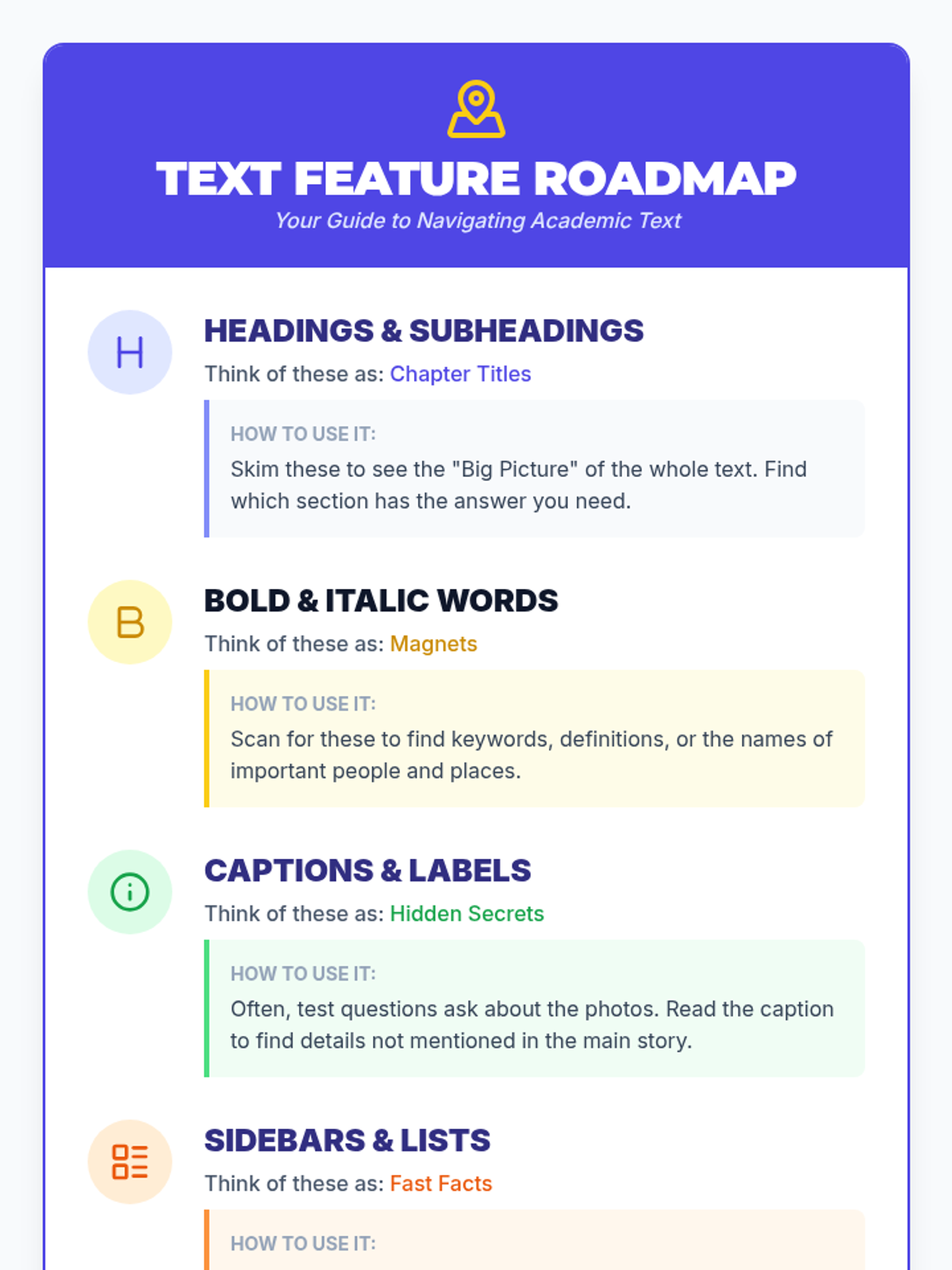 Learners practice using text features like headings, bold words, and captions as navigation tools to predict content and locate information without reading every word.