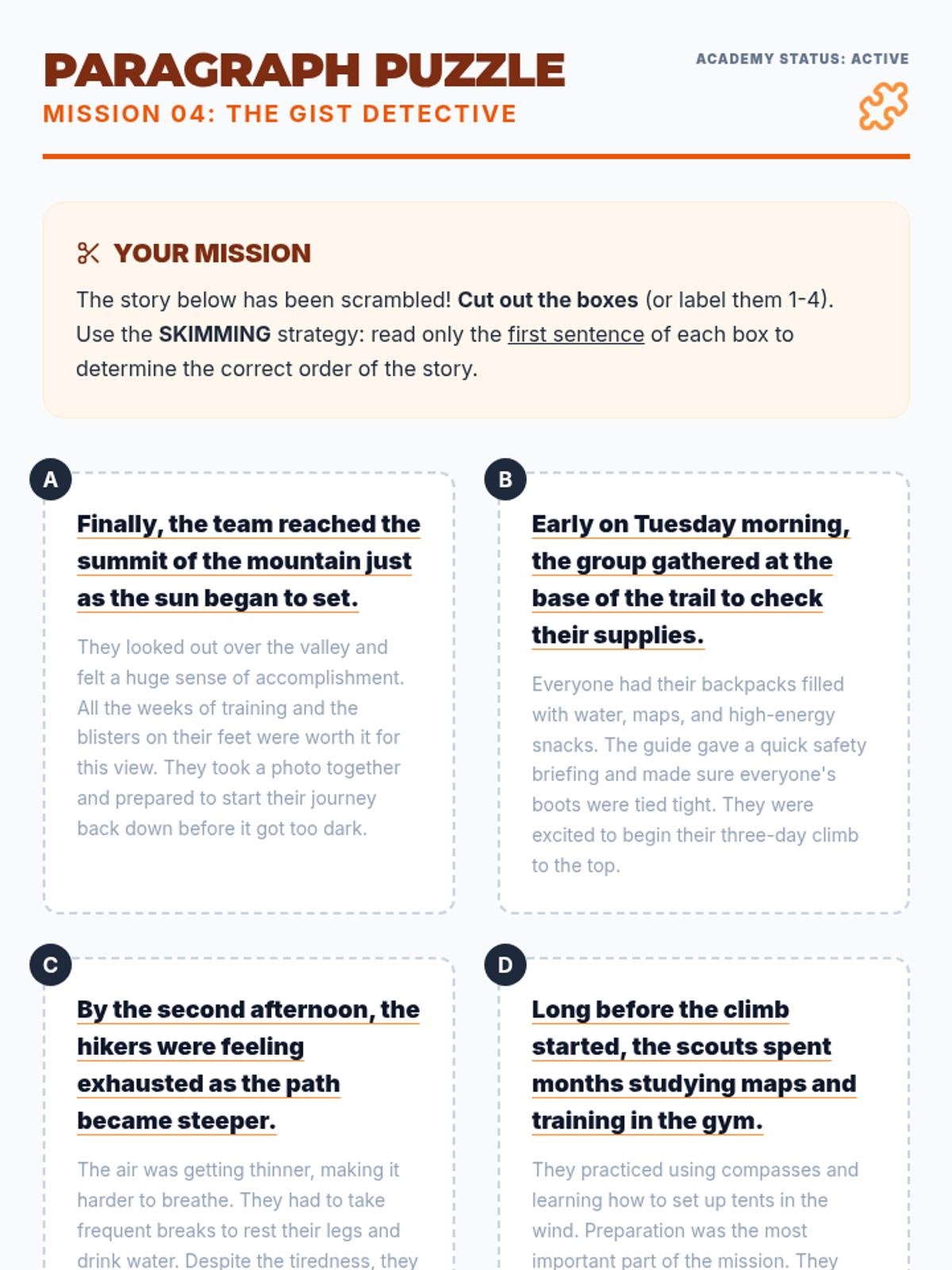 Students explore the fundamental differences between skimming for a general overview and scanning for specific information through interactive sorting and rapid-fire exercises.