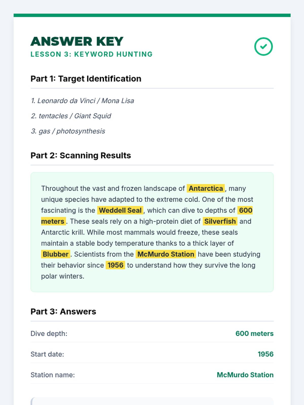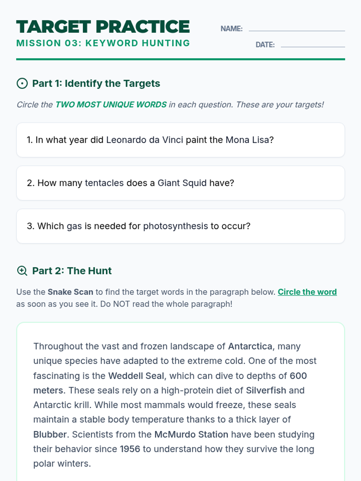Students master the art of identifying high-value keywords in questions and quickly locating them within dense academic passages.