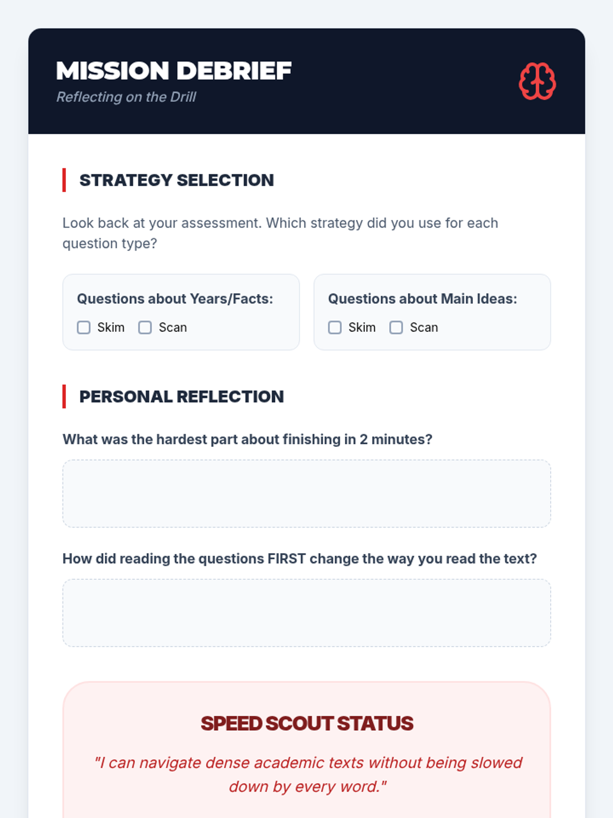 A culminating simulation where students apply their skimming and scanning skills to a timed reading comprehension challenge, followed by a metacognitive reflection.