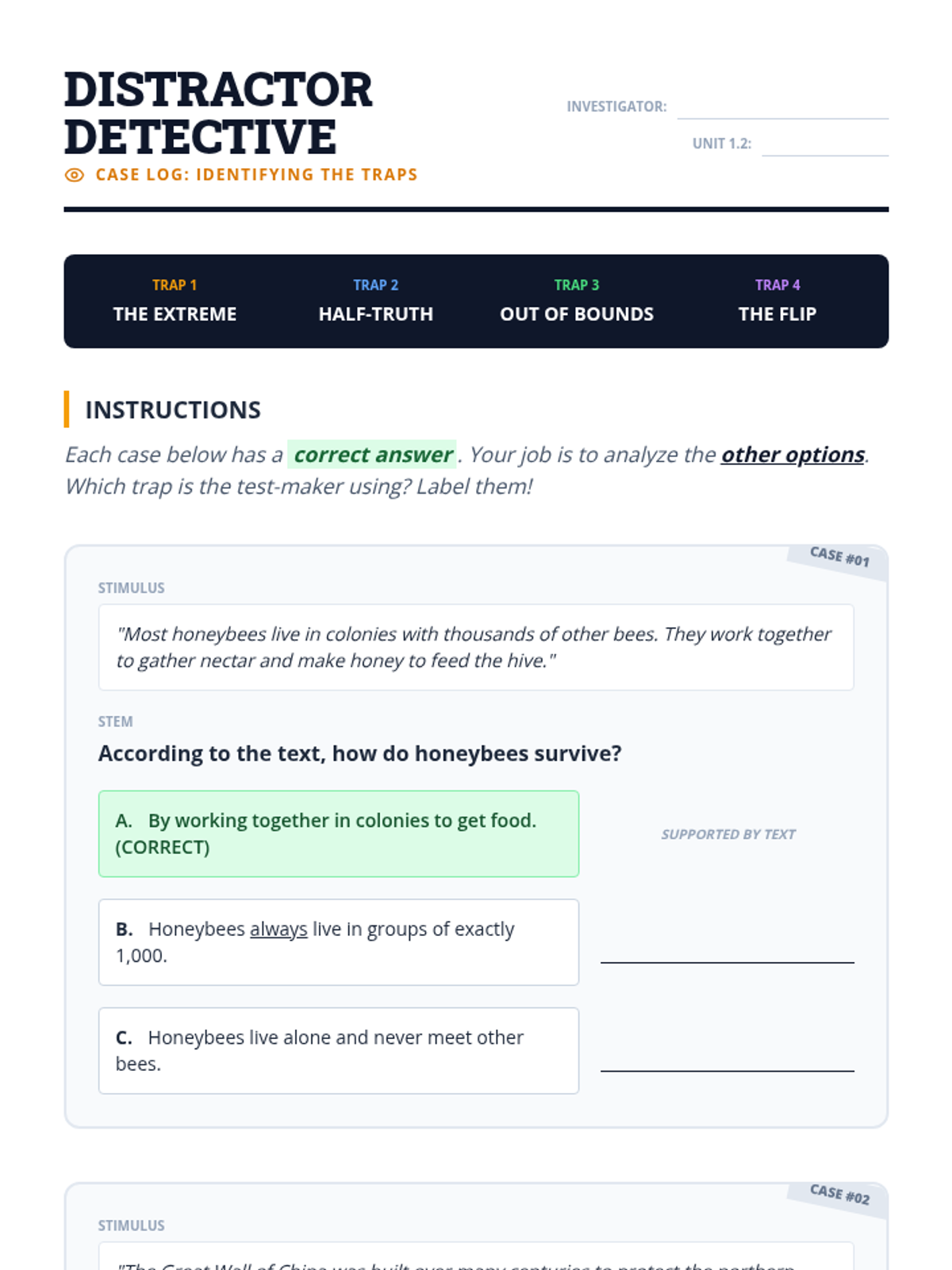 This lesson categorizes common types of wrong answers, such as 'too extreme,' 'partially true,' or 'irrelevant info.' Students label incorrect answers in sample questions with these categories.