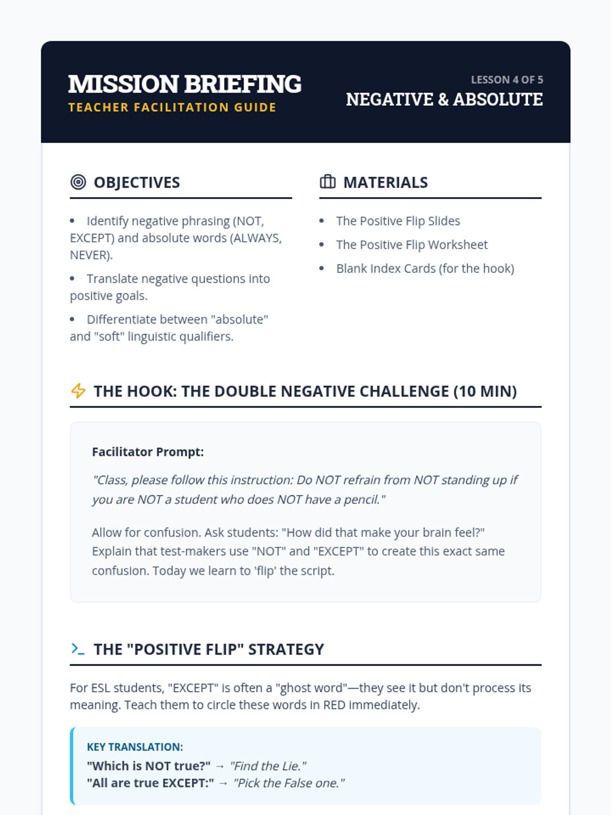 Students specifically target questions using words like 'NOT,' 'EXCEPT,' 'ALWAYS,' or 'NEVER.' They rewrite these questions in positive terms to clarify meaning.