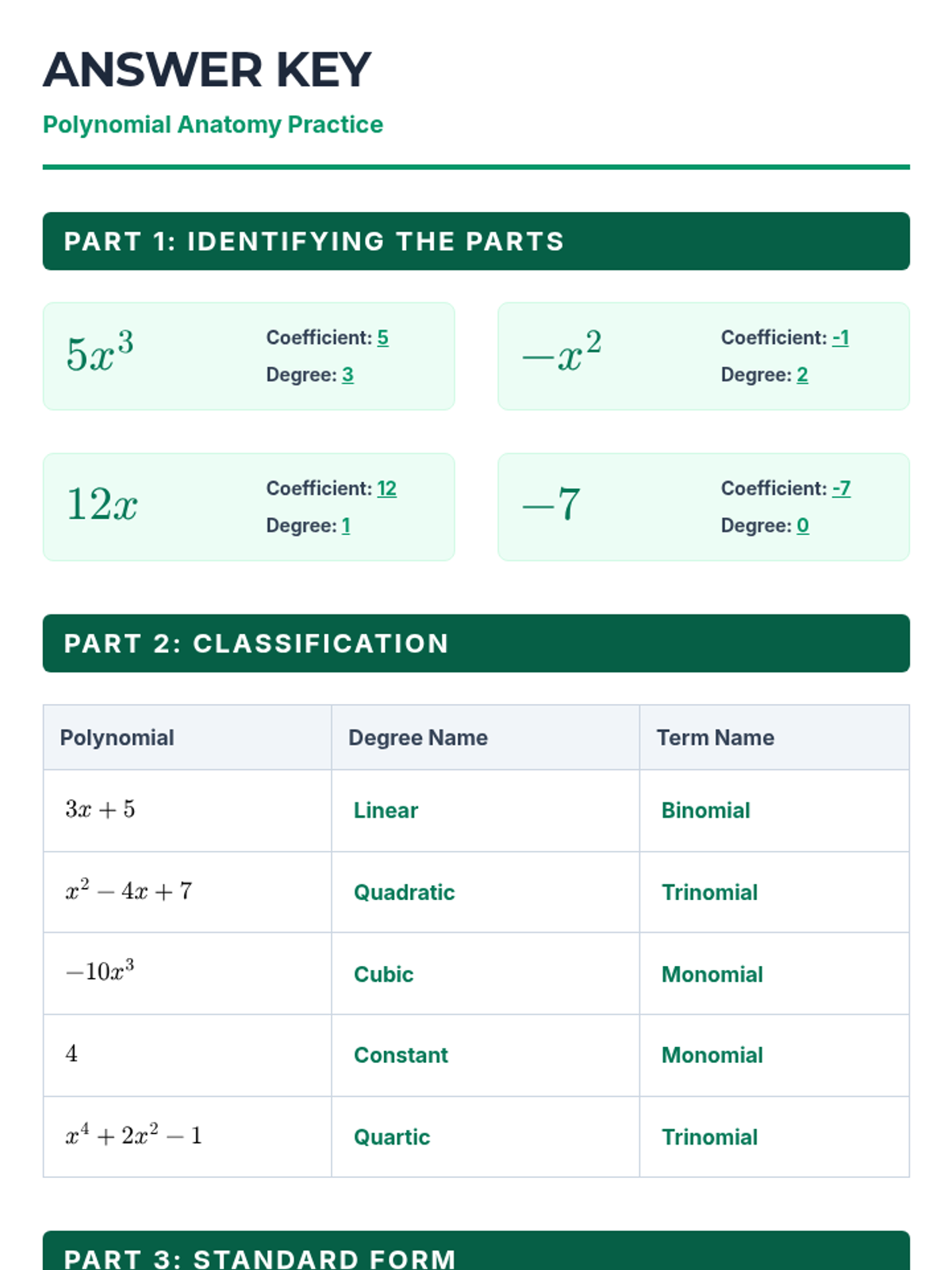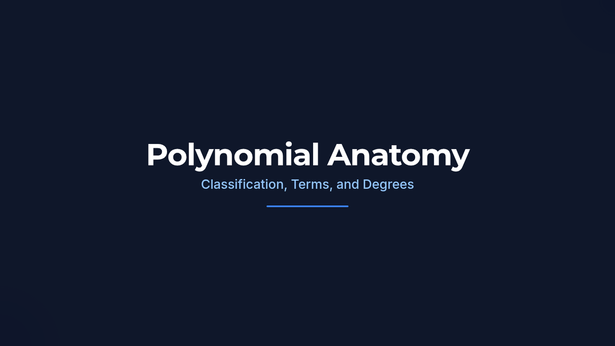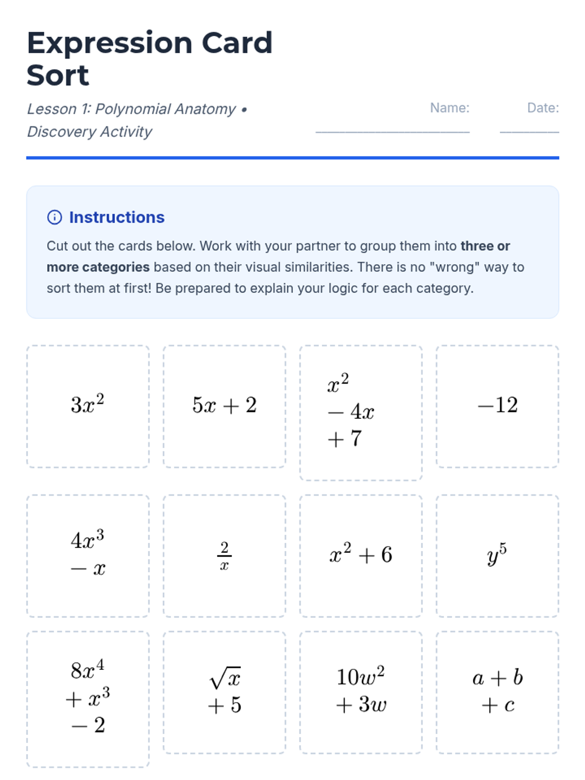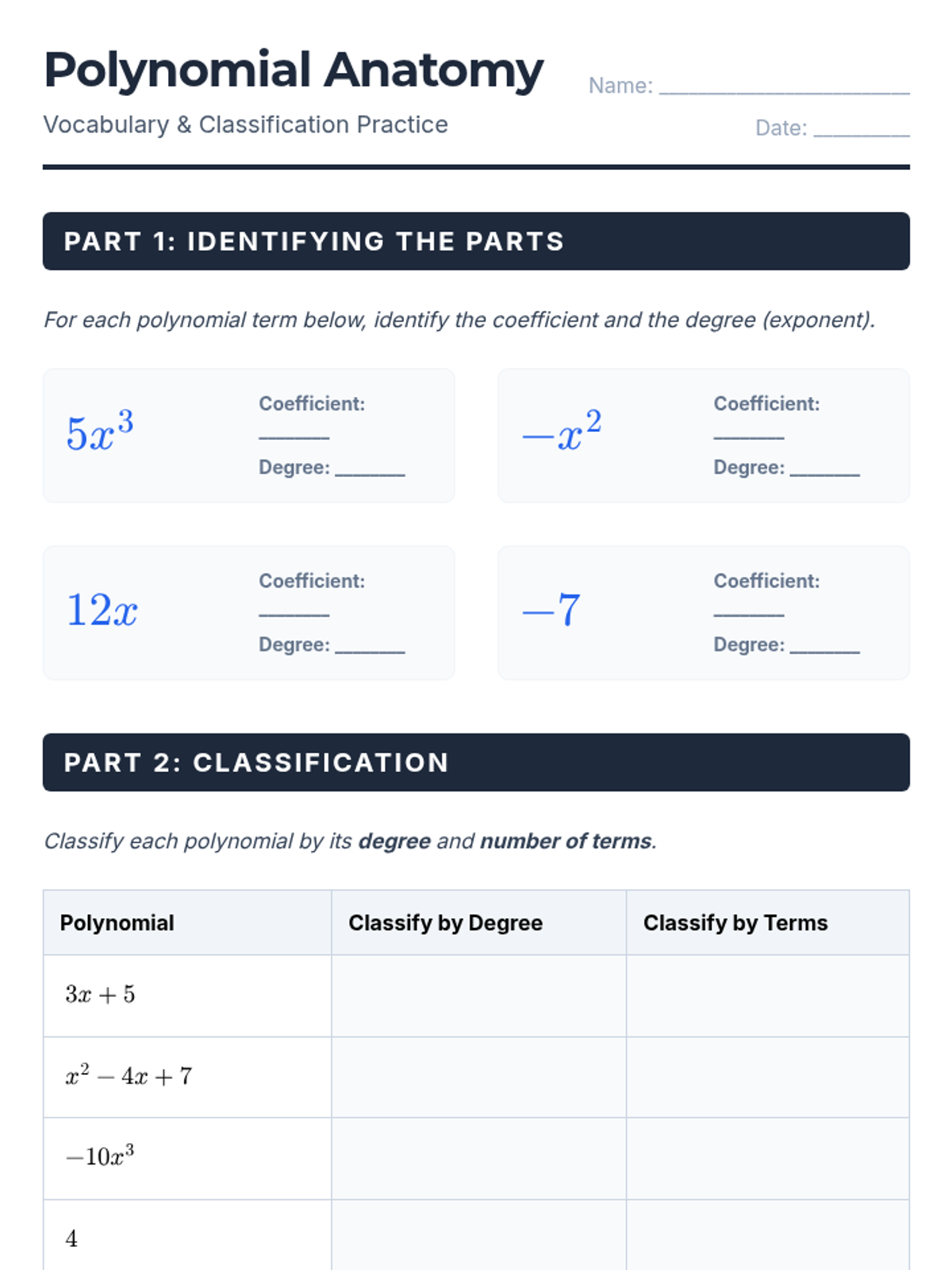 Students define polynomials and identify key features such as coefficients, degree, and leading terms. They practice sorting expressions into categories based on the number of terms and degree.