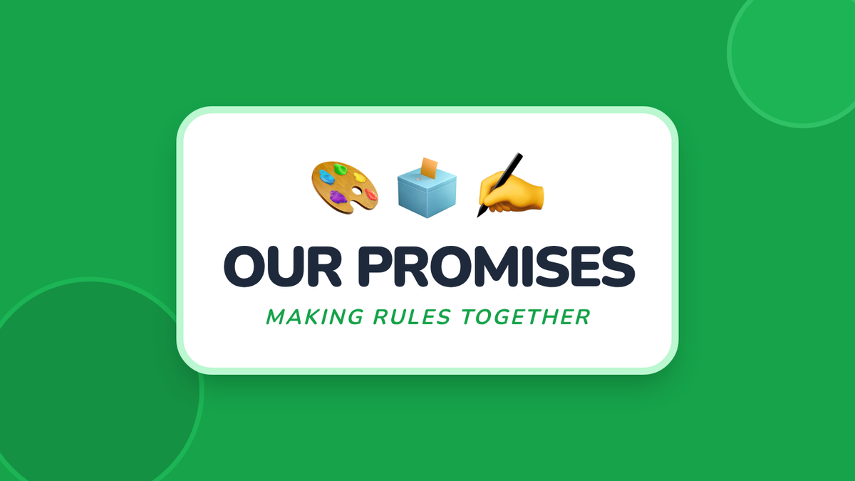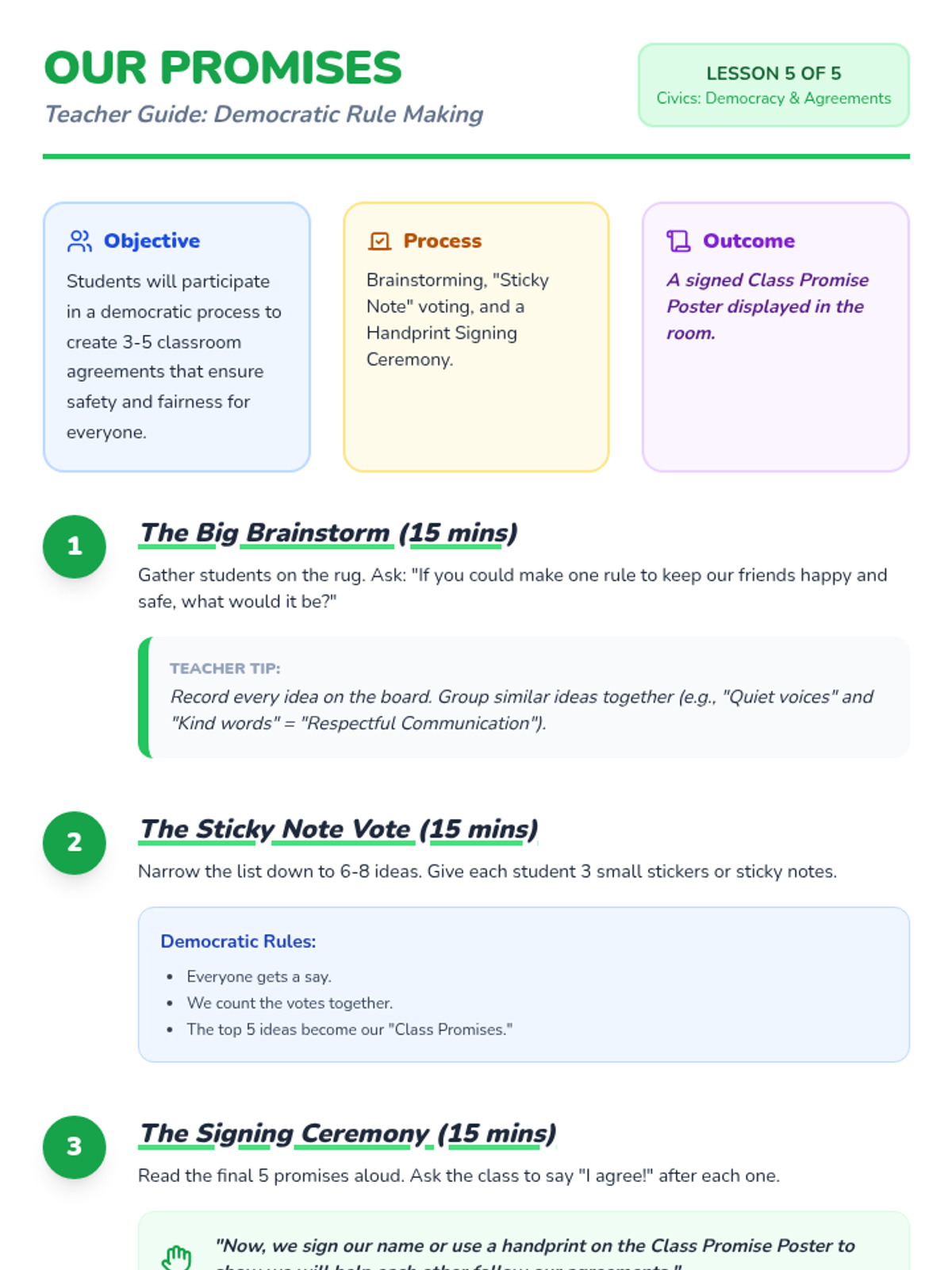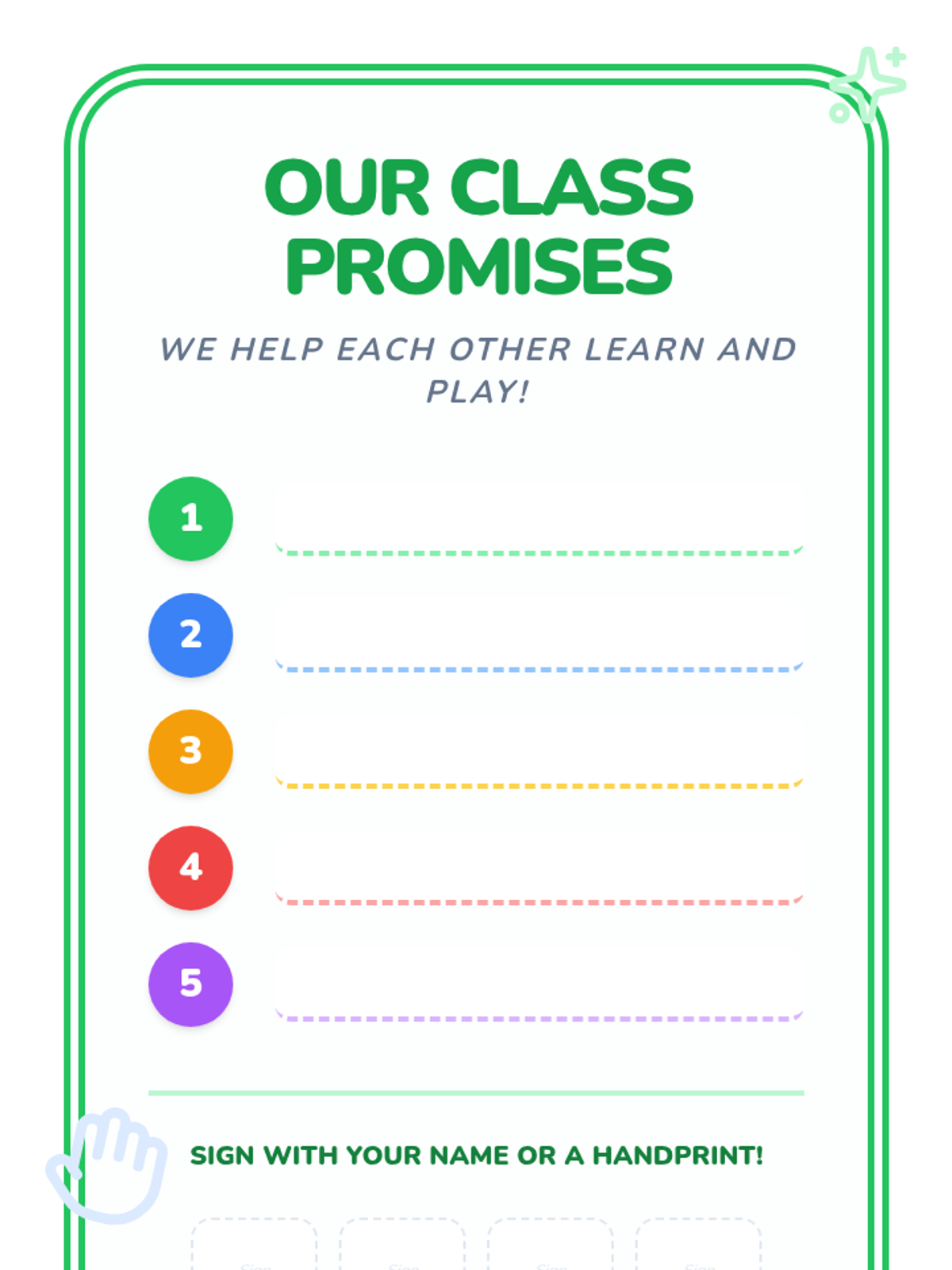 The class participates in a democratic process to create and agree upon a set of classroom rules or 'promises'.