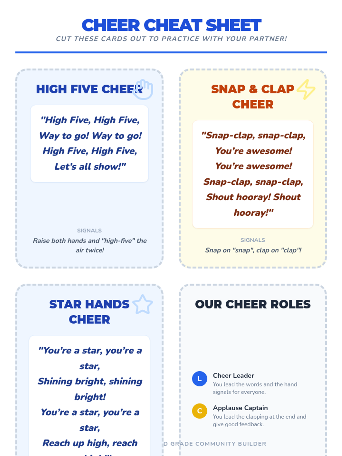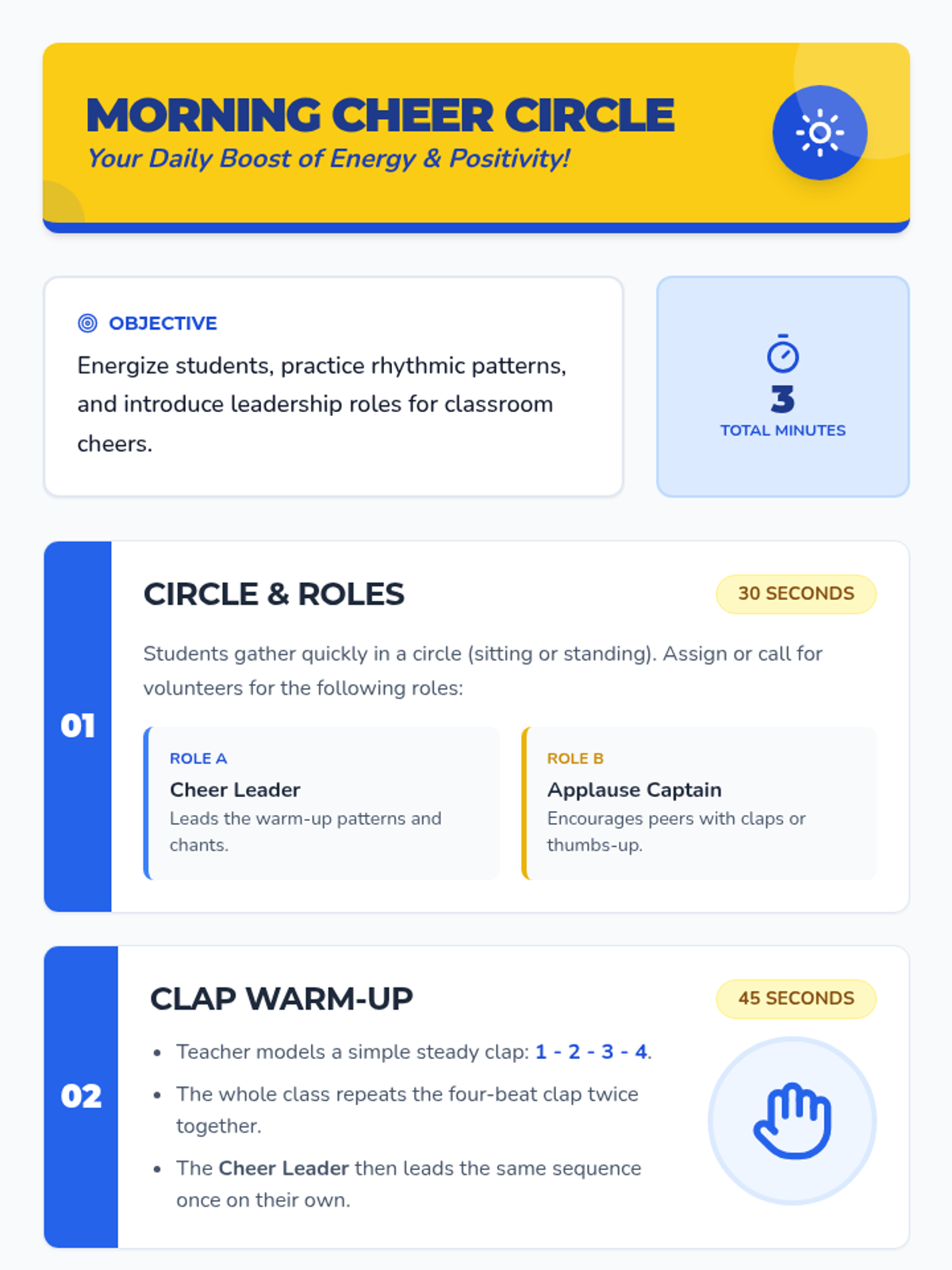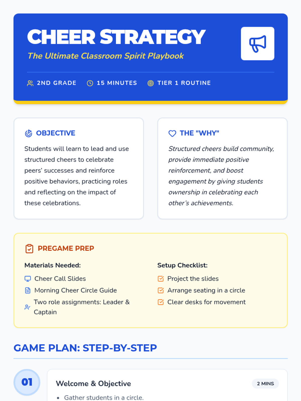 An energizing 15-minute Tier 1 routine for 2nd graders to signal successes and reinforce positive behaviors through celebratory cheers.
