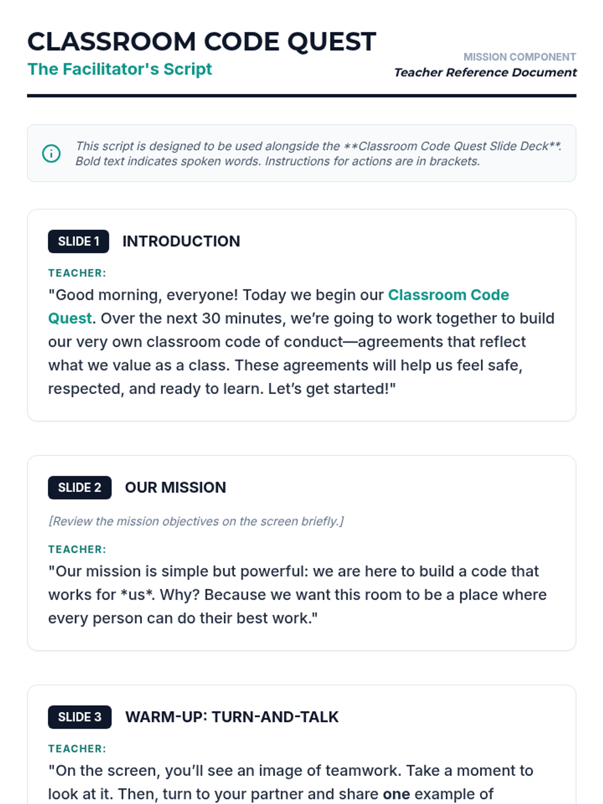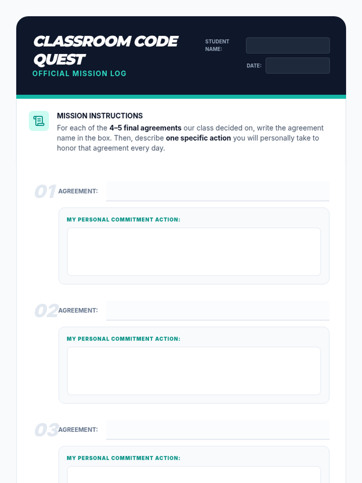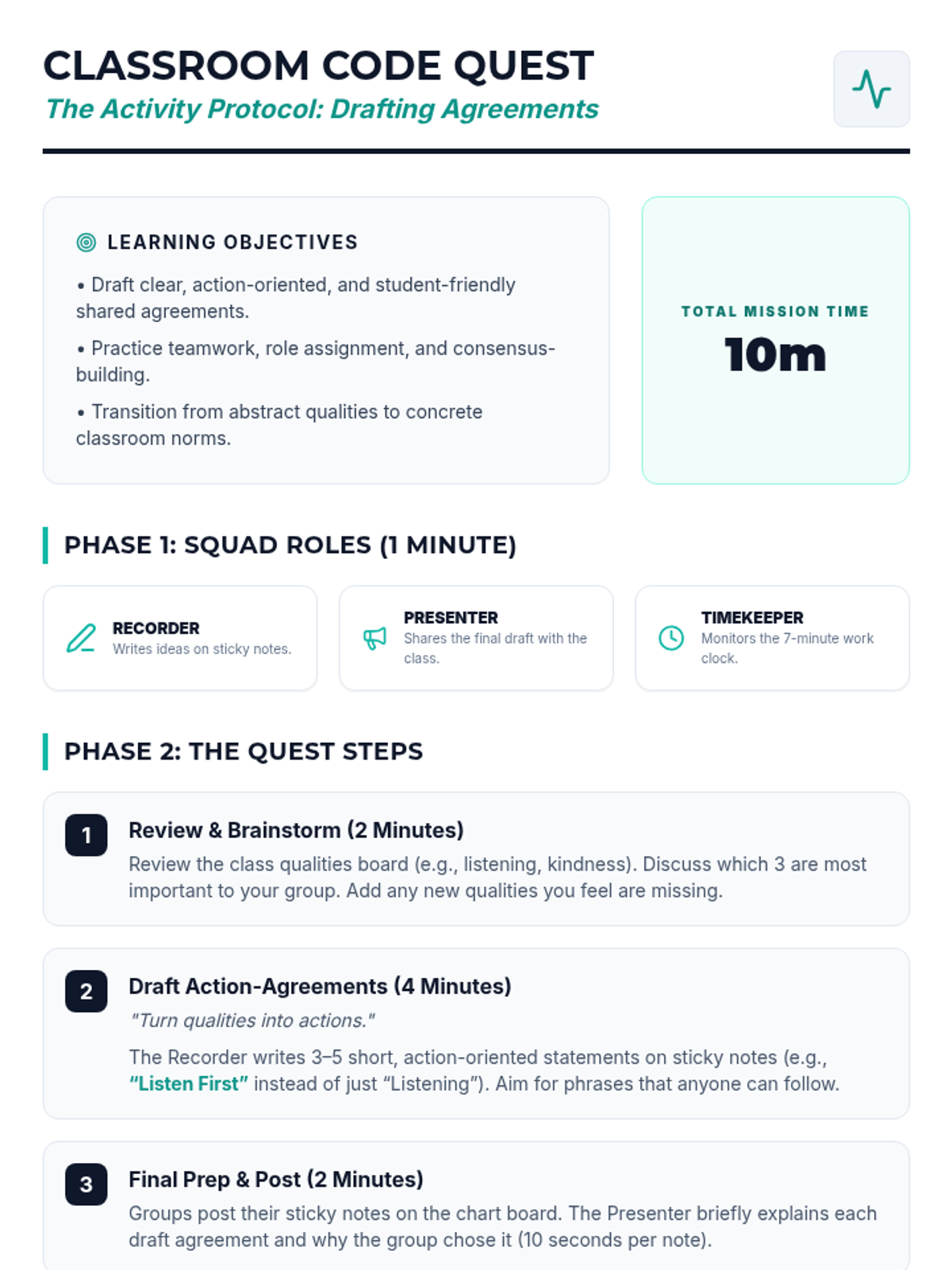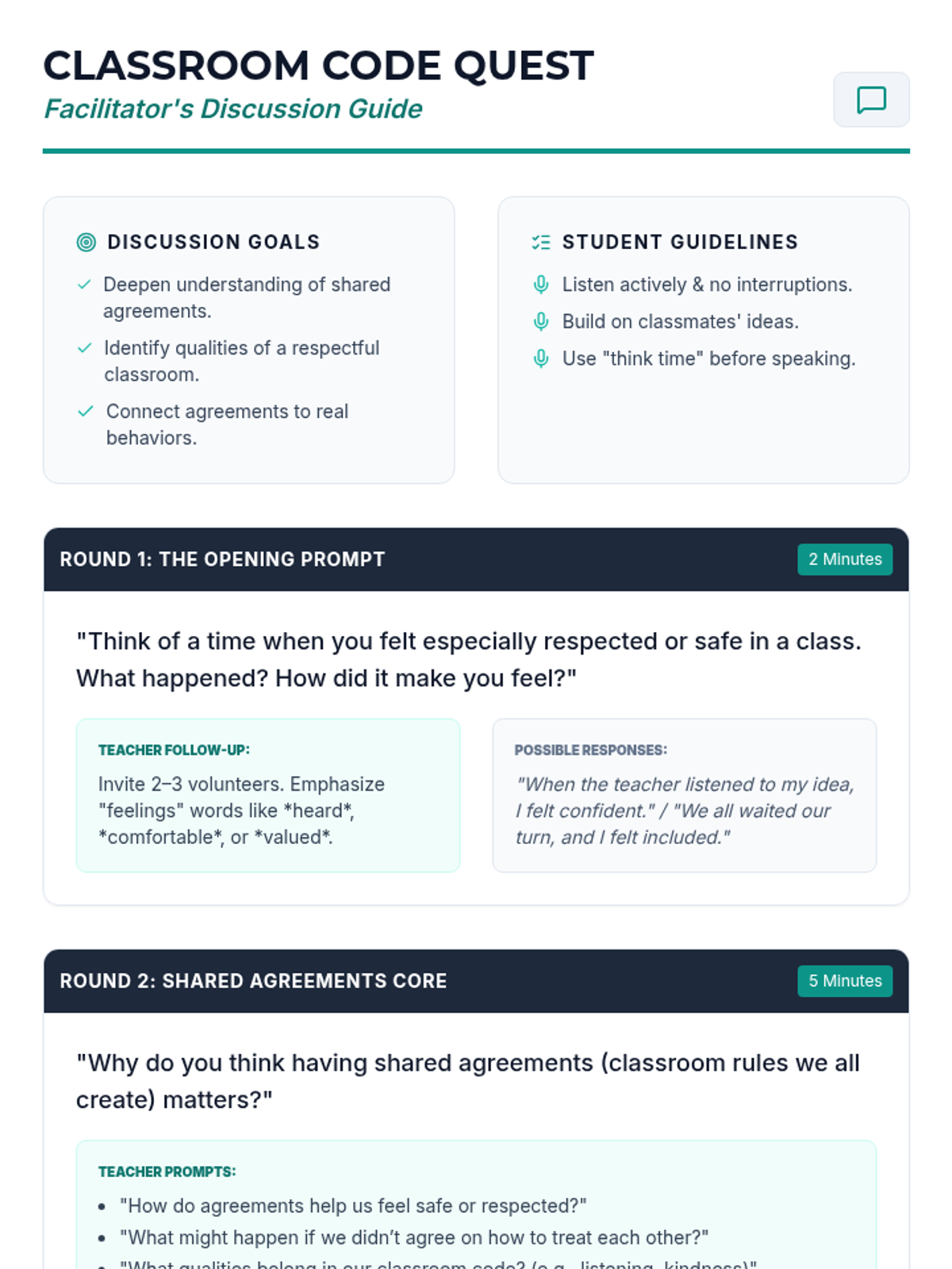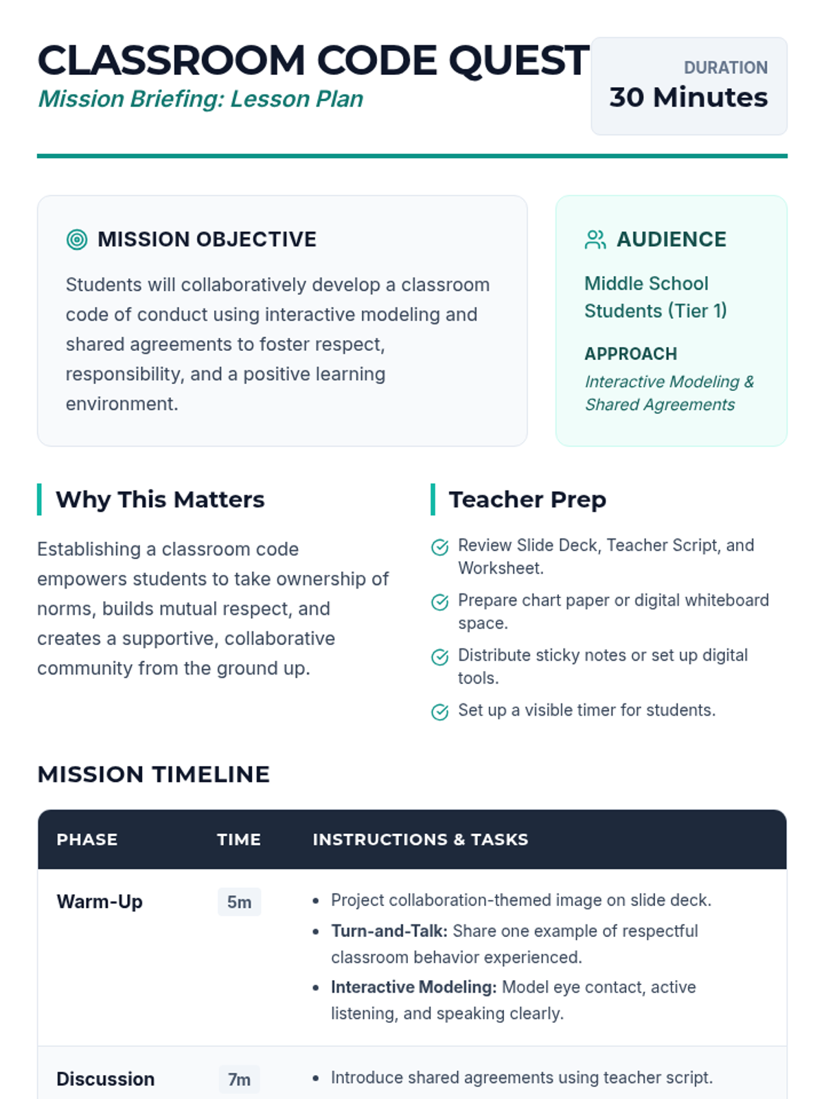 A 30-minute Tier 1 responsive classroom lesson for middle schoolers to collaboratively build a positive environment through shared agreements and interactive modeling.