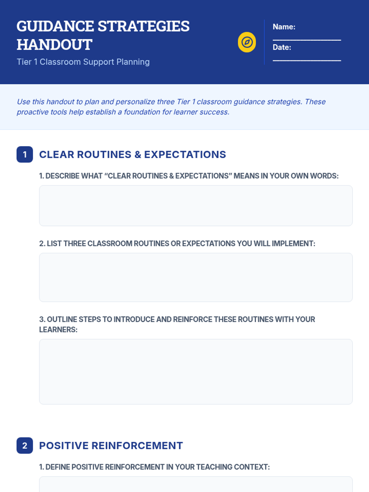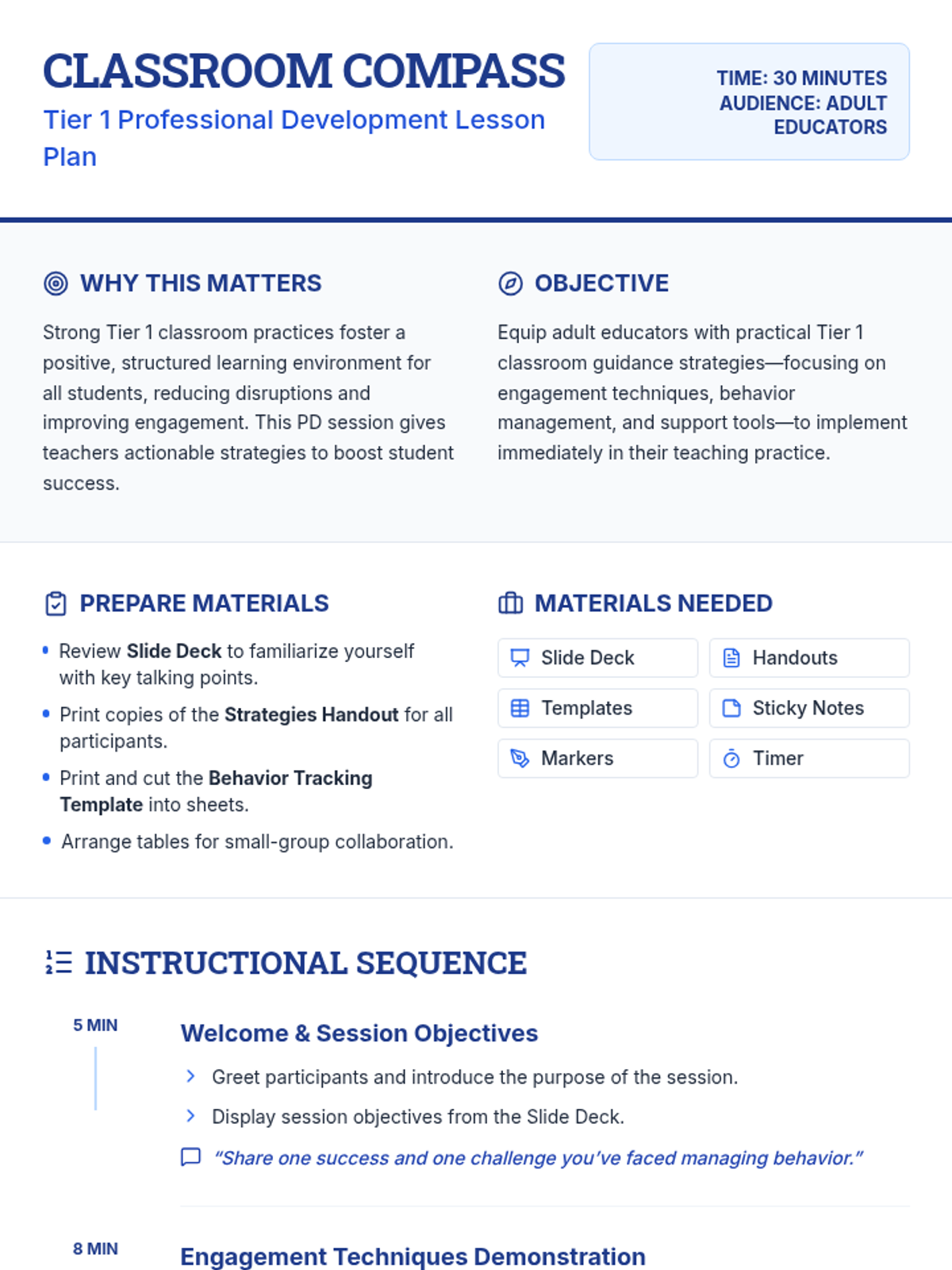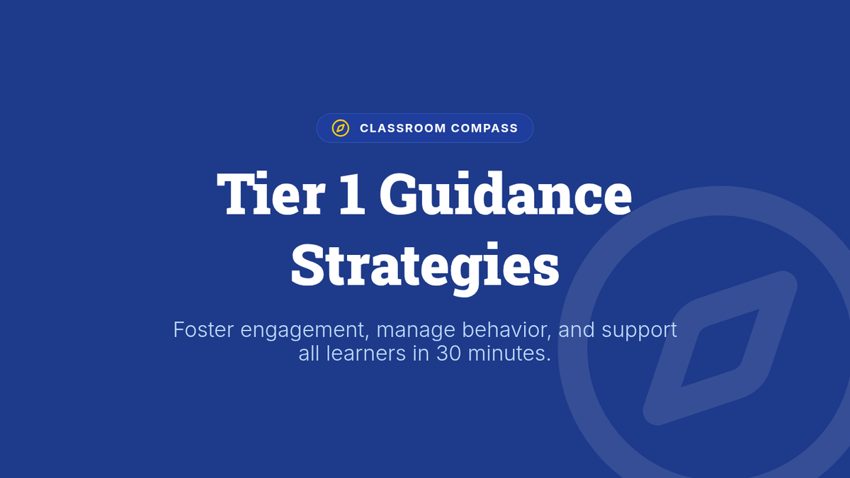 A 30-minute professional development session for adult educators focused on Tier 1 classroom guidance strategies, engagement techniques, and behavior management tools.