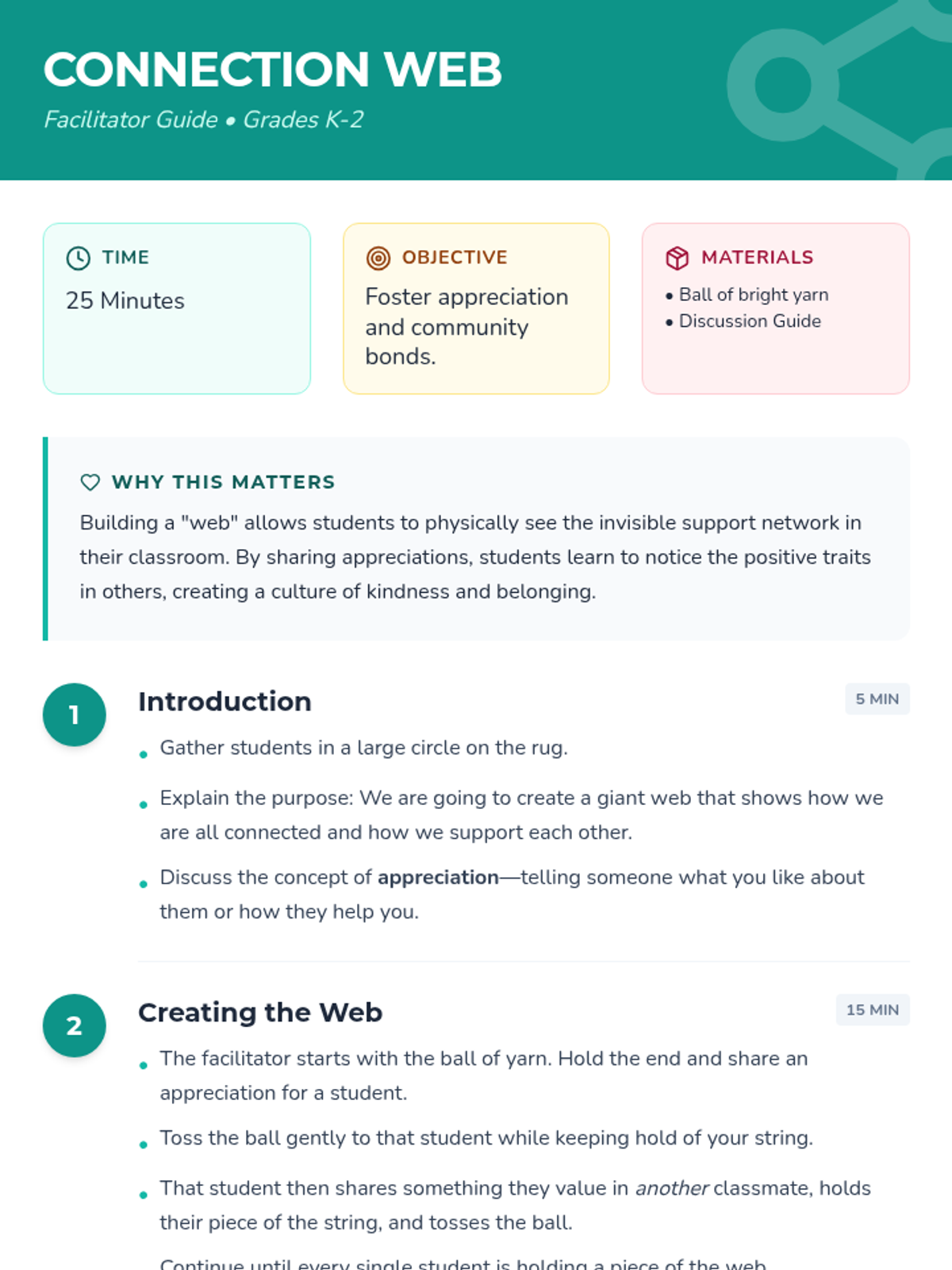 Students build a physical yarn web to visualize their classroom's support network, sharing appreciations for one another to foster a sense of belonging and community.