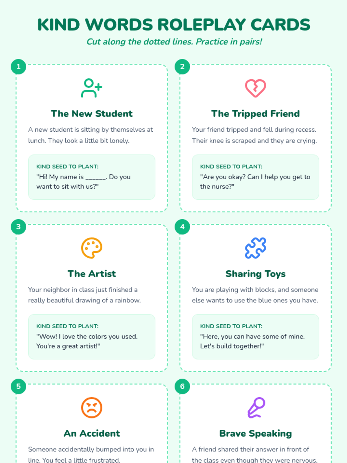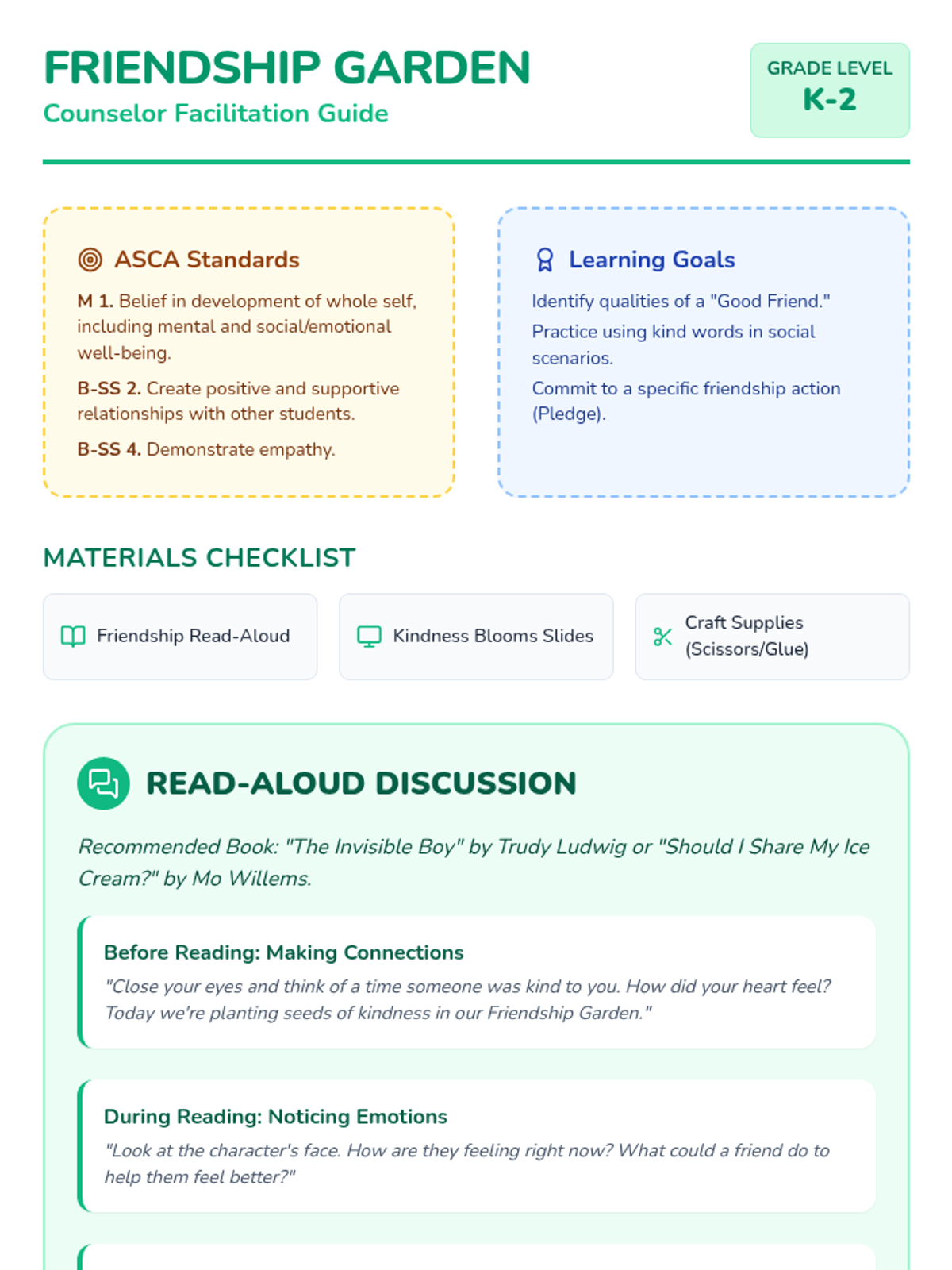 A comprehensive lesson for K-2 students focused on developing essential friendship skills, practicing empathy, and using kind words through a 'Kindness Garden' theme. Aligned with ASCA Social/Emotional standards.