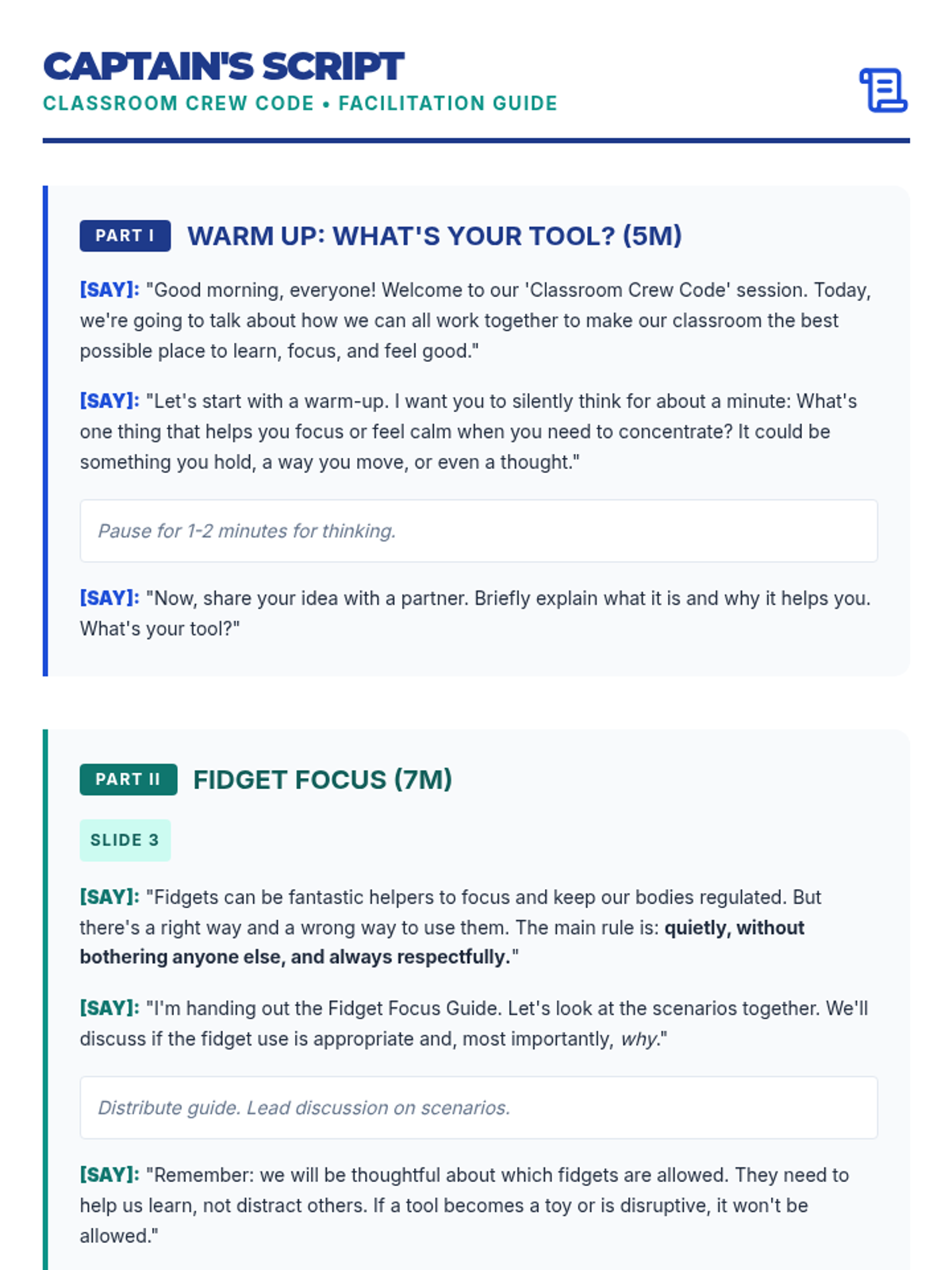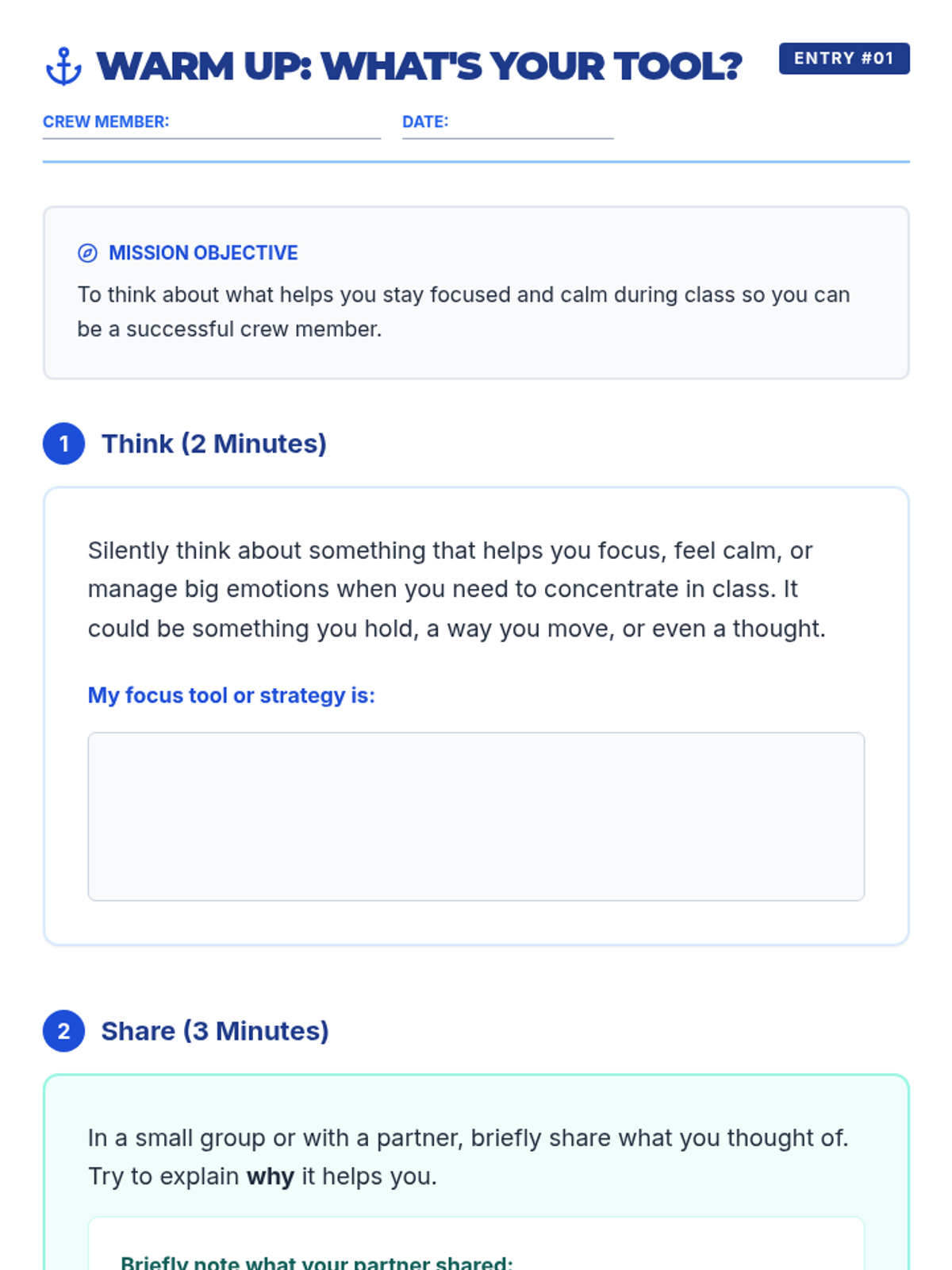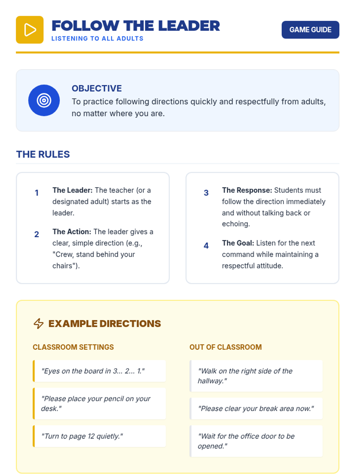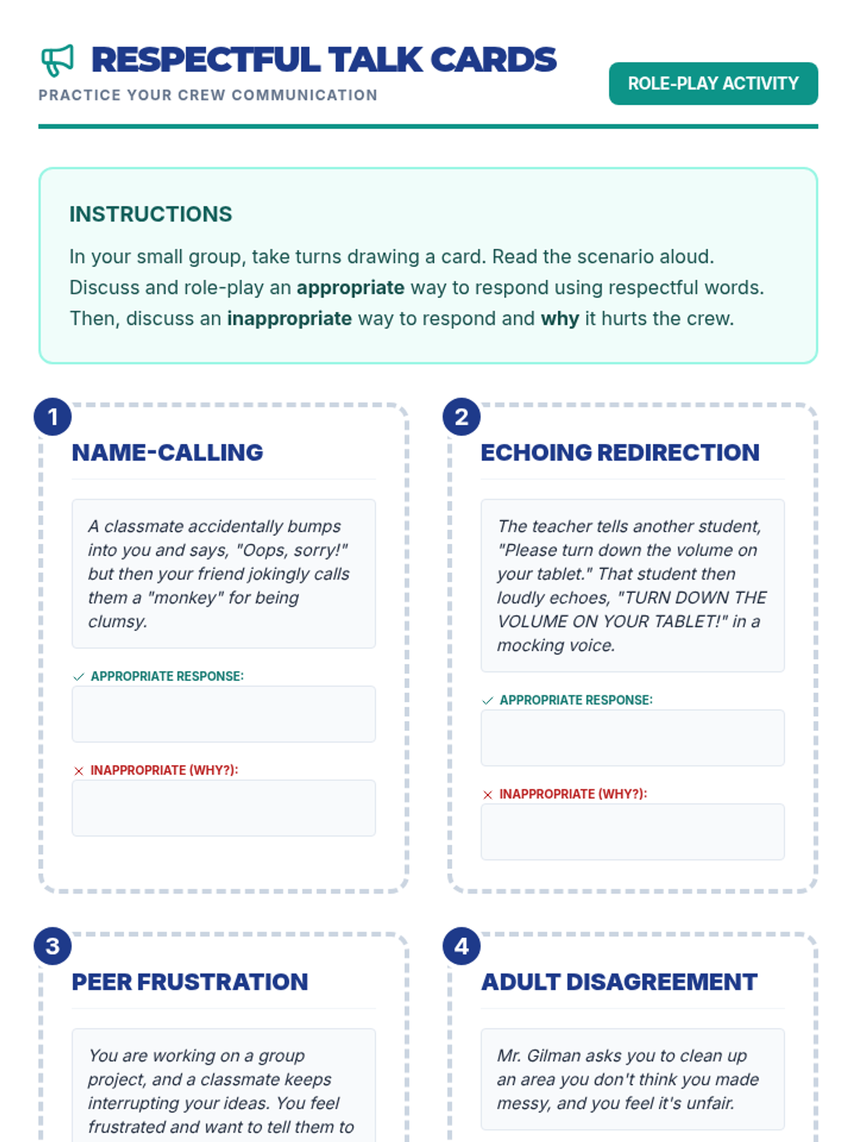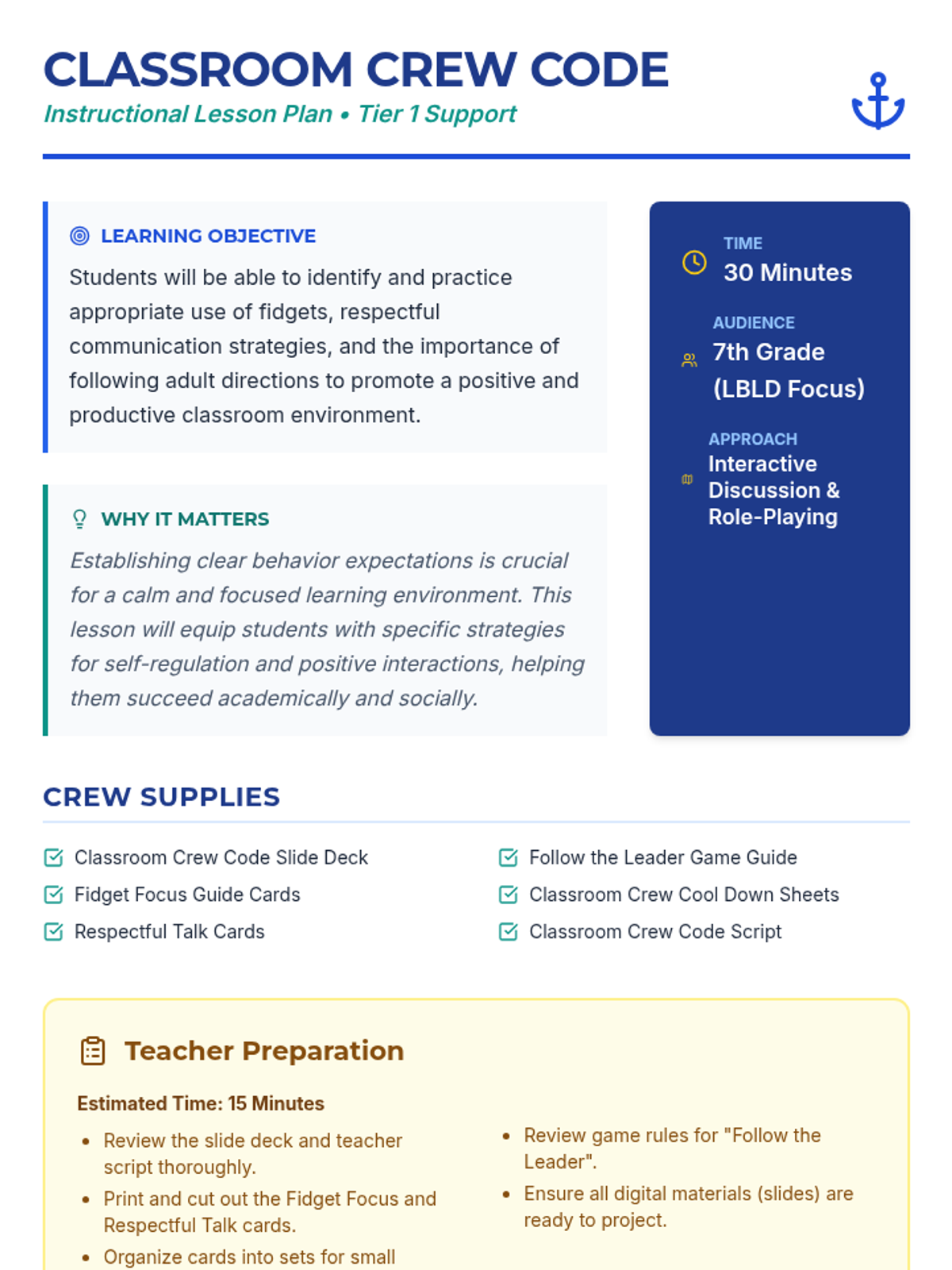 A 30-minute Tier 1 lesson for 7th-grade students with language-based learning disabilities focused on self-regulation, respectful communication, and following adult directions.