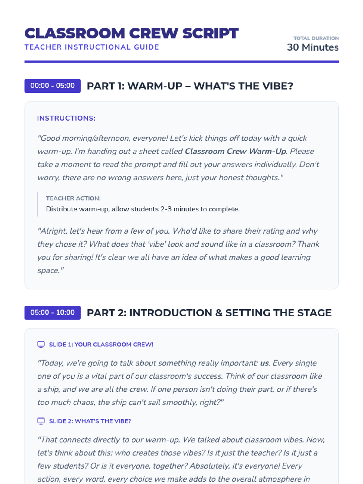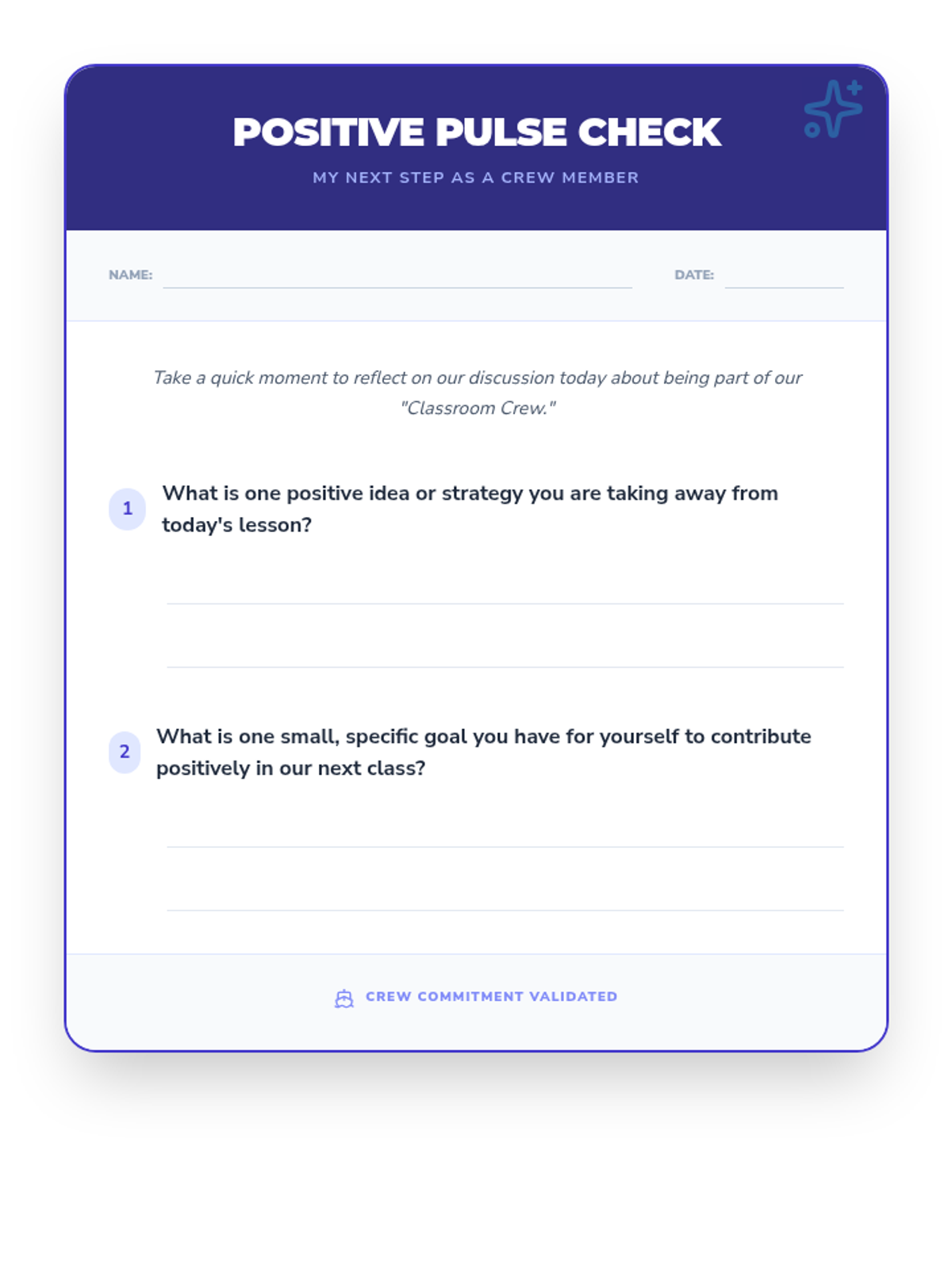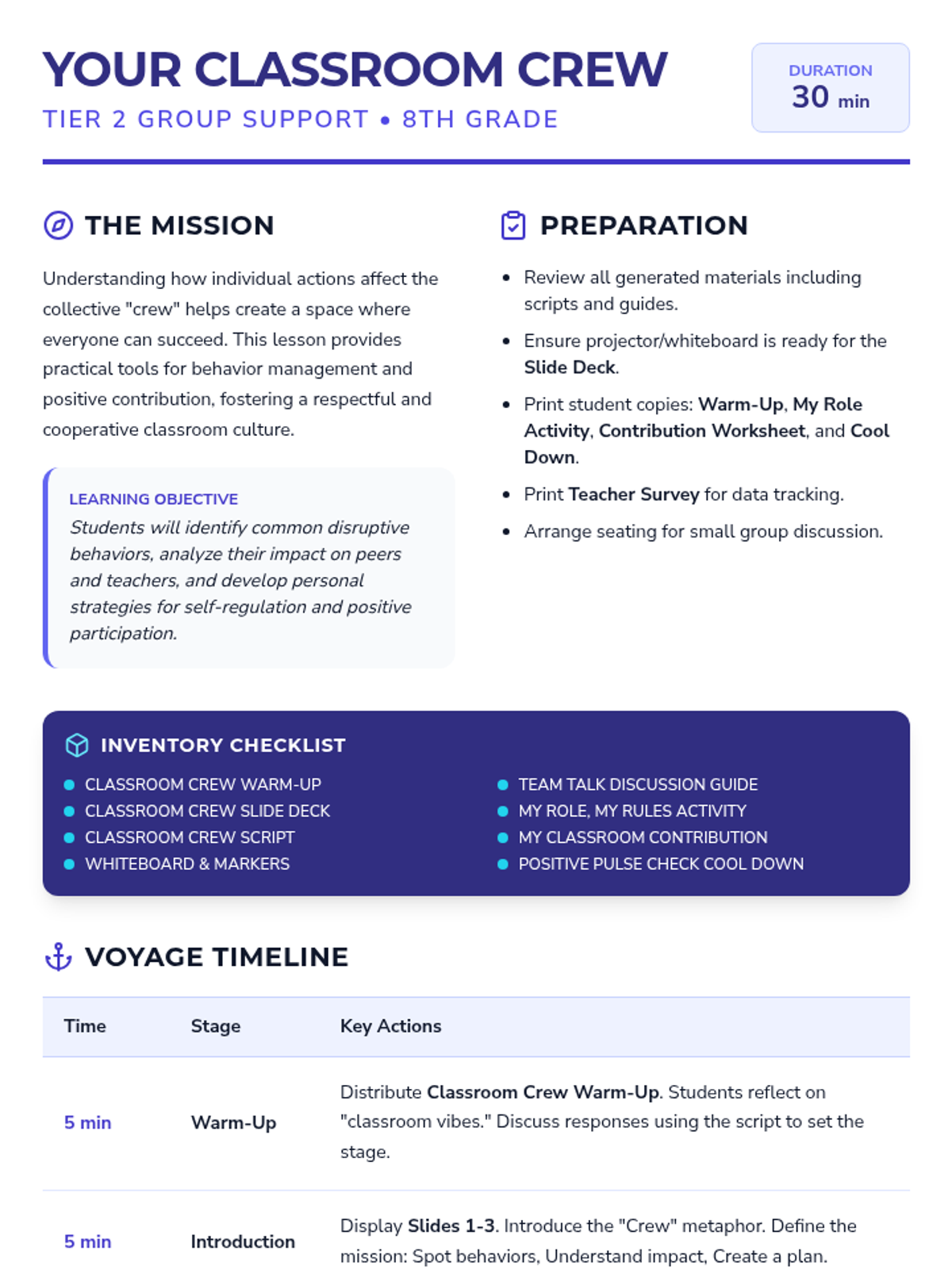 A 30-minute Tier 2 lesson for 8th-grade students to understand the impact of their classroom behaviors and develop self-management strategies using a 'Crew' metaphor.