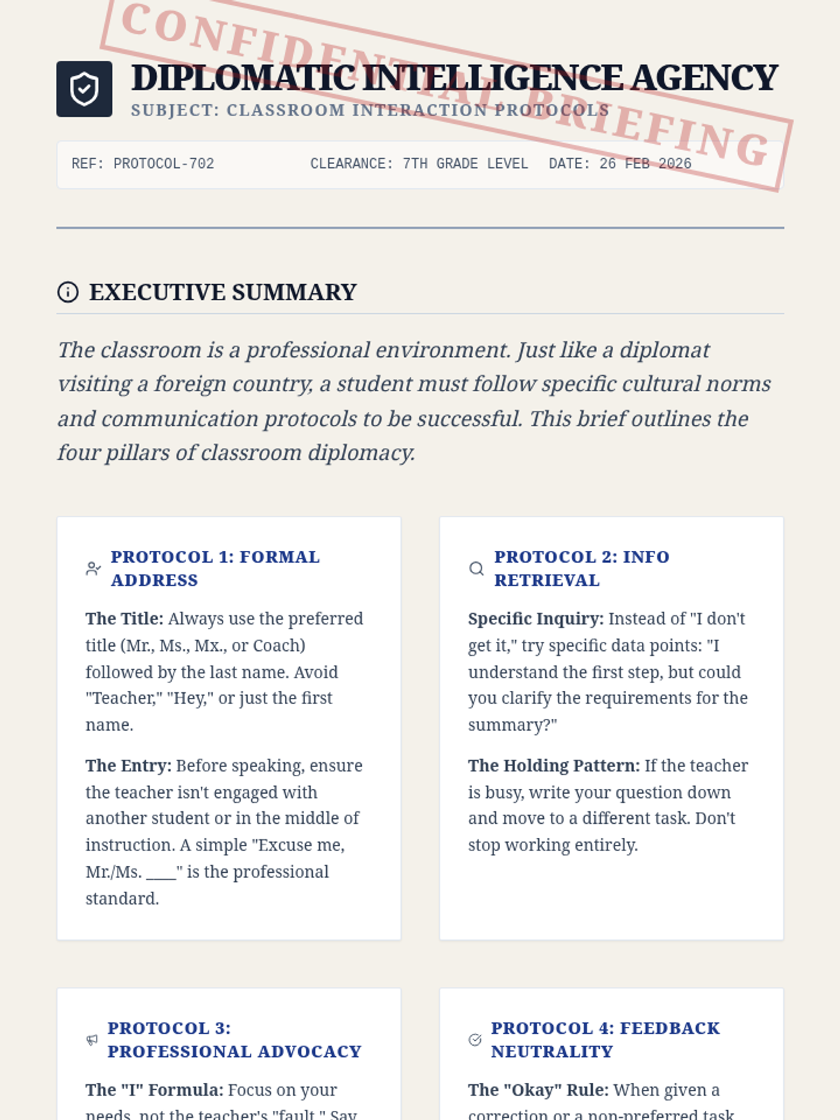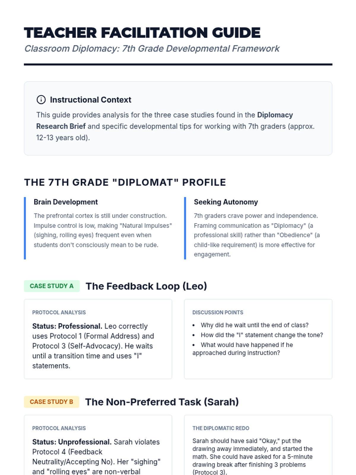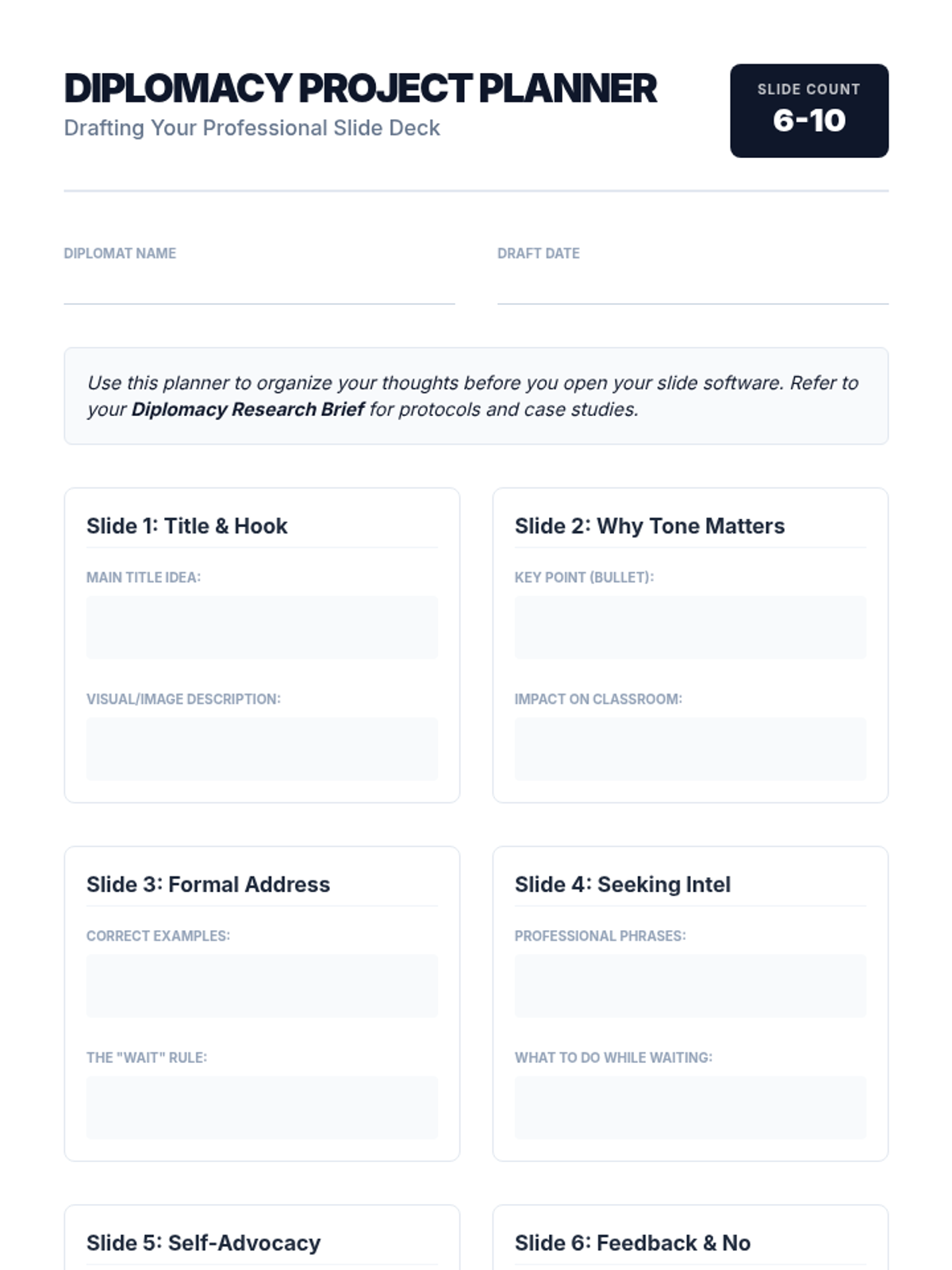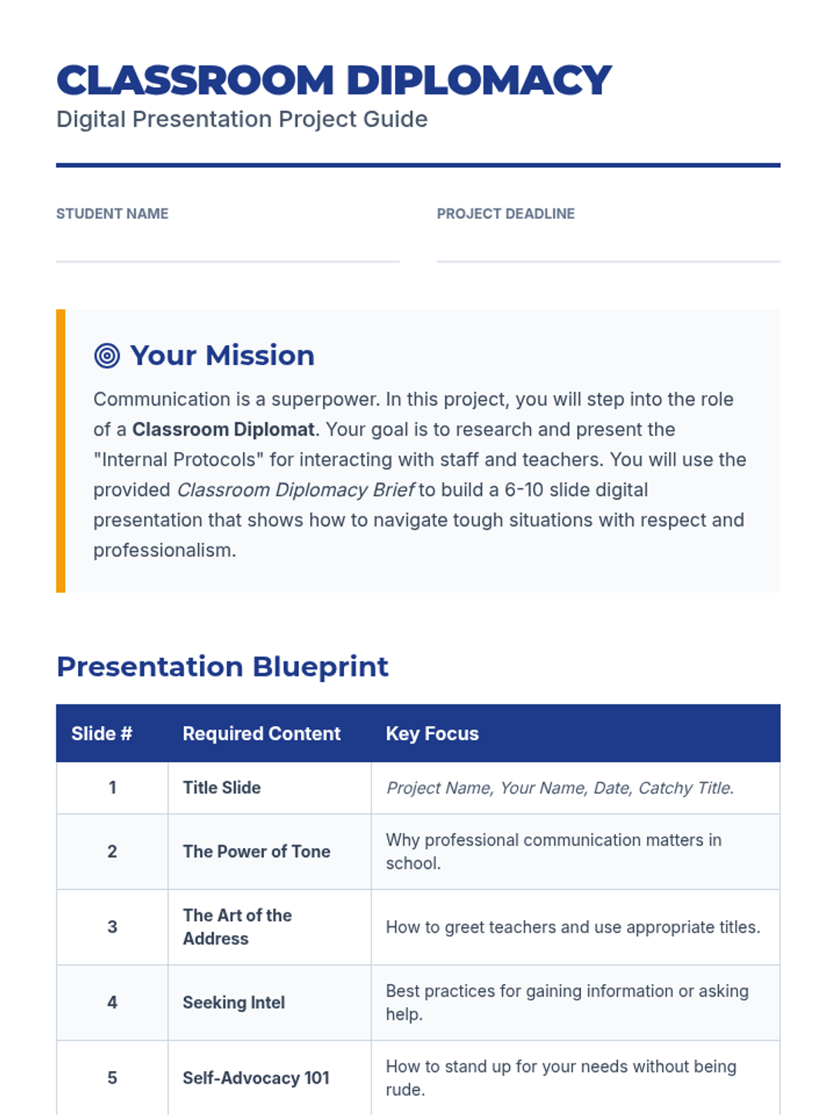 A comprehensive project where students research and present on professional classroom communication, including self-advocacy and accepting feedback. Students will use provided case studies and reading passages to create a 6-10 slide presentation demonstrating their growth and understanding of respectful teacher-student interactions.