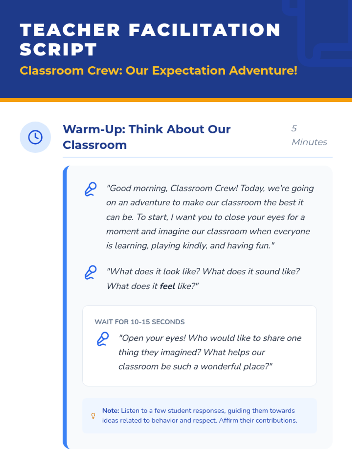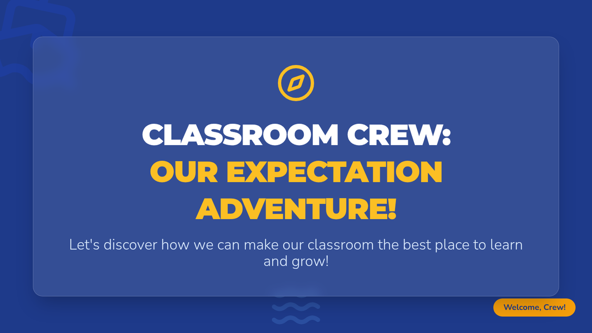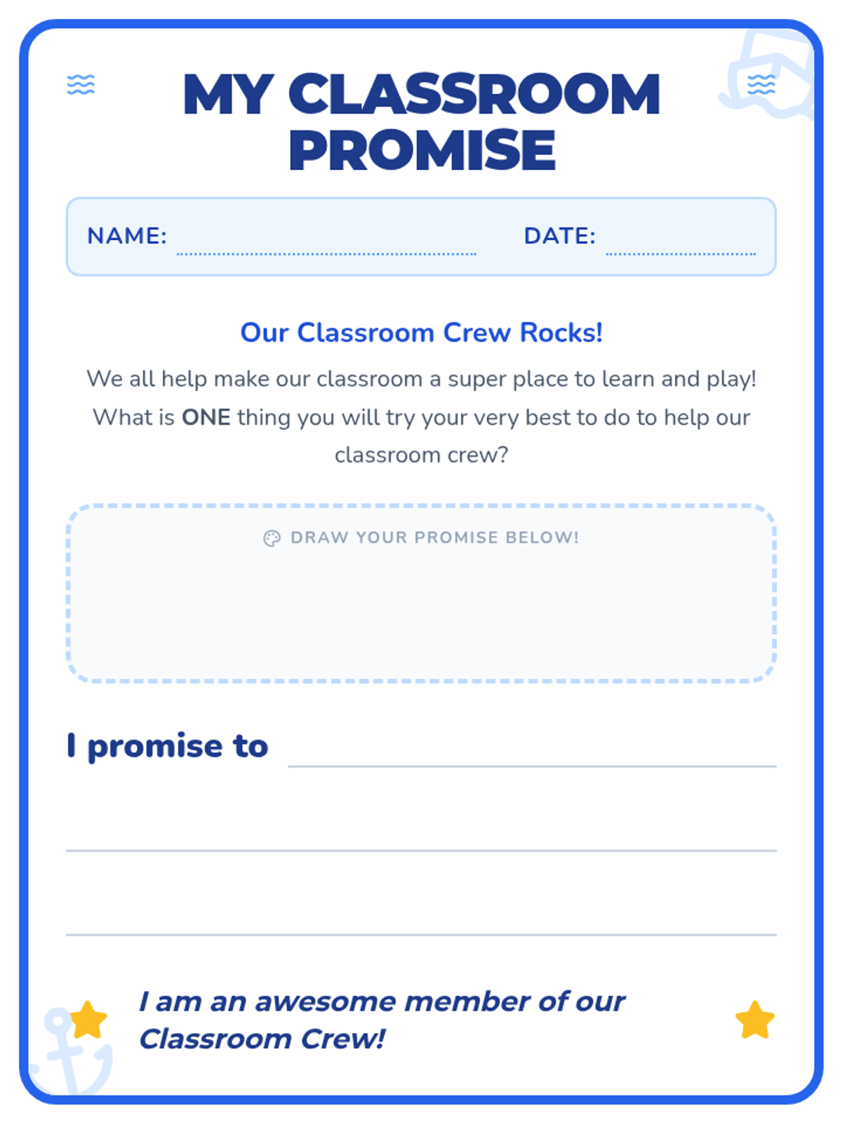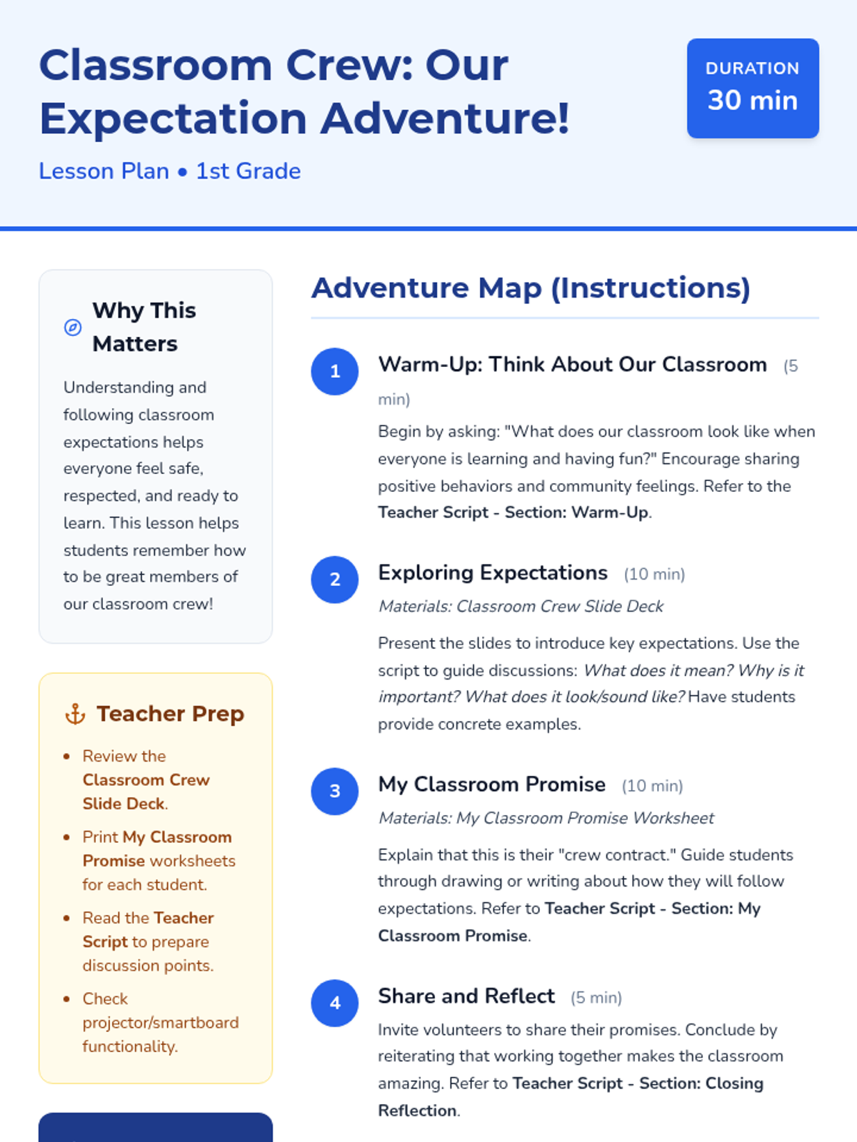 An engaging 30-minute lesson for first graders to review classroom expectations through a 'Classroom Crew' adventure theme, featuring a slide deck, script, and interactive promise worksheet.