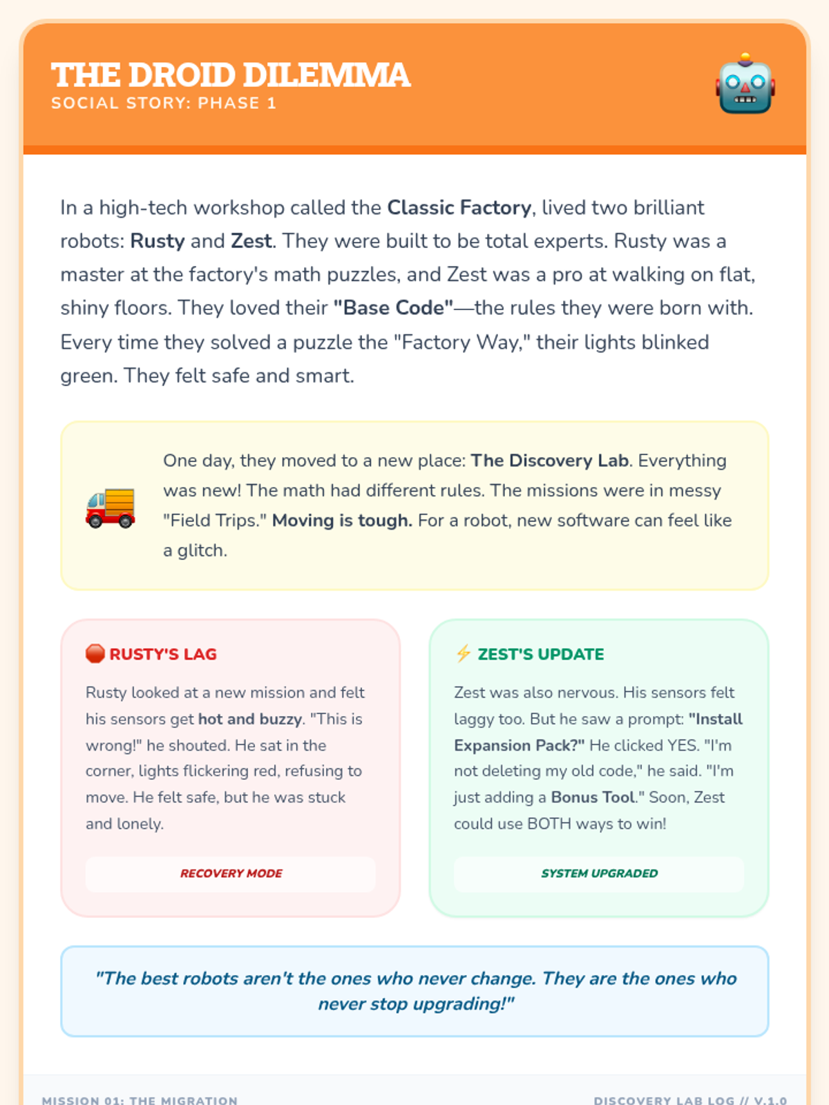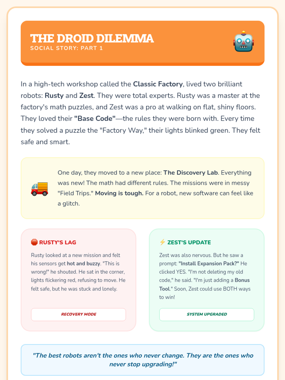 A social story and reflection lesson designed for neurodivergent students to encourage flexibility and growth through a relatable robot metaphor.