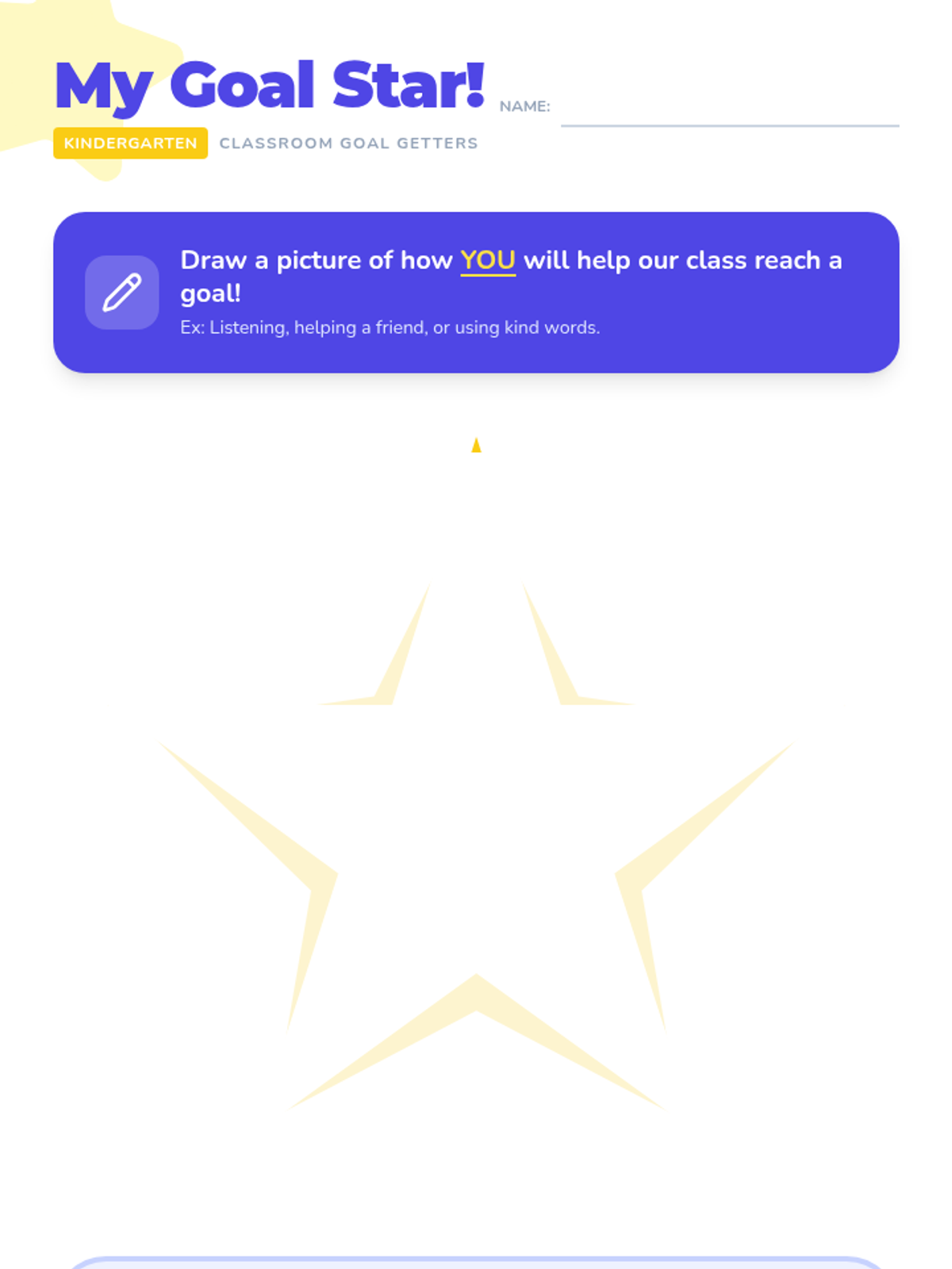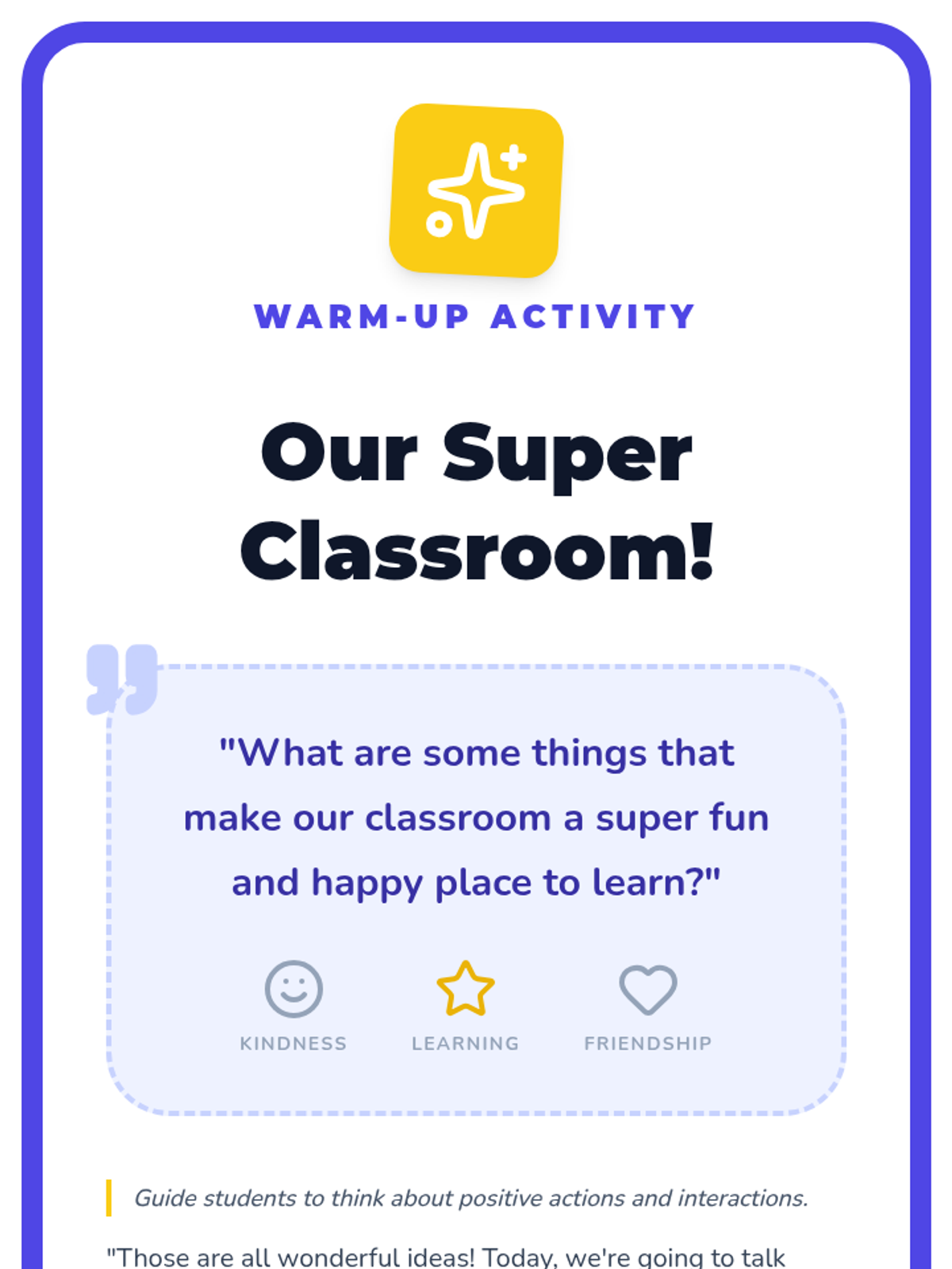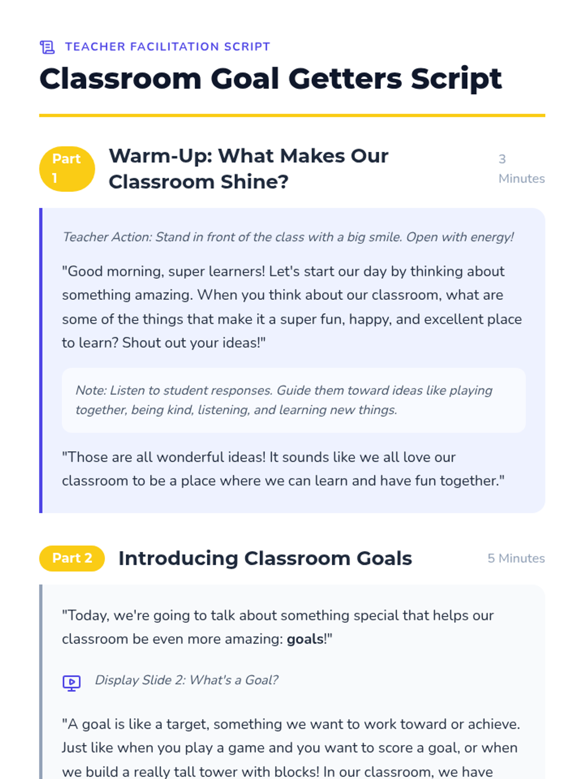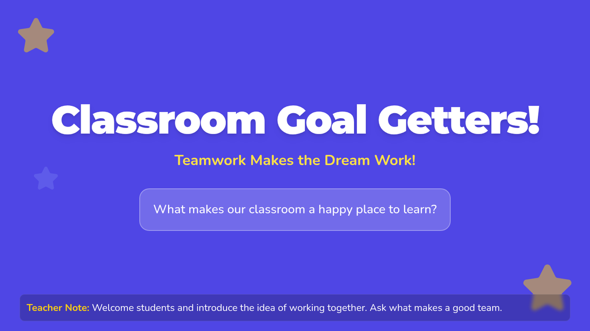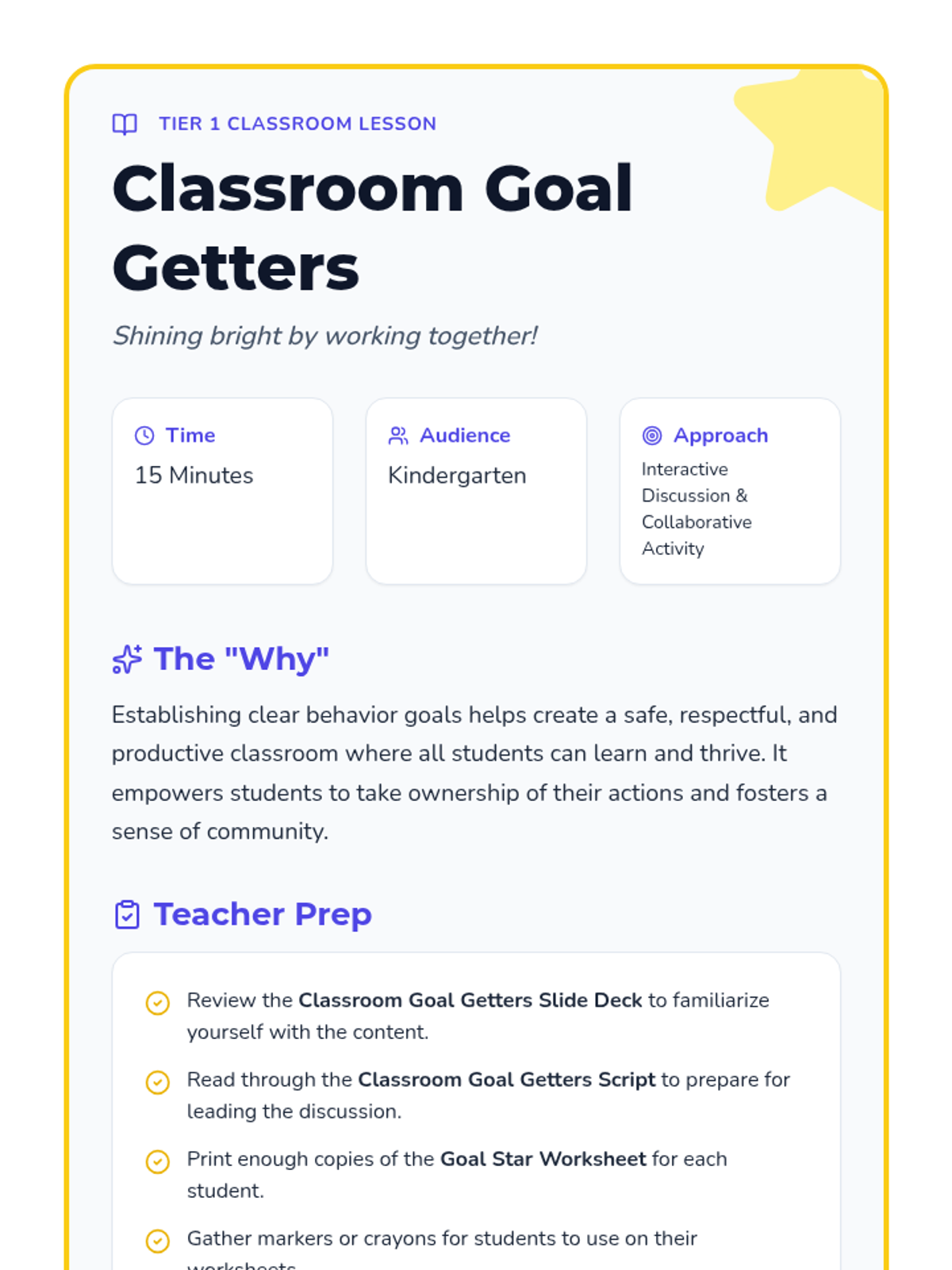 A 15-minute Tier 1 classroom lesson for Kindergarten students to learn about classroom behavior goals, cooperation, and their role in a positive learning environment.