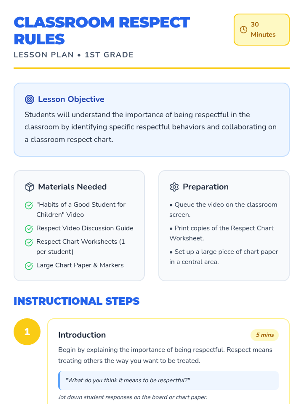 A 30-minute lesson for 1st graders that explores the importance of respect in the classroom using a video, guided discussion, and a collaborative chart-making activity.
