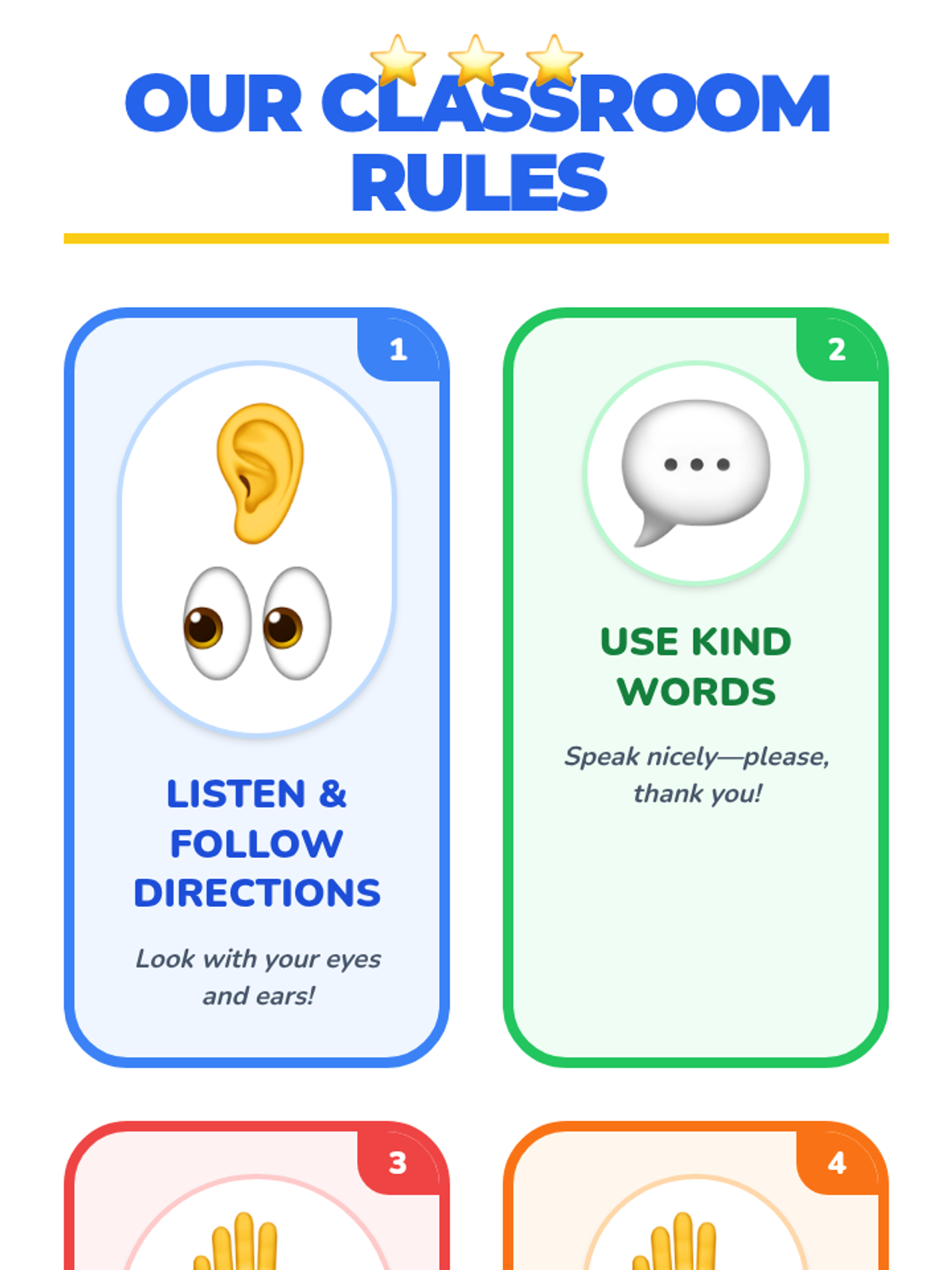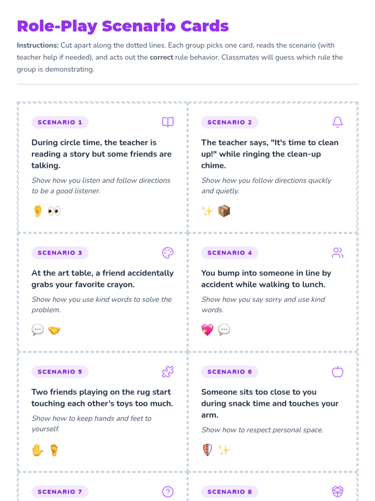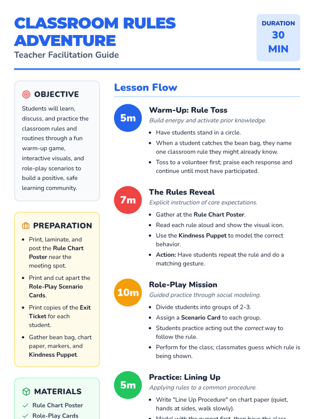 A 30-minute kindergarten lesson focused on learning and practicing classroom rules through games, role-play, and visual aids to build a safe and respectful learning environment.