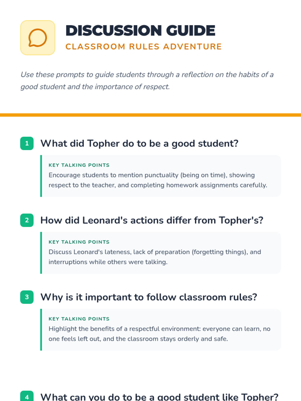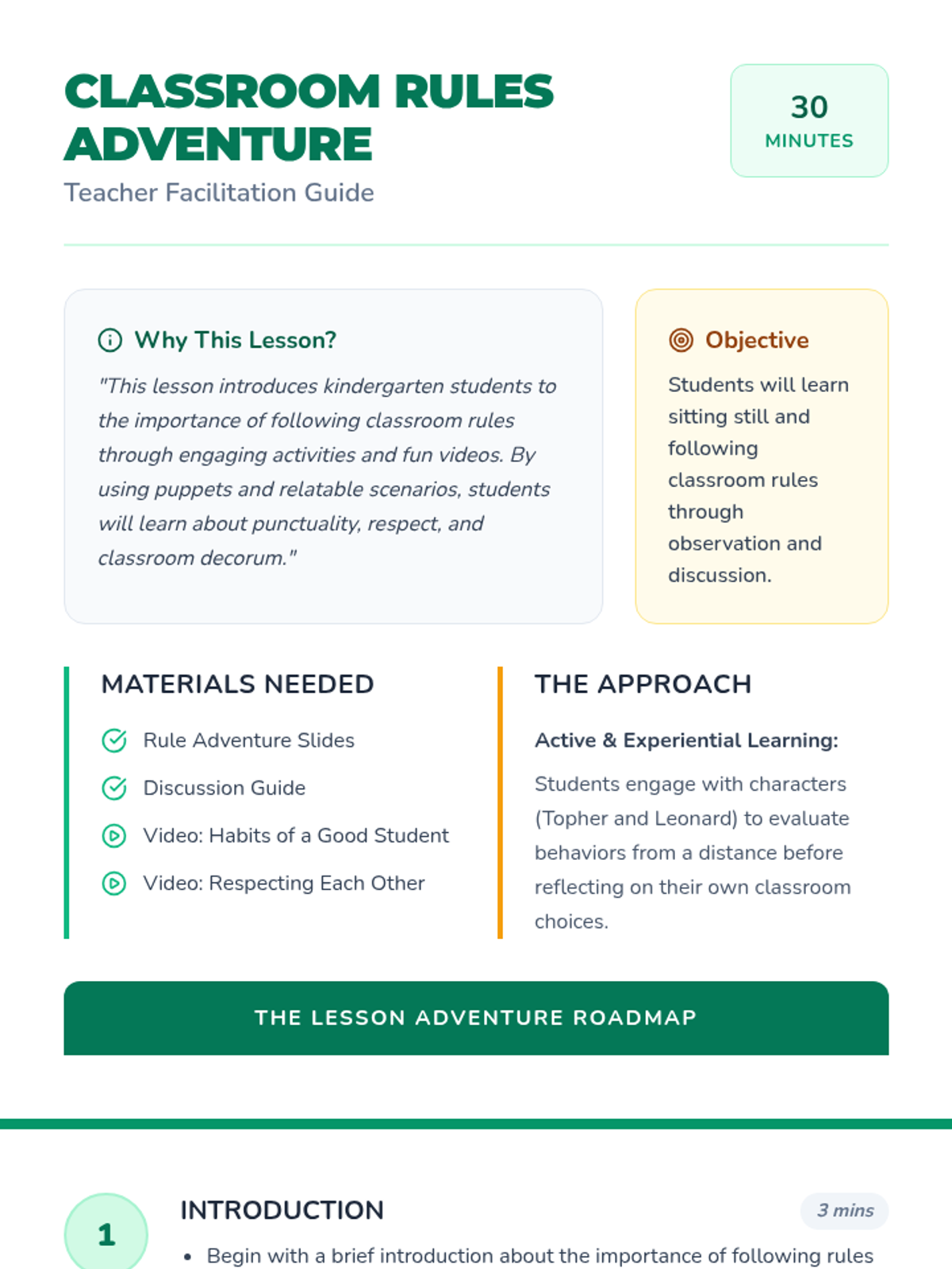 An engaging kindergarten lesson that uses puppet-based videos and relatable scenarios to teach classroom rules, punctuality, and respect. Students embark on a 'Rule Adventure' to learn the habits of a good student.