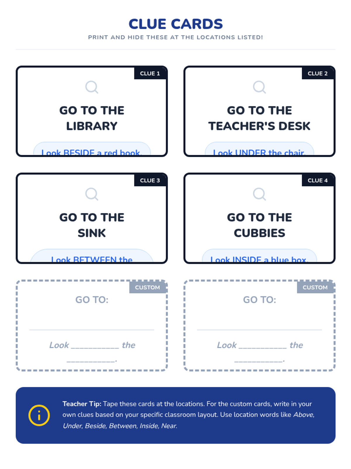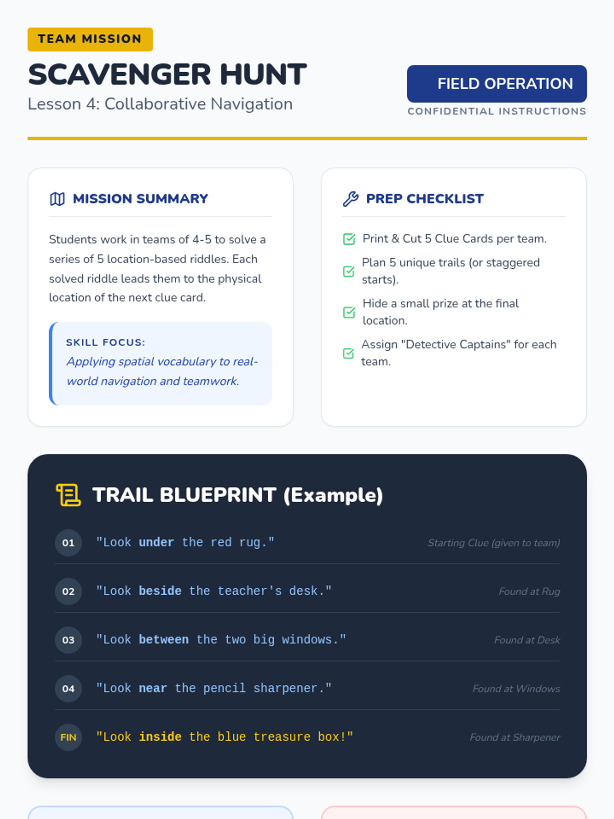 Working in teams, students follow a trail of clues. Each clue leads to a location where they find the next clue, eventually leading to a prize. Students must interpret spatial clues to navigate the room.