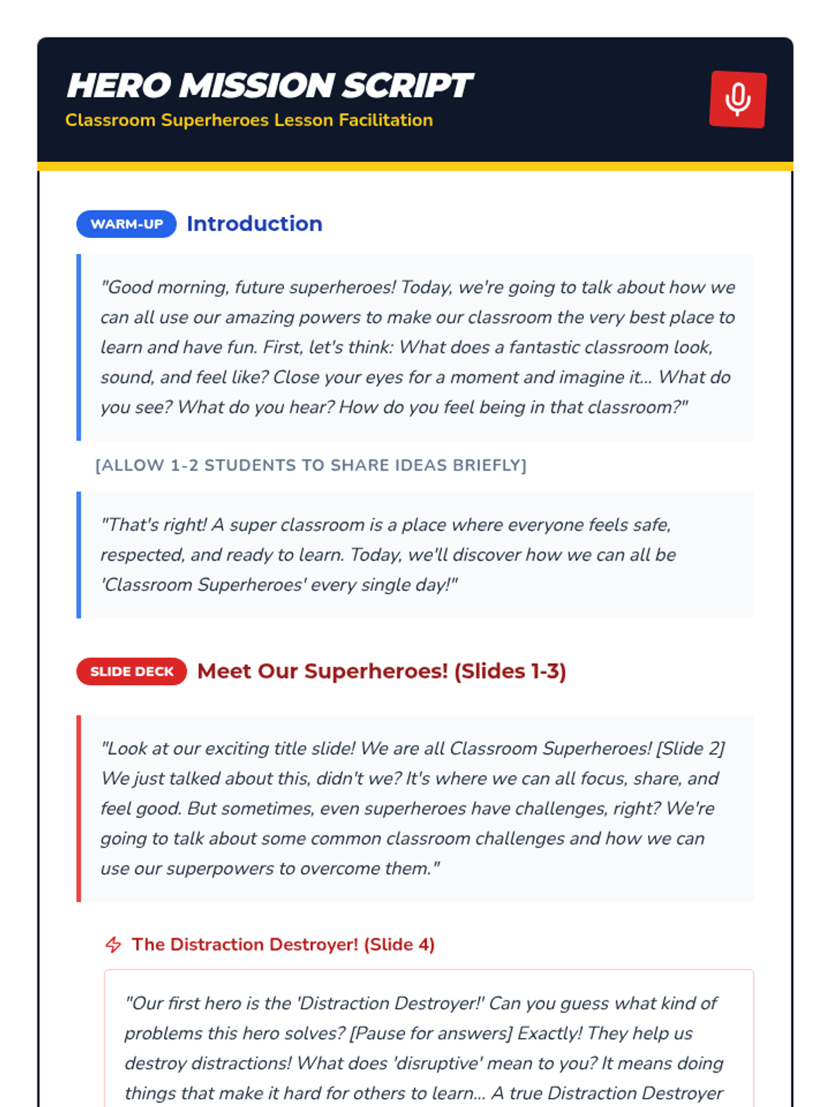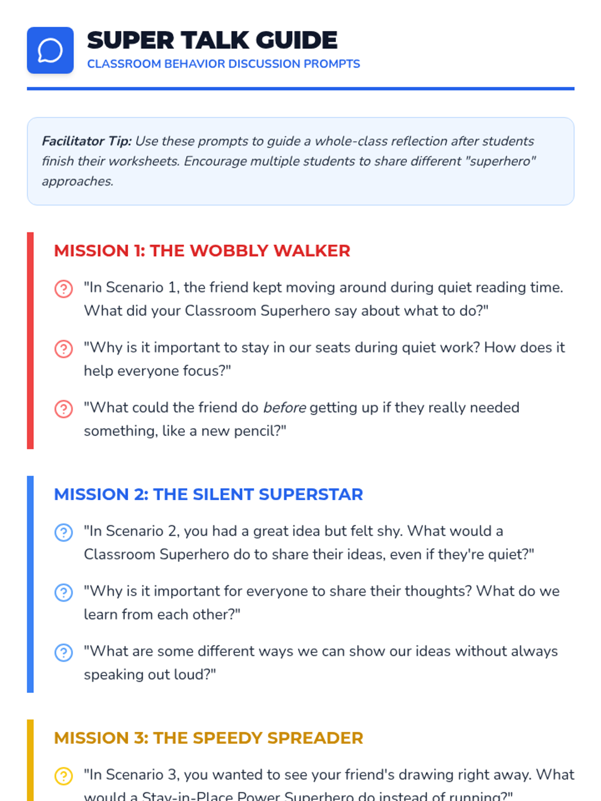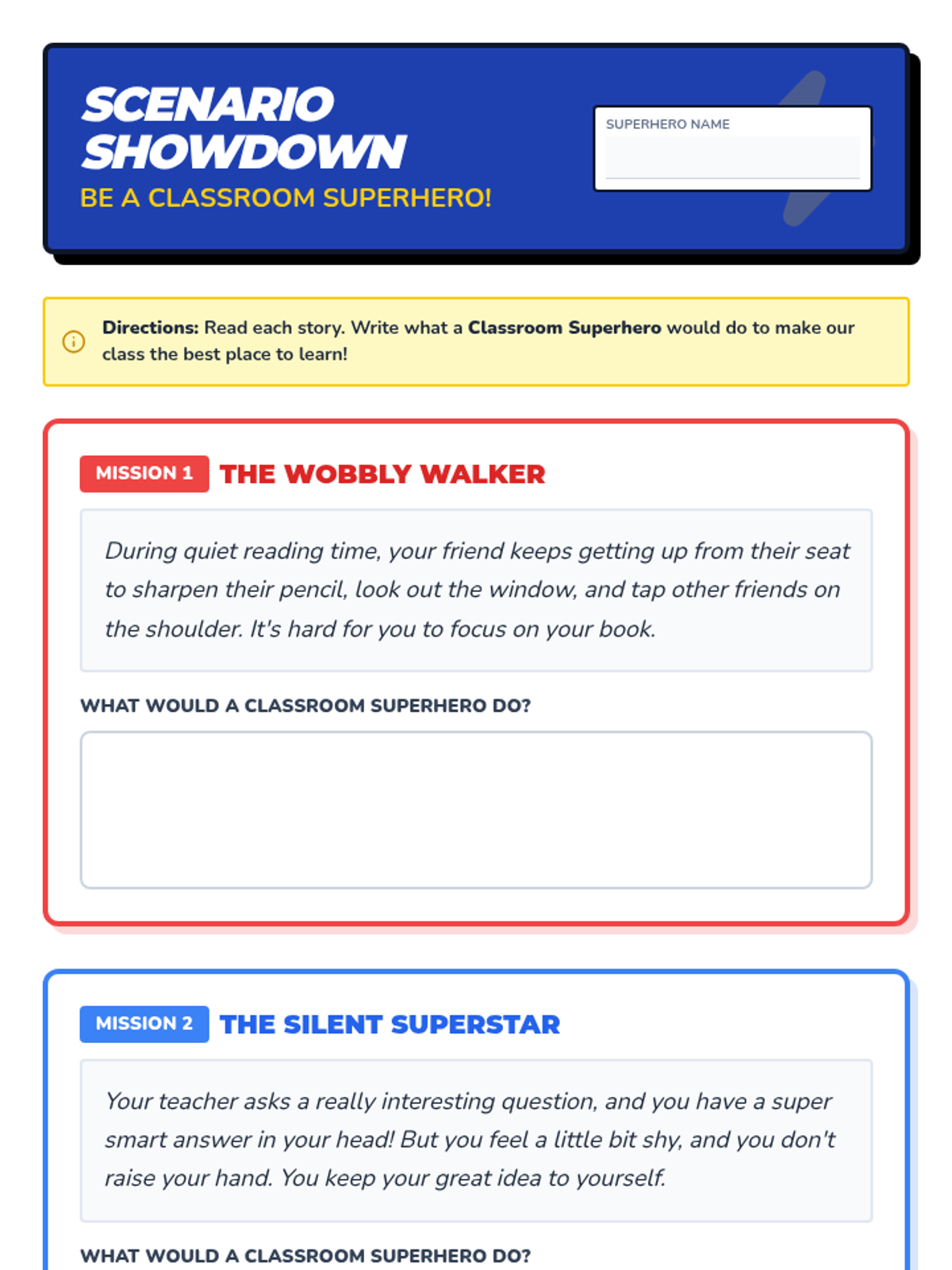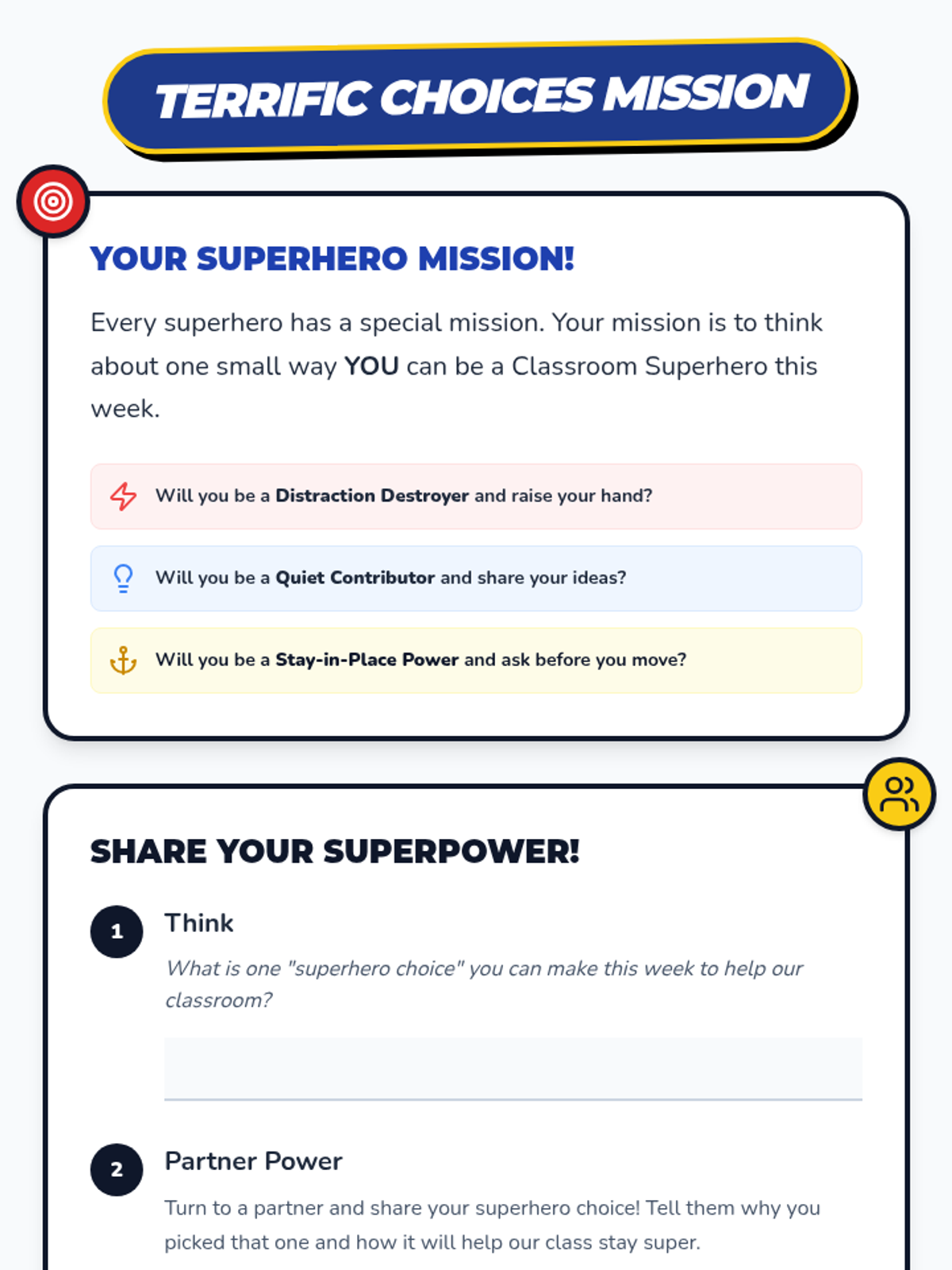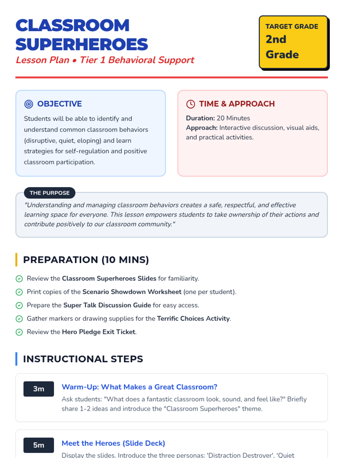 This 20-minute Tier 1 lesson helps 2nd-grade students understand and manage disruptive behaviors, quiet participation, and eloping to foster a positive and productive learning environment using a fun superhero theme.