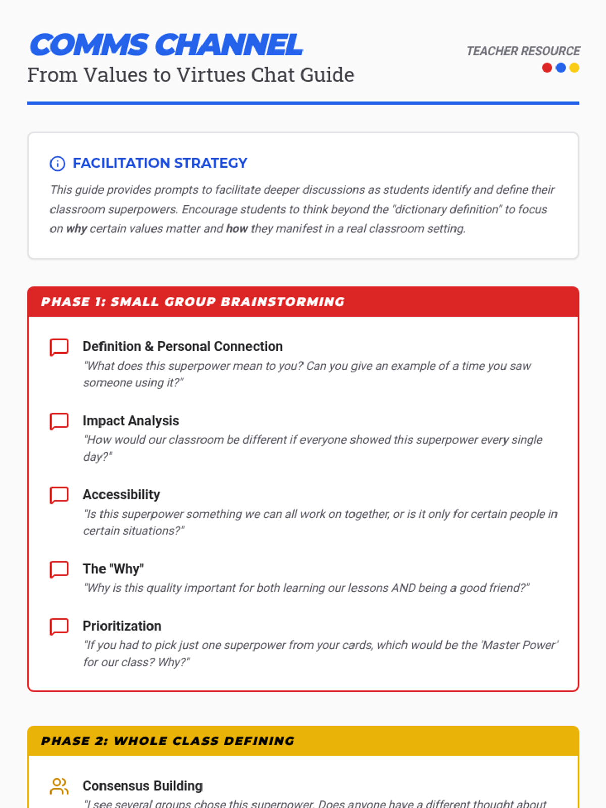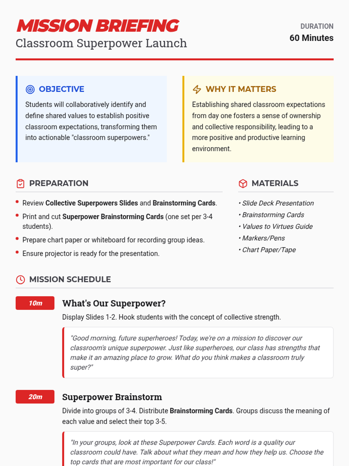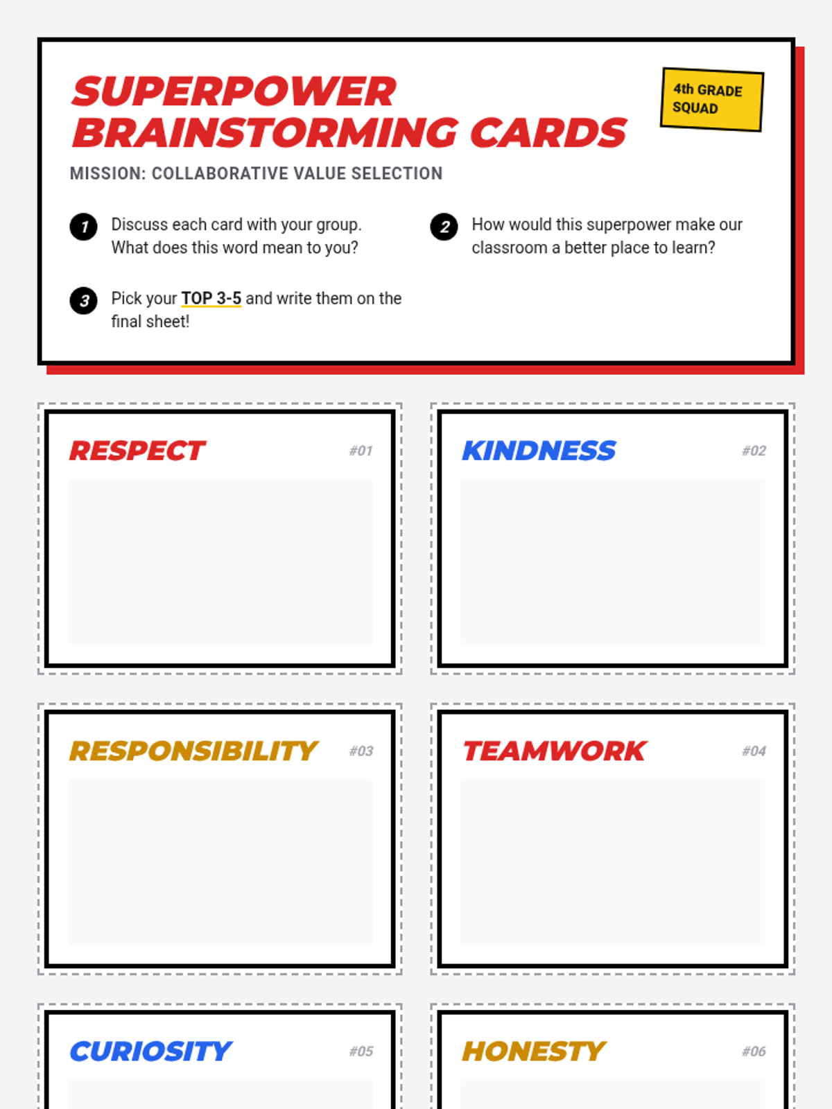 Students collaboratively identify and define shared values to establish positive classroom expectations, transforming them into actionable 'classroom superpowers' through group brainstorming and presentation.