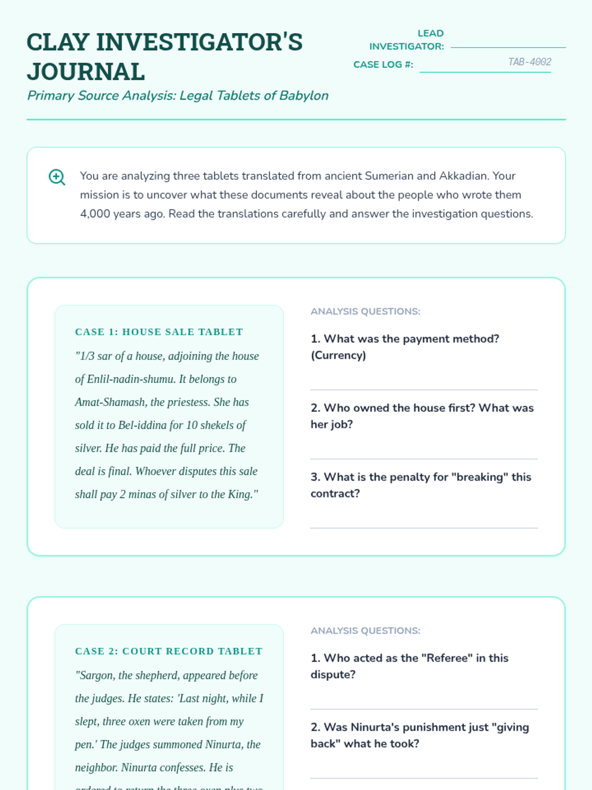 By analyzing primary source translations of ancient contracts, students uncover the daily lives of Mesopotamians. They investigate how writing allowed for legal systems, complex trade, and social order.