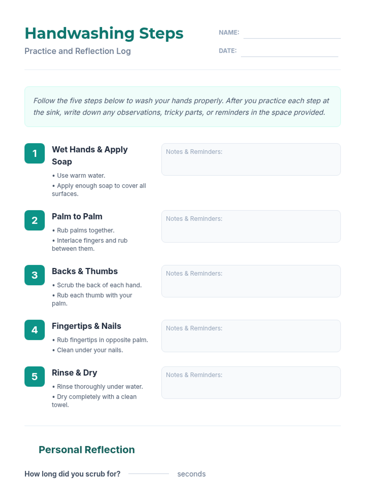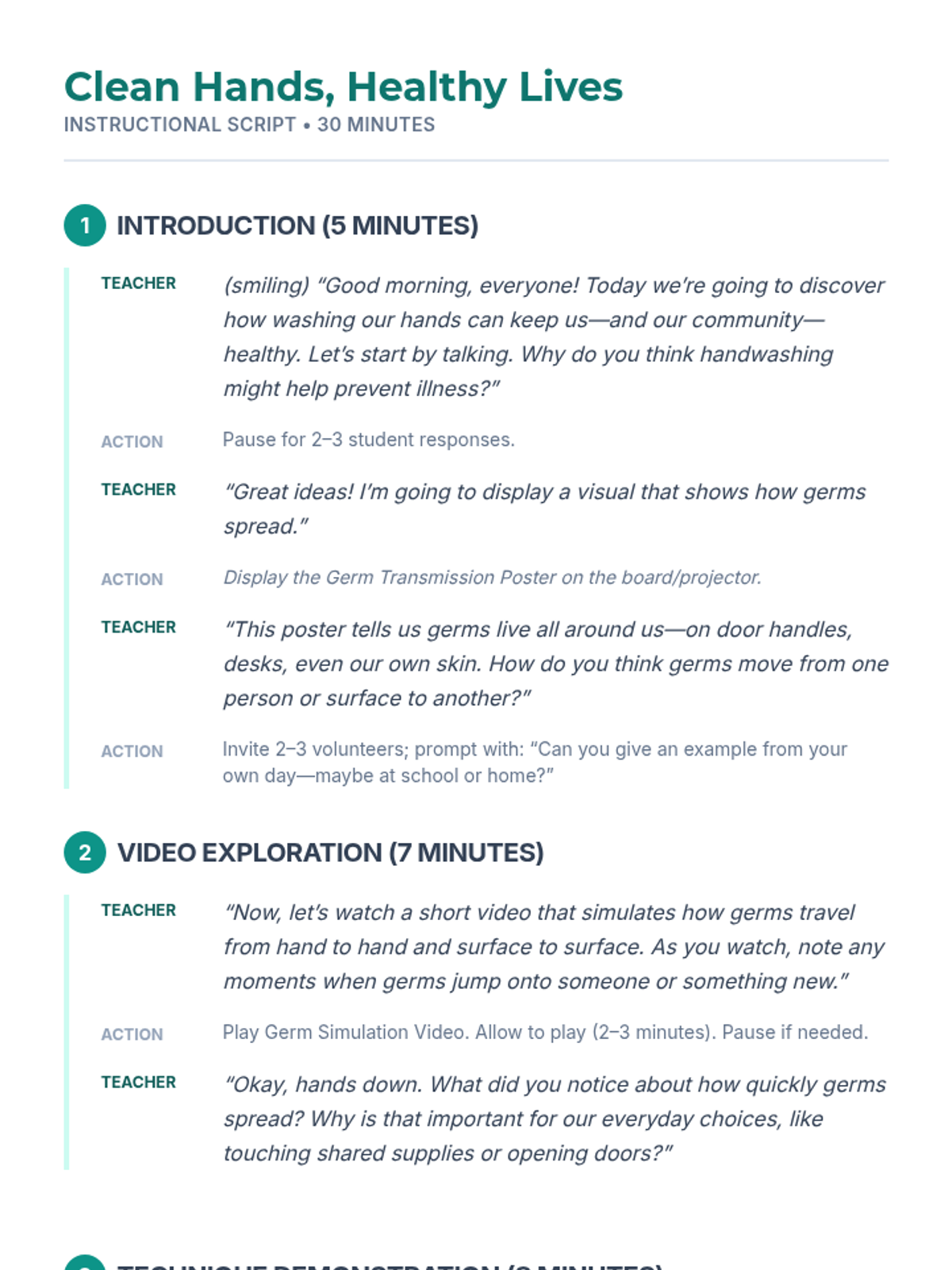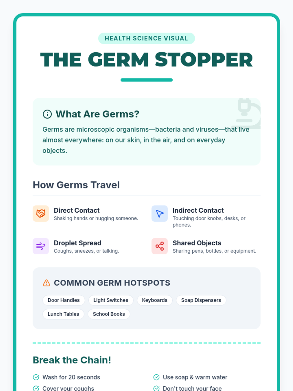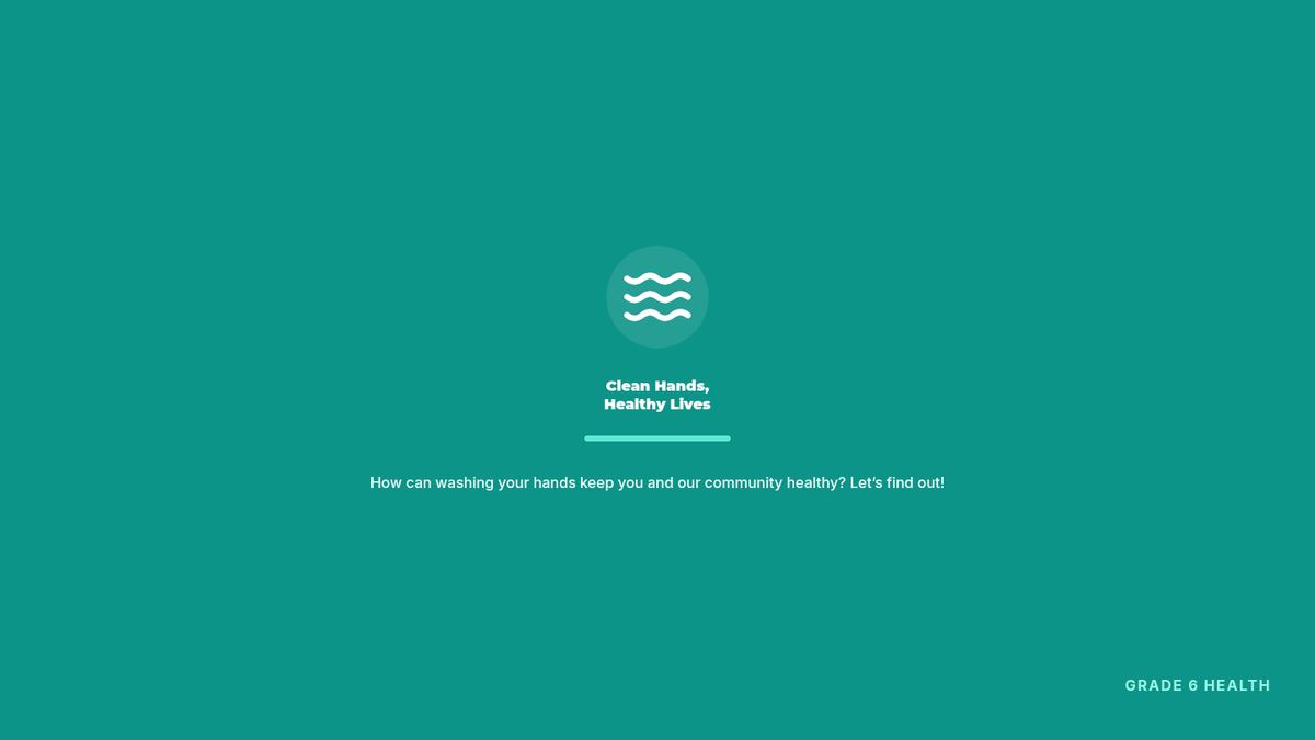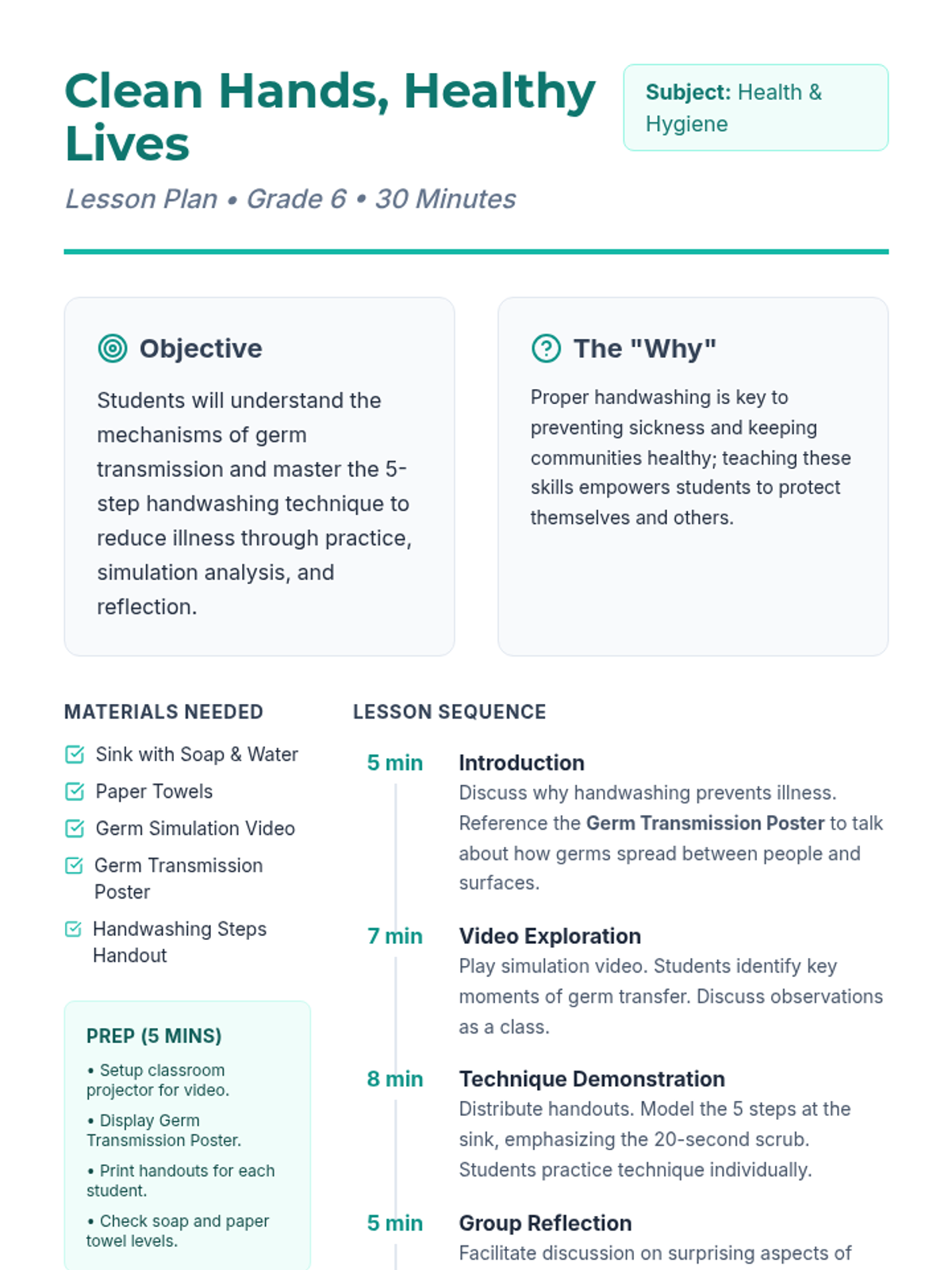A 30-minute health lesson for 6th graders focusing on the science of germ transmission and the 5-step handwashing technique to promote personal and community hygiene.
