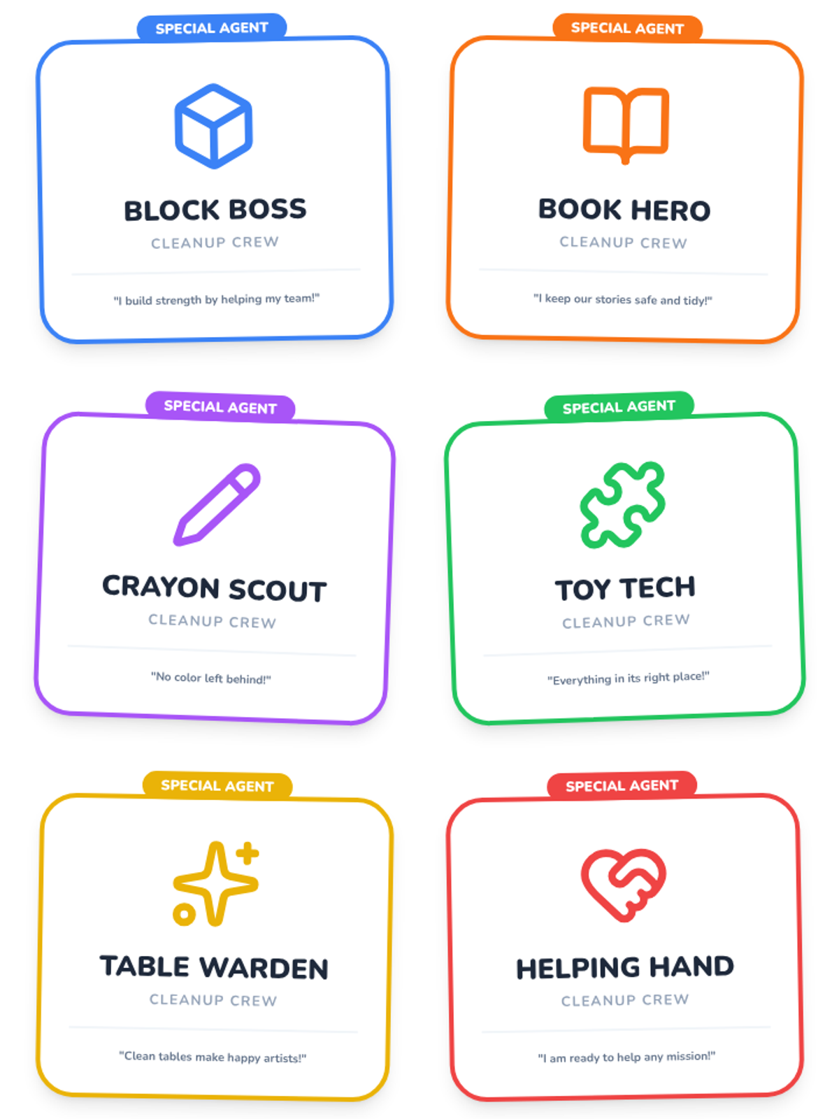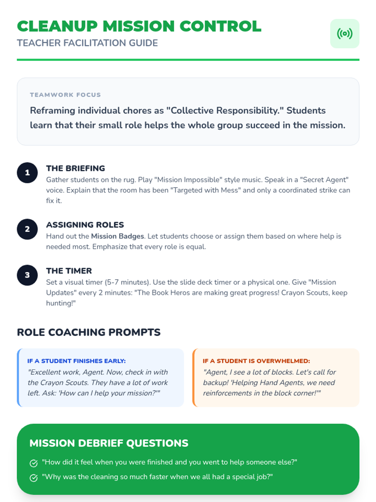 Cleanup time is gamified into a 'mission' where students have specific roles, reframing a chore as a collective community contribution.