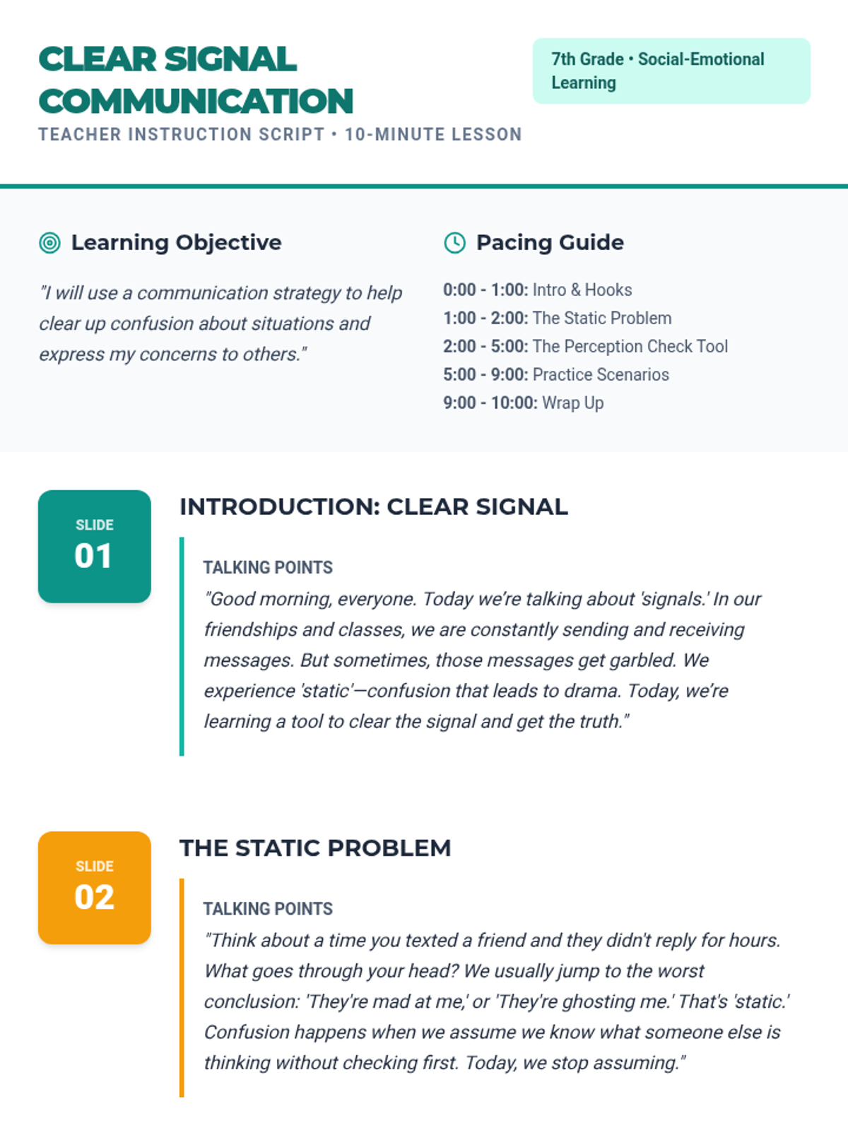 A 10-minute lesson for 7th graders focused on using 'Perception Checking' to clear up confusion and express concerns effectively. Includes a slide deck and a teacher script.