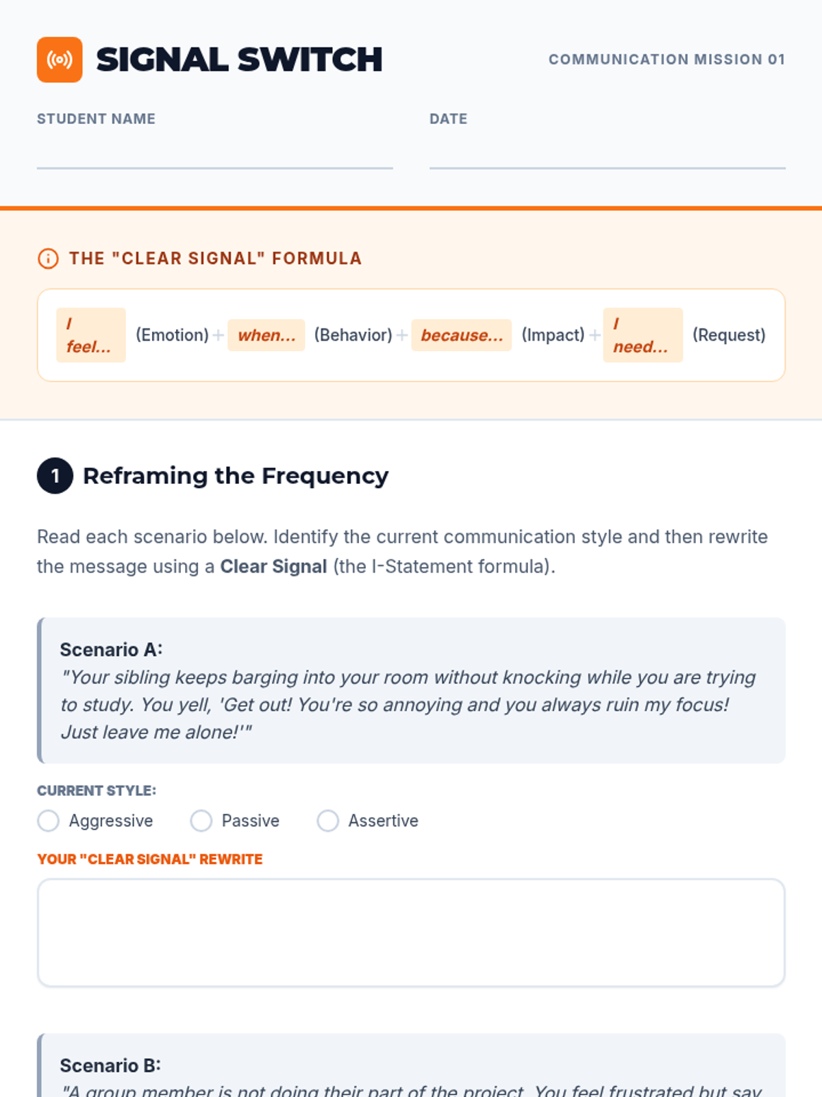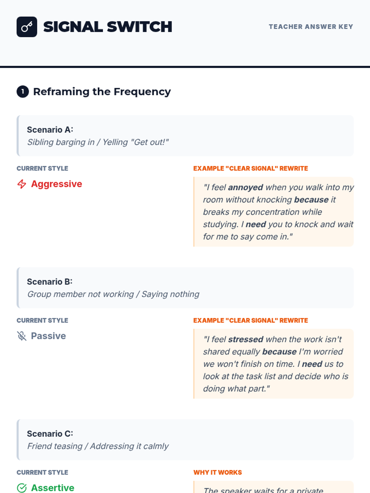 This lesson focuses on helping students identify and express their needs and wants using assertive communication and "I" statements. Students will analyze different communication styles and practice reframing messages for clarity and respect.