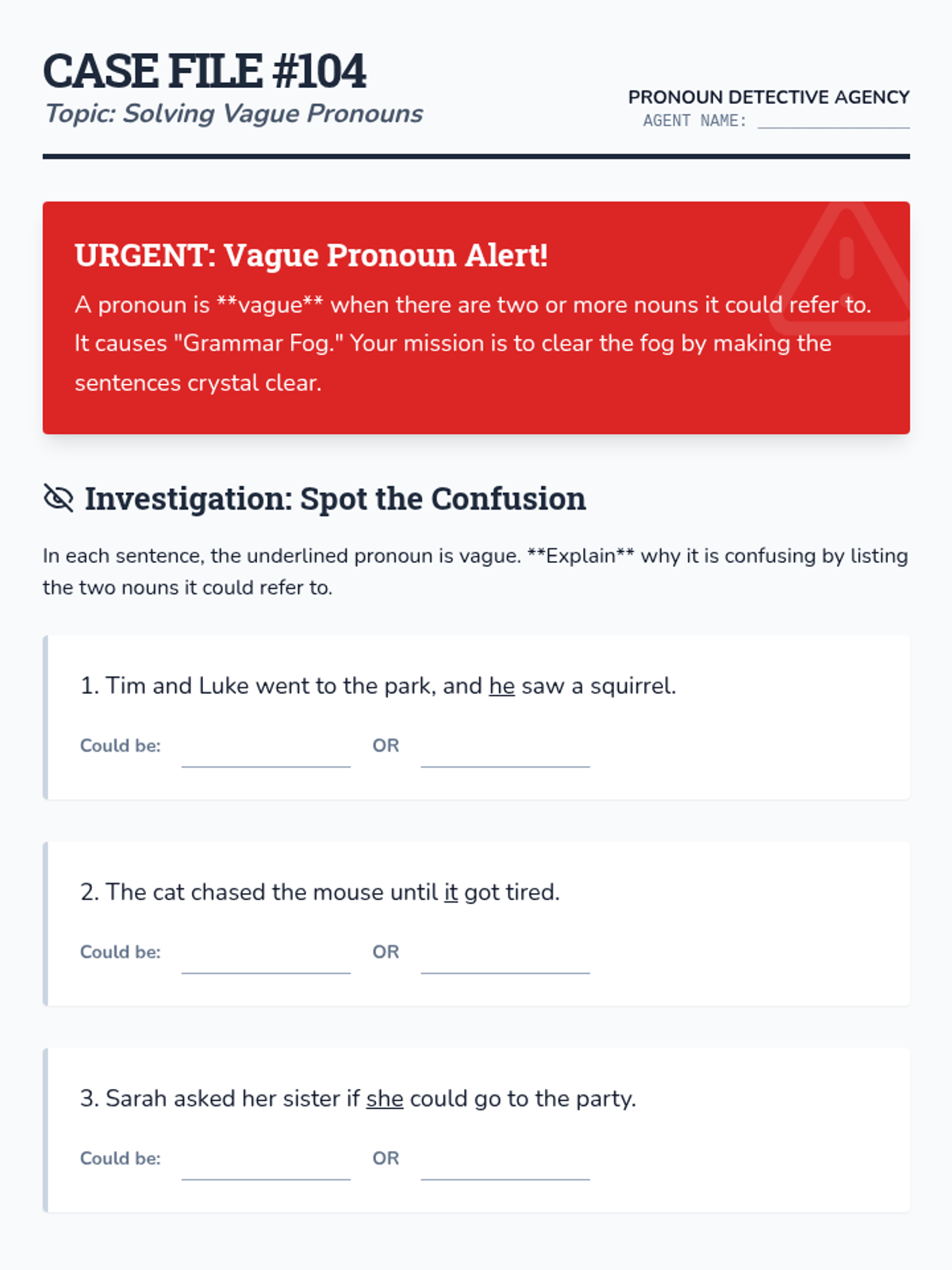 Students identify and fix vague pronouns that cause confusion, learning to rewrite sentences for absolute clarity.