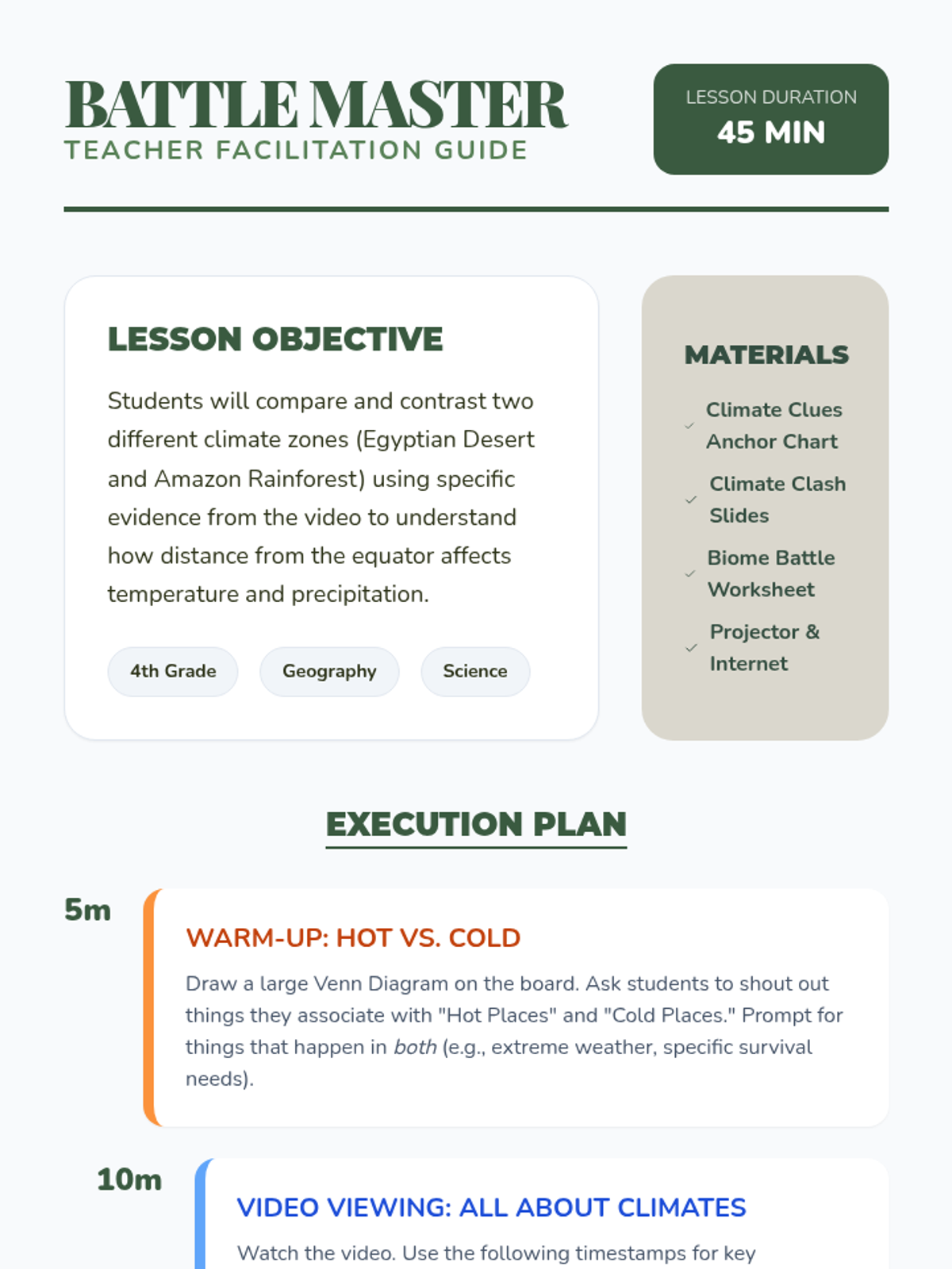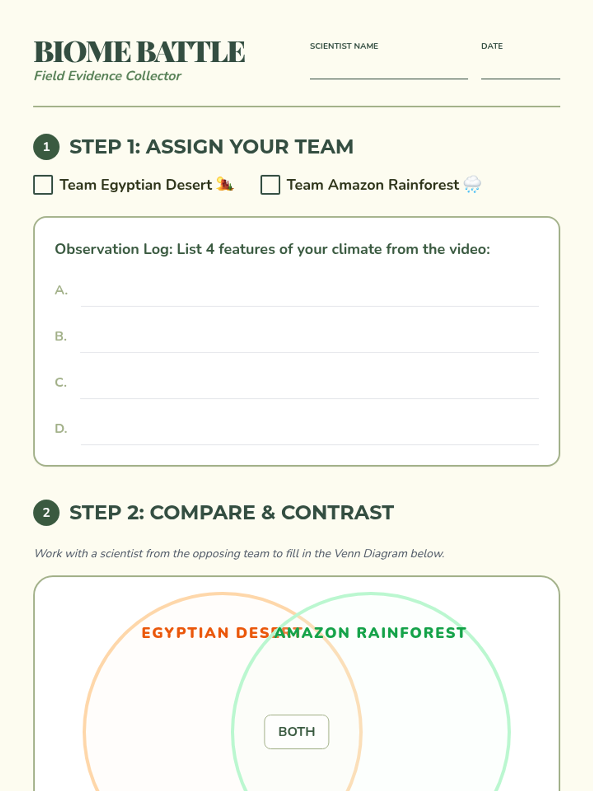 A 4th-grade geography lesson where students compare the Egyptian Desert and the Amazon Rainforest using video evidence to understand climate factors and survival.